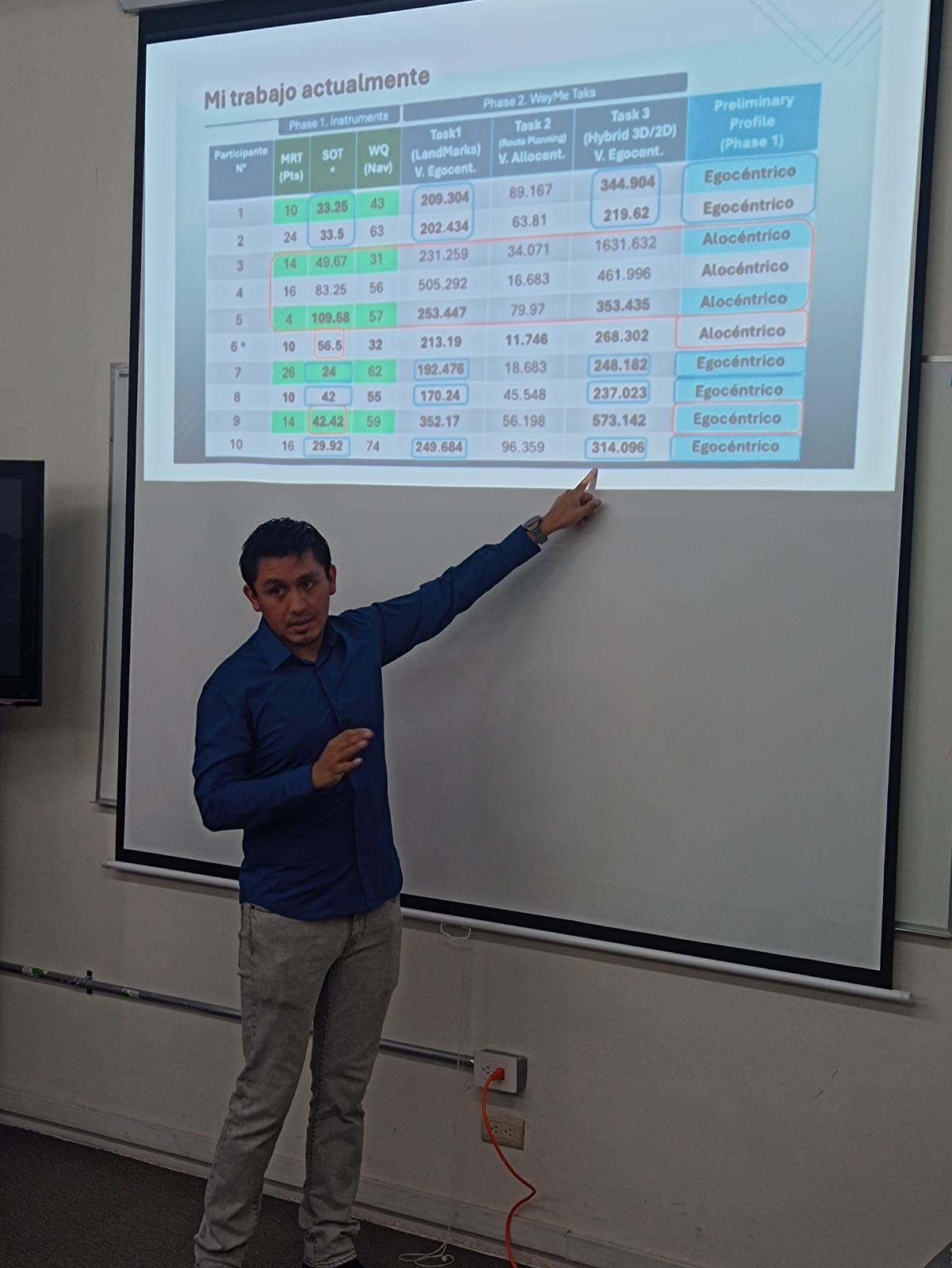 Durante su ponencia, el Mtro. Alejandro Najani León Gómez presentó los avances de su investigación, mostrando resultados sobre perfiles egocéntricos y alocéntricos en tareas de navegación peatonal, destacando la relación entre habilidades cognitivas y desempeño espacial.