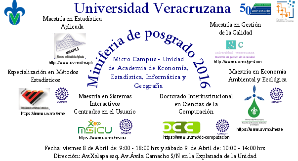 La Unidad de Academia de Economía, Estadística, Informática y Geografía tiene el honor de invitar a usted, a la Miniferia de Posgrado 2016 que se llevará a cabo el día viernes 8 de abril del presente, en horario de 9:00 – 18:00 hrs. y el día sábado 9 de abril en horario de 10:00 – 14:00 hrs. en la Explanada de la Unidad.
