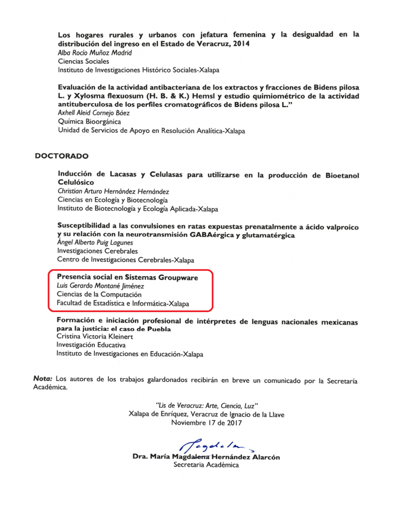 Luis Gerardo Montané Jiménez, egresado del Doctorado en Ciencias de la Computación de la Facultad de Estadística e Informática (FEI), fue galardonado con el Premio “Arte, Ciencia, Luz” al mejor trabajo recepcional 2017 a nivel Doctorado en el área Económico-Administrativa por su tesis “Presencia social en Sistemas Groupware”, bajo la dirección del Dr. Edgard Benítez y la Dra. Carmen Mezura, ambos PTCs de la FEI. La ceremonia de entrega de reconocimiento se llevará a cabo el próximo día 8 de diciembre a las 12hrs en el auditorio del Museo de Antropología de Xalapa.
