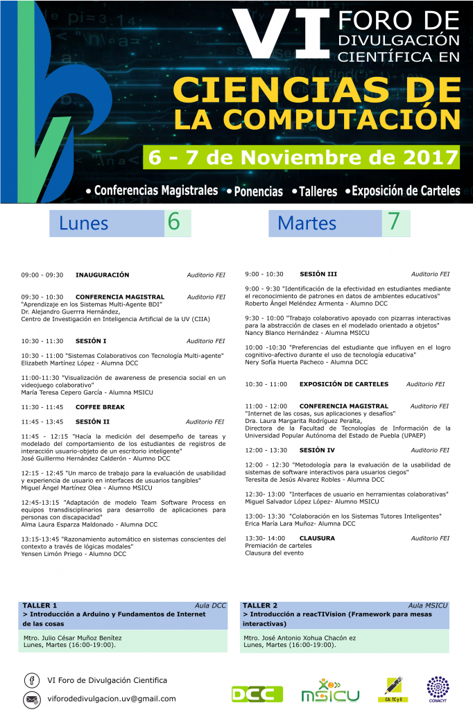 El Doctorado en Ciencias de la Computación – DCC, la Maestría en Sistemas Interactivos Centrados en el Usuario – MSICU y el CA: Tecnología Computacional y Educativa, tienen el honor de invitarlos al VI Foro de Divulgación Científica en Ciencias de la Computación, que tendrá lugar los días 6 y 7 de Noviembre del año en curso en el auditorio de la Facultad de Estadística e Informática.