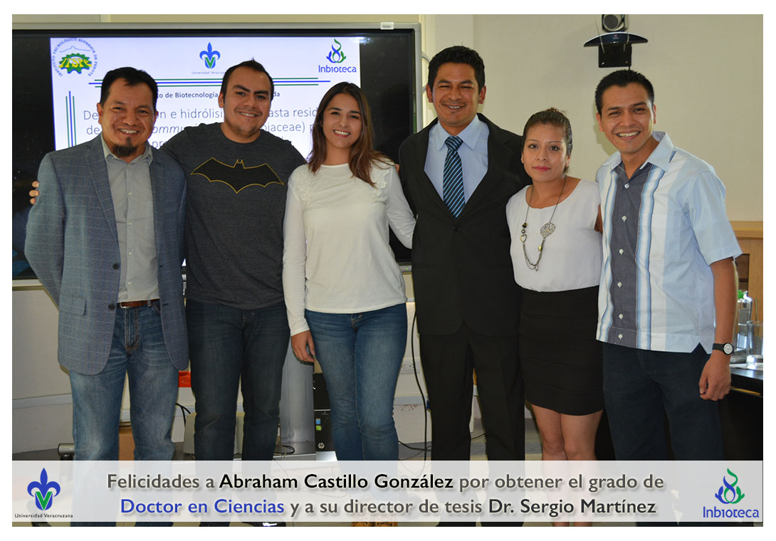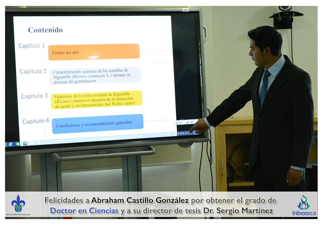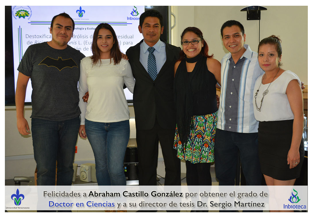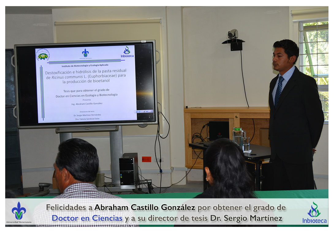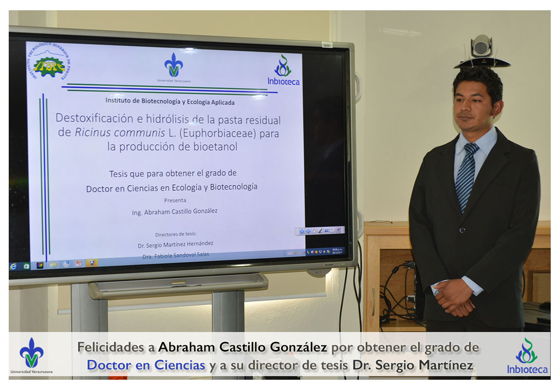05 de Diciembrede 2017.- En el Aula de Usos Múltiples del INBIOTECA a las 12:00 horas, se realizó el examen de grado de Doctorado con la defensa pública de la tesis titulada: "Destoxificación e hidrólisis de la pasta residual de Ricinus communis L. (Euphorbiaceae) para la producción de etanol".
