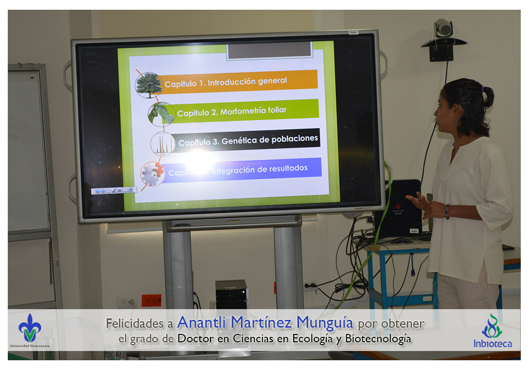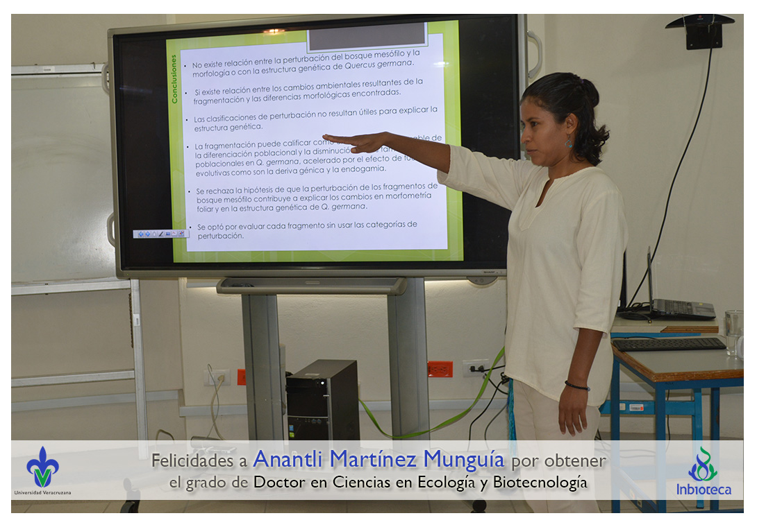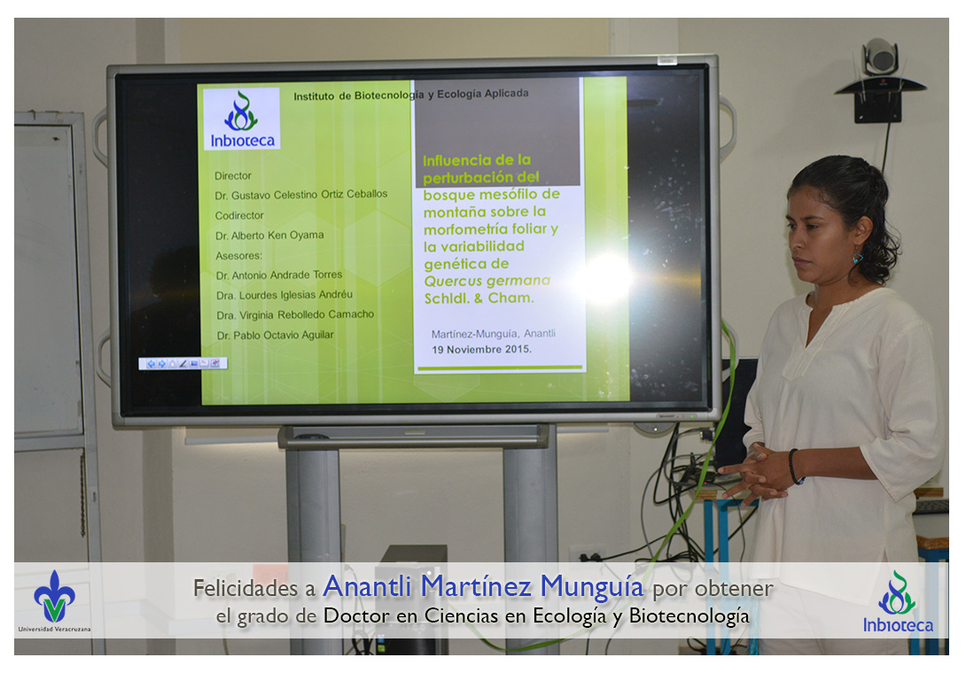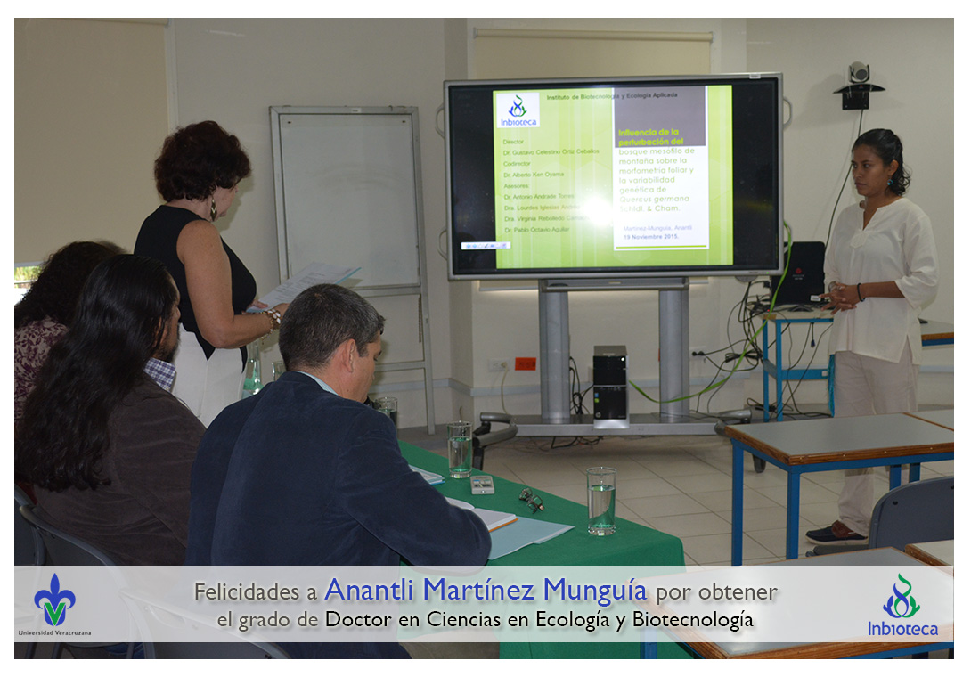 19 de Noviembre de 2015.- En el aula de usos multiples del Instituto de Biotecnología y Ecología Aplicada INBIOTECA a las 09:00 horas, se realizó el examen de grado del DCEB con la tesis titulada "Influencia de la perturbación del bosque mesófilo de montaña sobre la morfometría foliar de Quercus germana Schldl. & Cham.".