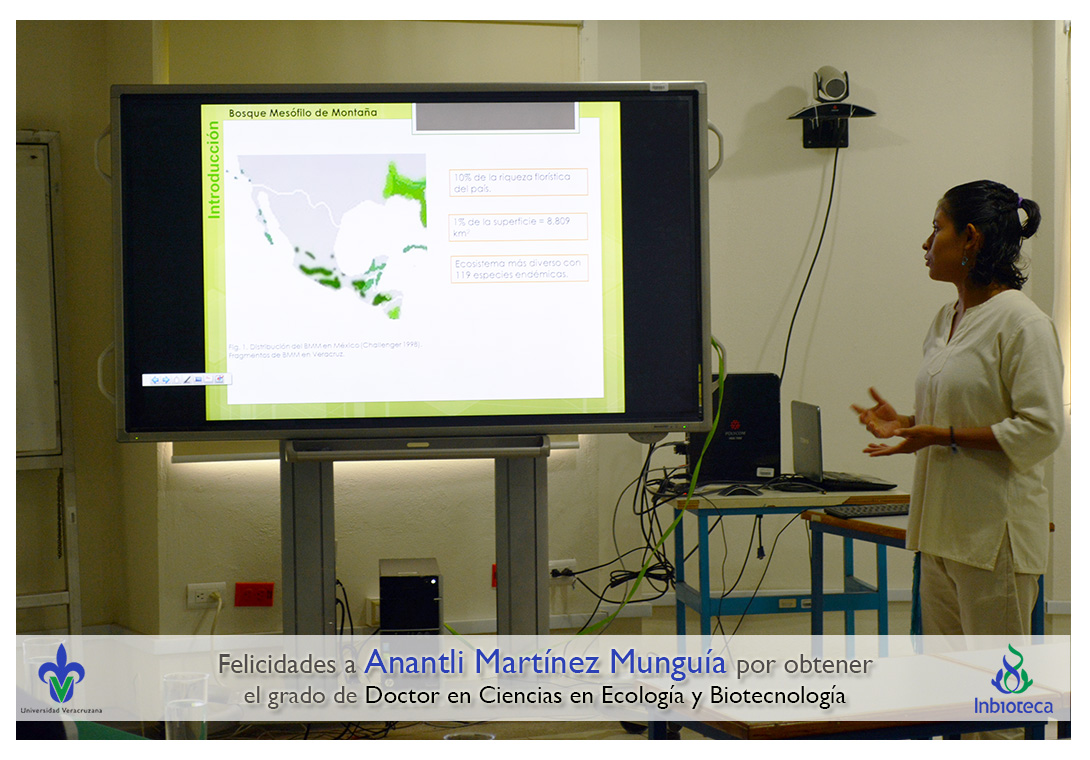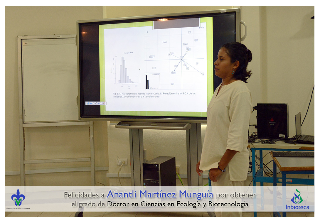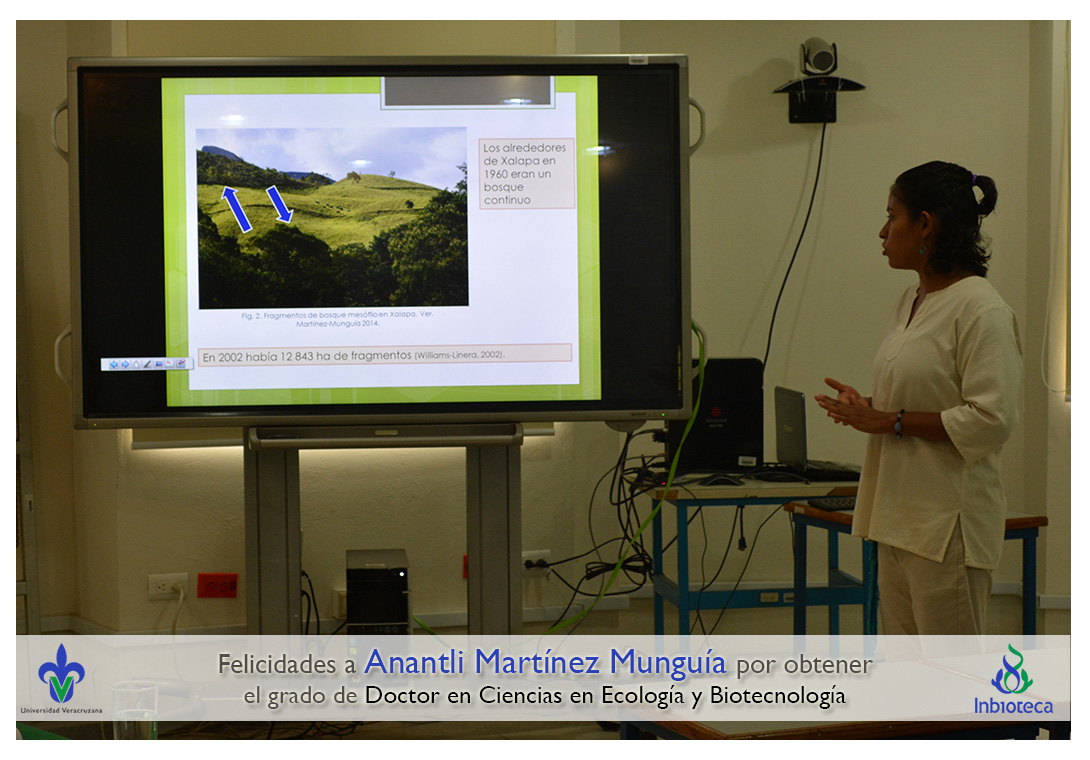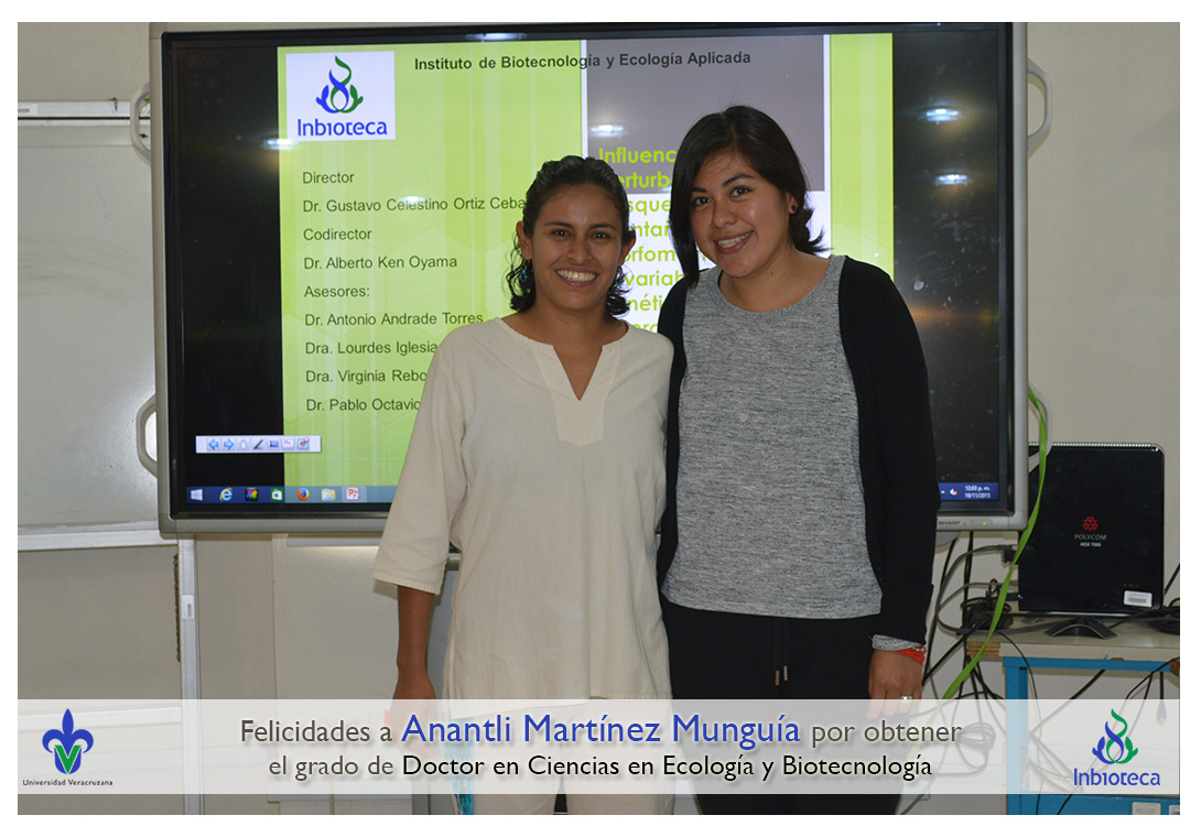 19 de Noviembre de 2015.- En el aula de usos multiples del Instituto de Biotecnología y Ecología Aplicada INBIOTECA a las 09:00 horas, se realizó el examen de grado del DCEB con la tesis titulada "Influencia de la perturbación del bosque mesófilo de montaña sobre la morfometría foliar de Quercus germana Schldl. & Cham.".