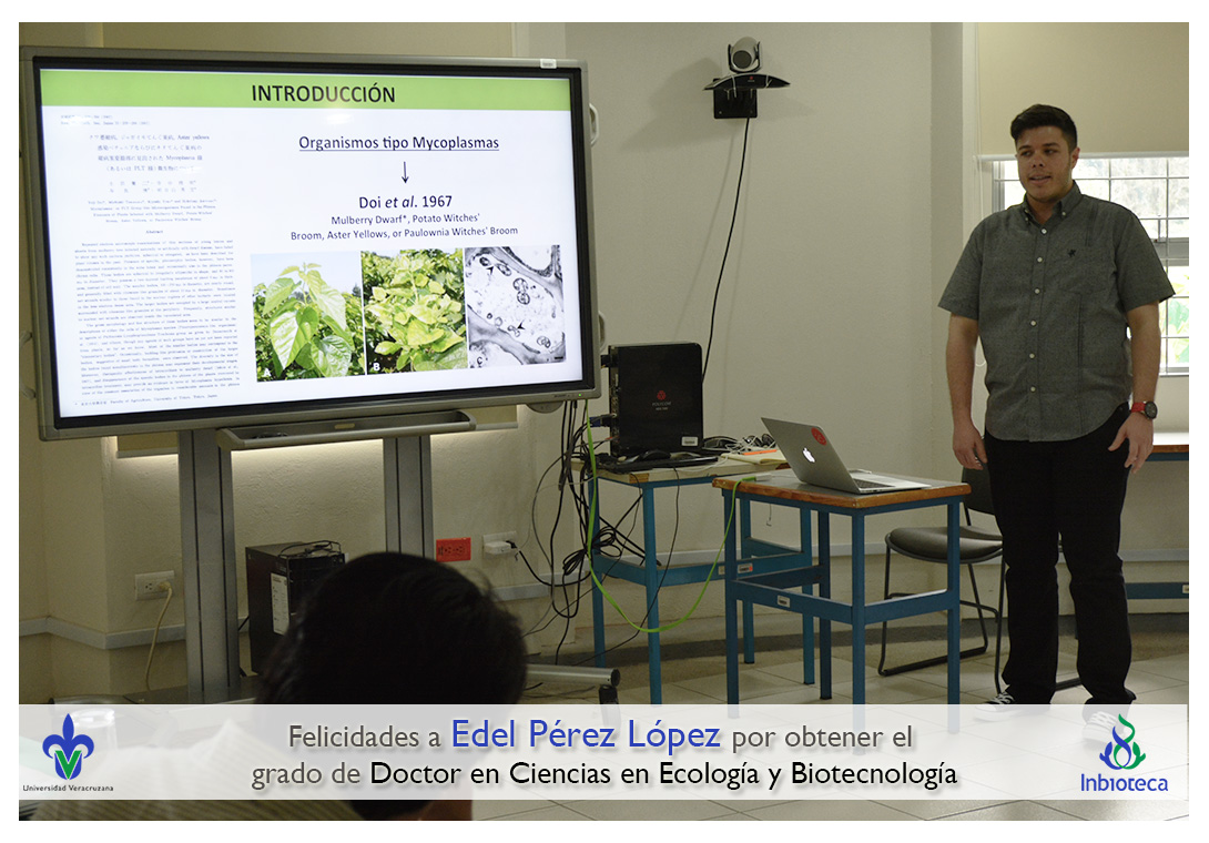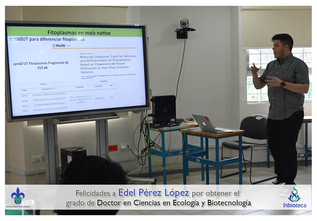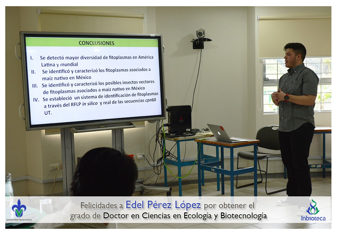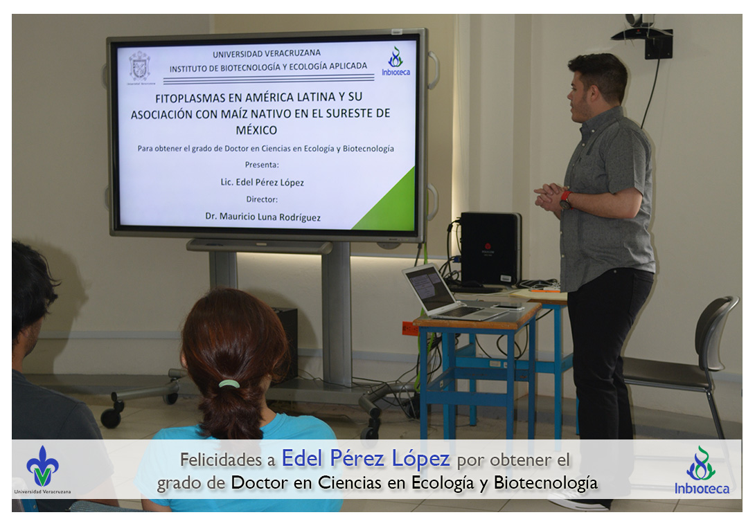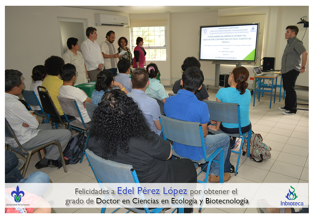16 de marzo de 2016.- En el aula de usos multiples del Instituto de Biotecnología y Ecología Aplicada INBIOTECA a las 15:00 horas, se realizó el examen de grado del DCEB con la tesis titulada "Fitoplasmas en América Latina y su asociación con maíz nativo en el sureste de México".