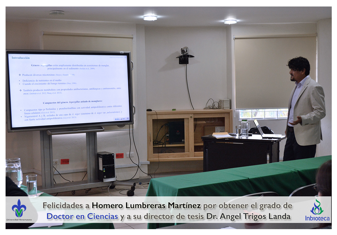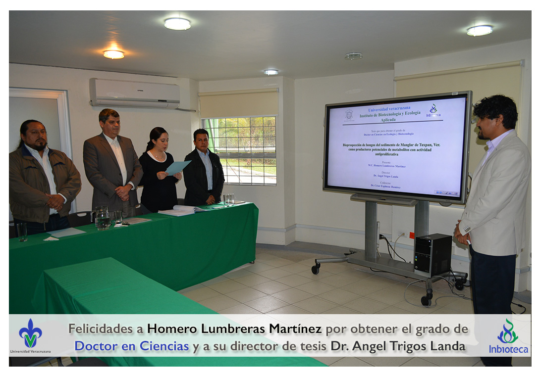 27 de Enero de 2017.- En el Aula de Usos Múltiples del INBIOTECA a las 10:00 horas, se realizó el examen de grado de Doctorado con la defensa pública de la tesis titulada: "Bioprospección de hongos del sedimento de Manglar en Tuxpan Ver. como productores potenciales de metabolitos con actividad antiproliferativa".