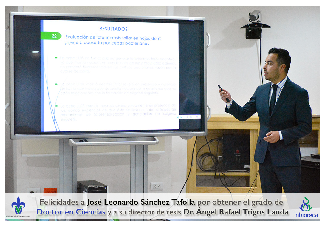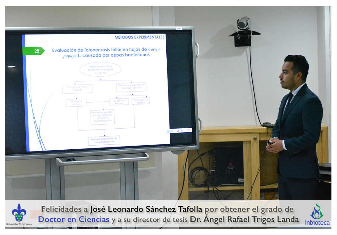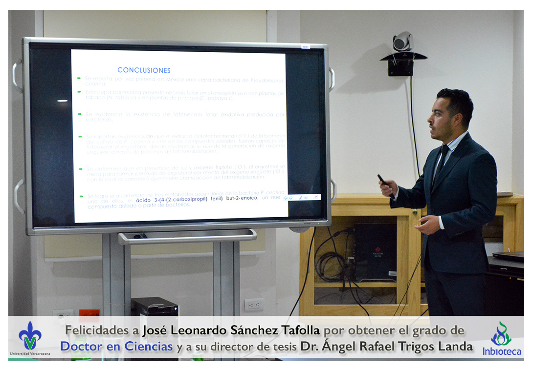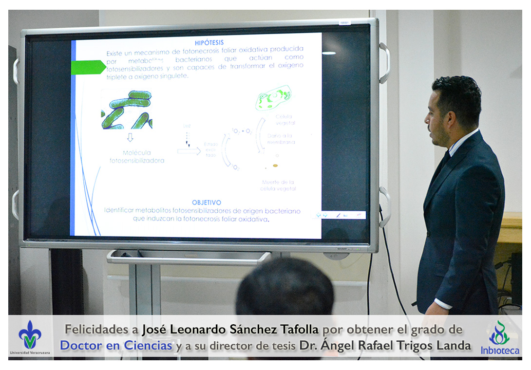 14 de diciembre de 2018.- En el Aula de Usos Múltiples del INBIOTECA a las 17:00 horas, se realizó el examen de grado de Doctorado con la defensa pública de la tesis intitulada: "Fotonecrosis foliar oxidativa causada por Pseudomonas cedrina".