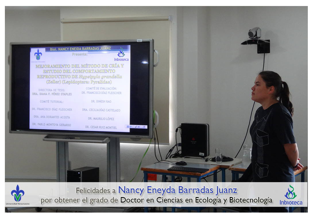 28 de enero de 2016.- En el aula de usos multiples del Instituto de Biotecnología y Ecología Aplicada INBIOTECA a las 12:00 horas, se realizó el examen de grado del DCEB con la tesis titulada "Mejoramiento del método de cría y estudio del comportamiento reproductivo de Hypsipyla grandella (Lepidoptera: Pyralidae)".