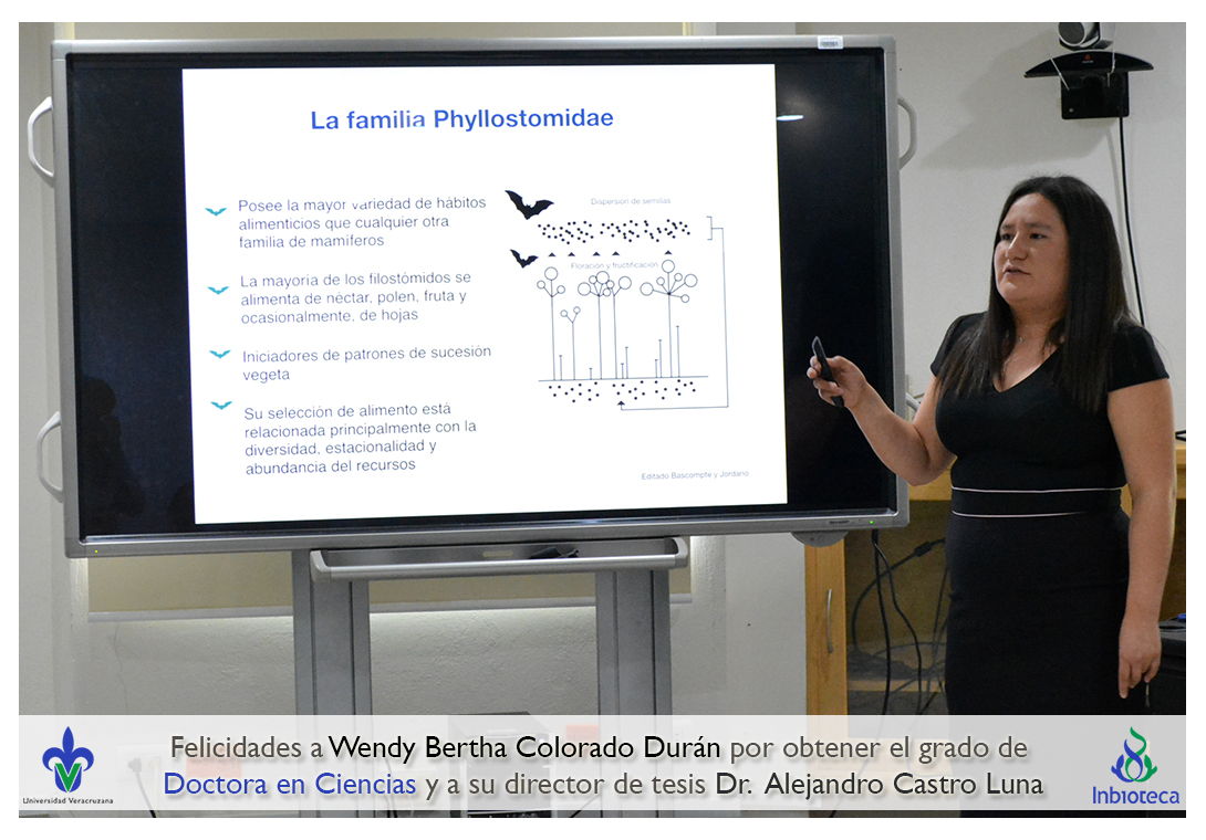 28 de enero de 2020.- En el Aula de Usos Múltiples del INBIOTECA a las 13:00 horas, se realizó el examen de grado de Doctorado con la defensa pública de la tesis titulada: "Dieta y el patrón de interacciones murciélago-planta en paisajes suburbanos y fragmentados de bosque mesófilo de montaña".