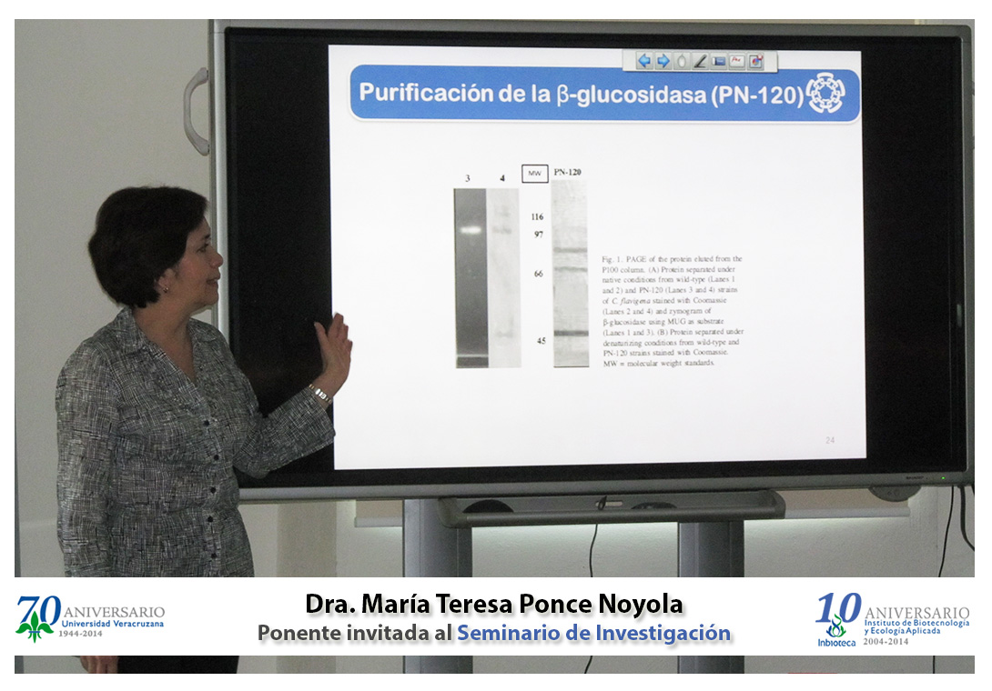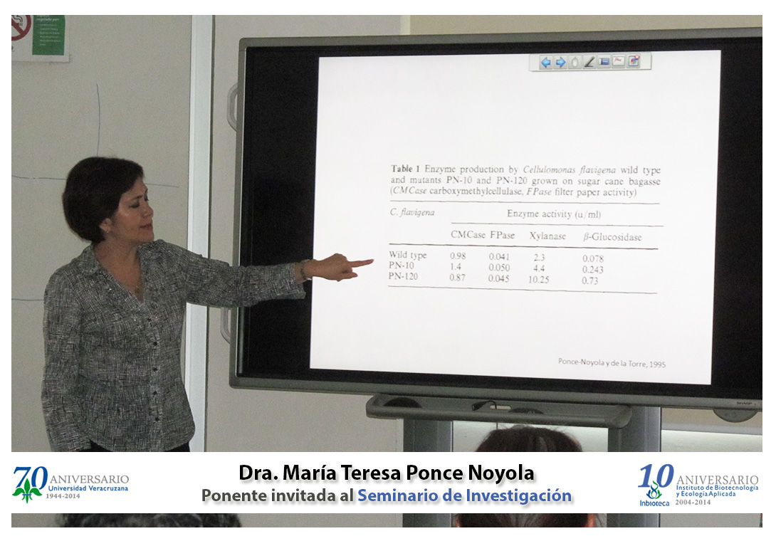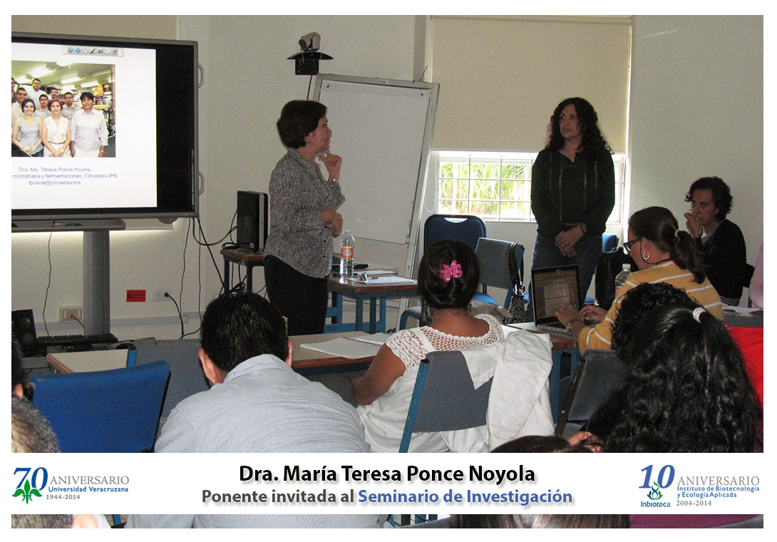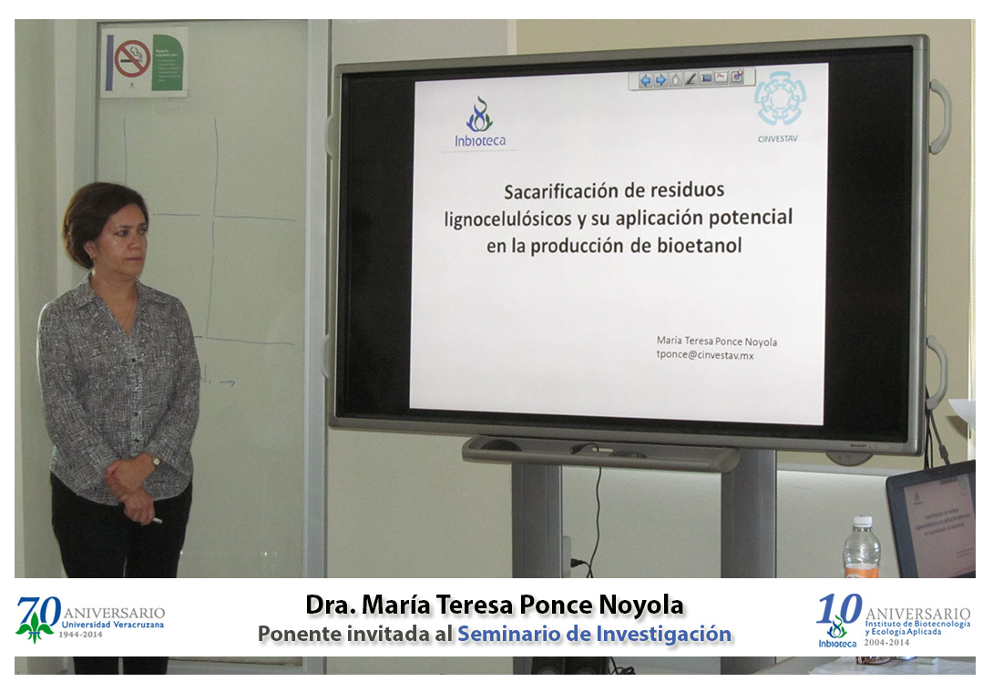 La profesora invitada fué la Dra. María Teresa Ponce Noyola, Investigadora tiempo completo del Cinvestav-IPN, Ciudad de México, quien impartió la conferencia "Sacarificación de residuos lignocelulósicos y su aplicación potencial en la producción de bioetanol".