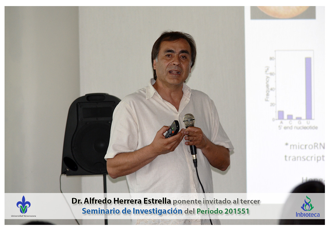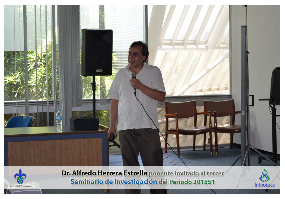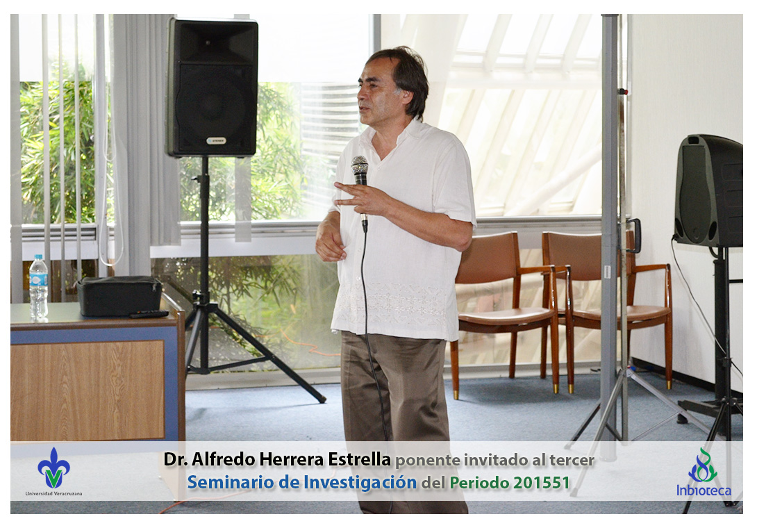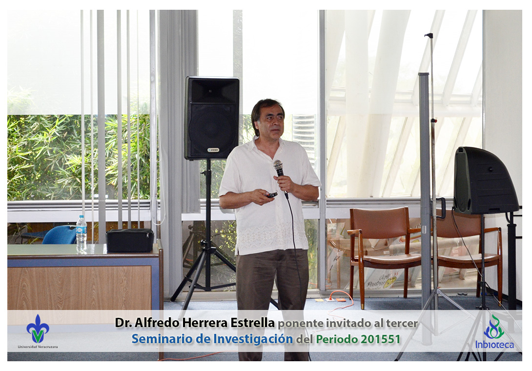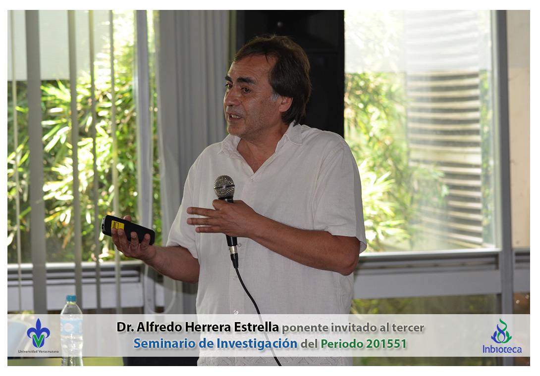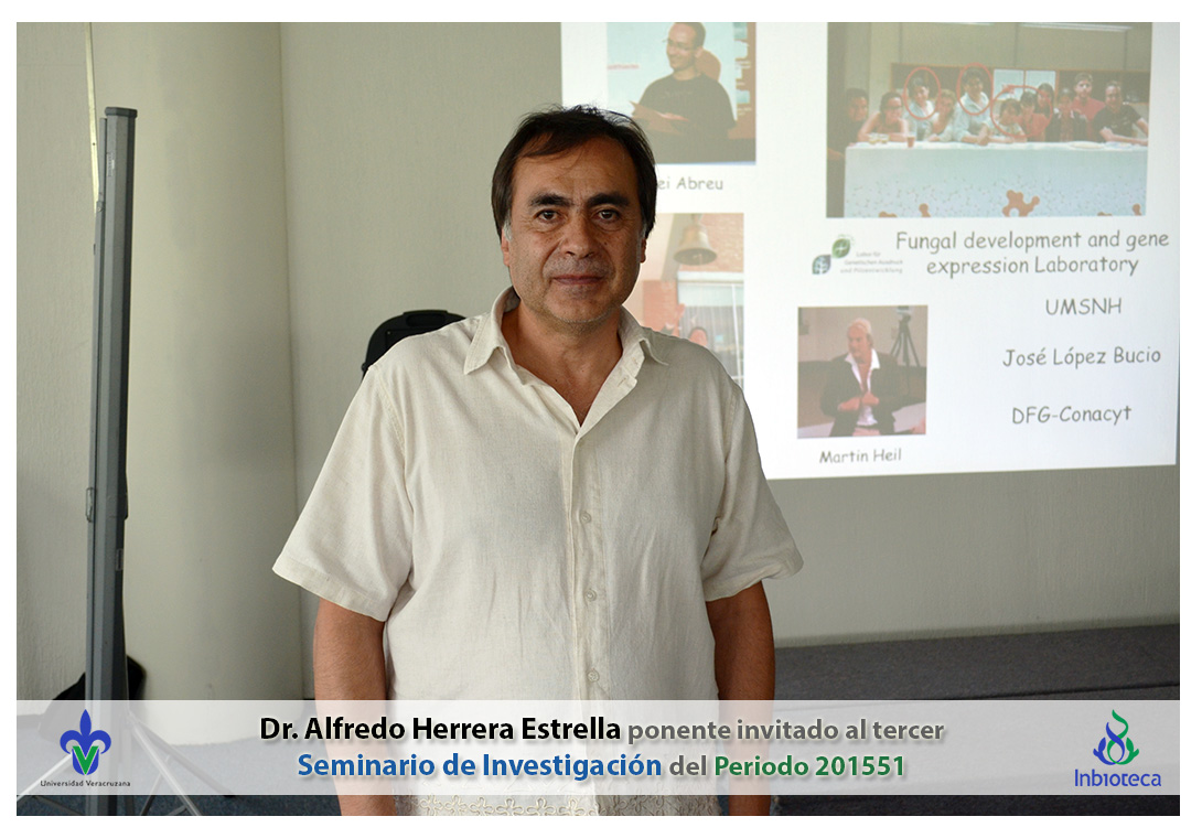 El profesor invitado fué el Dr. Alfredo Herrera Estrella, Investigador del Laboratorio Nacional de Genómica para la Biodiversidad (LANGEBIO) del Instituto Politécnico Nacional (IPN). La conferencia impartida fue "Mecanismos moleculares del desarrollo y parasitismo en el agente de biocontrol Trichoderma atroviride".