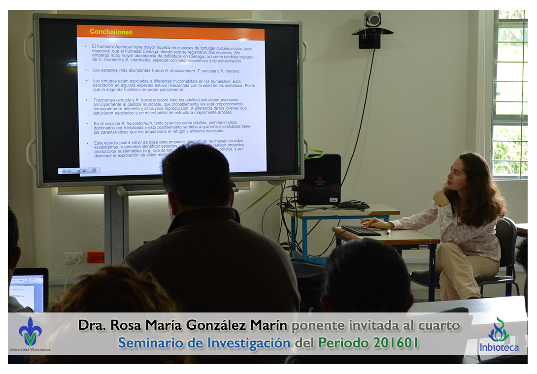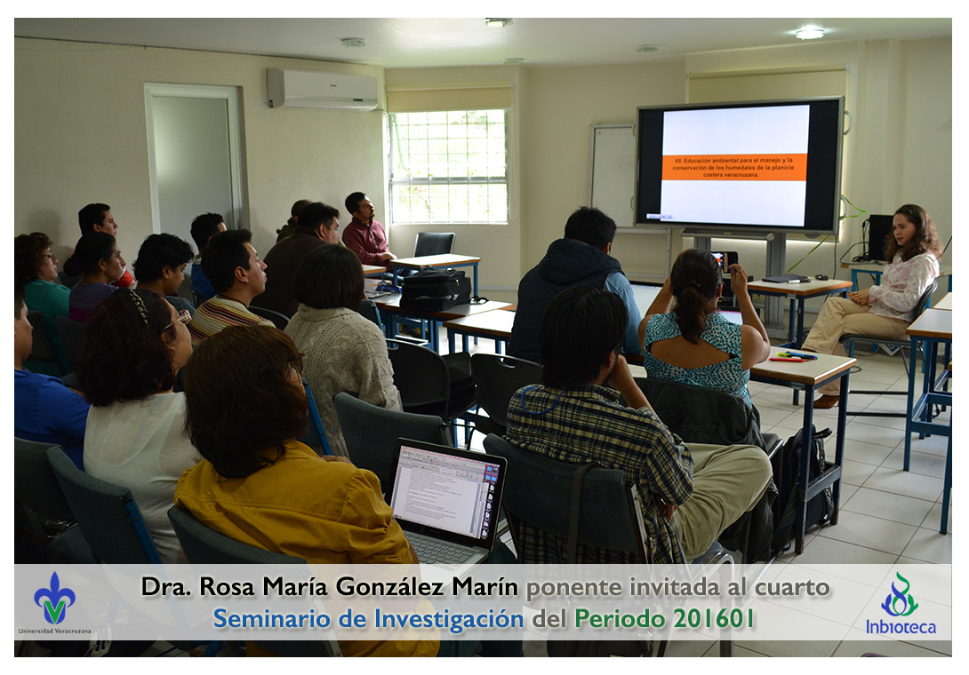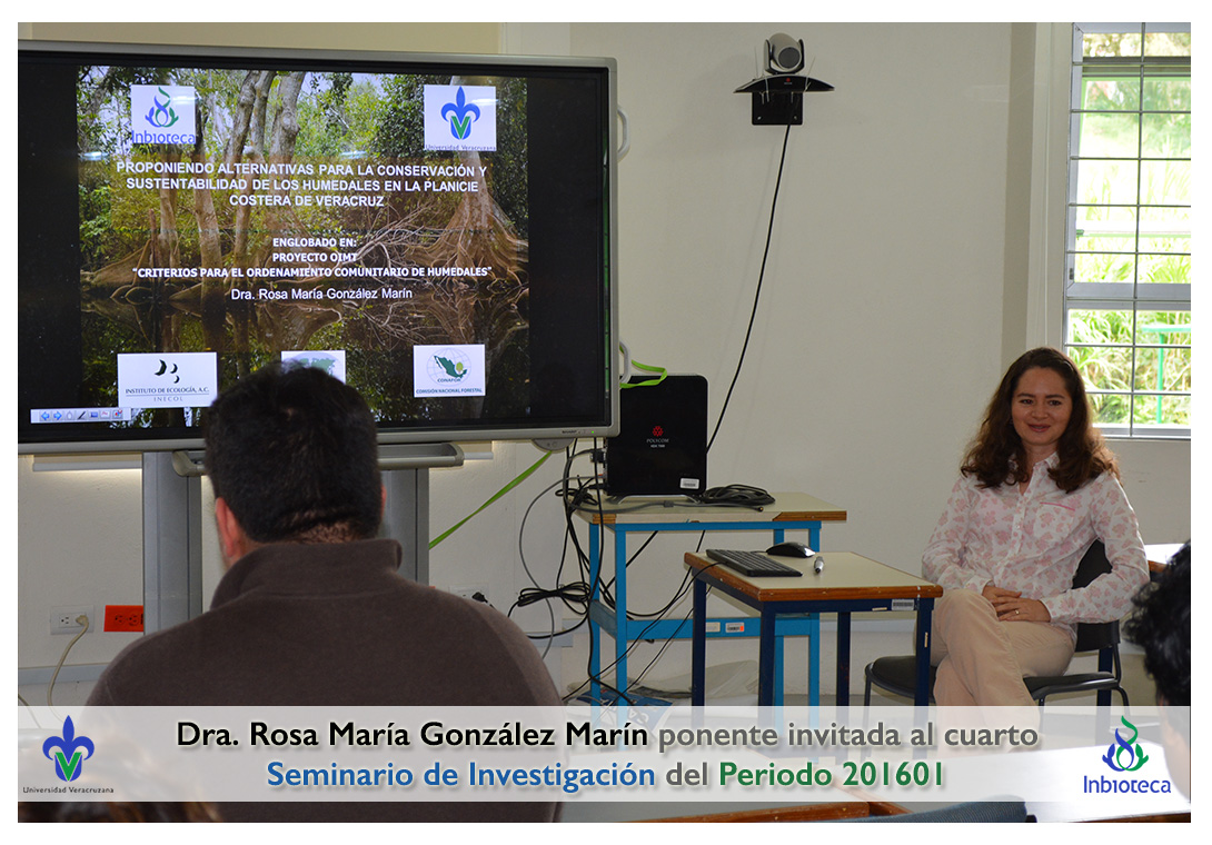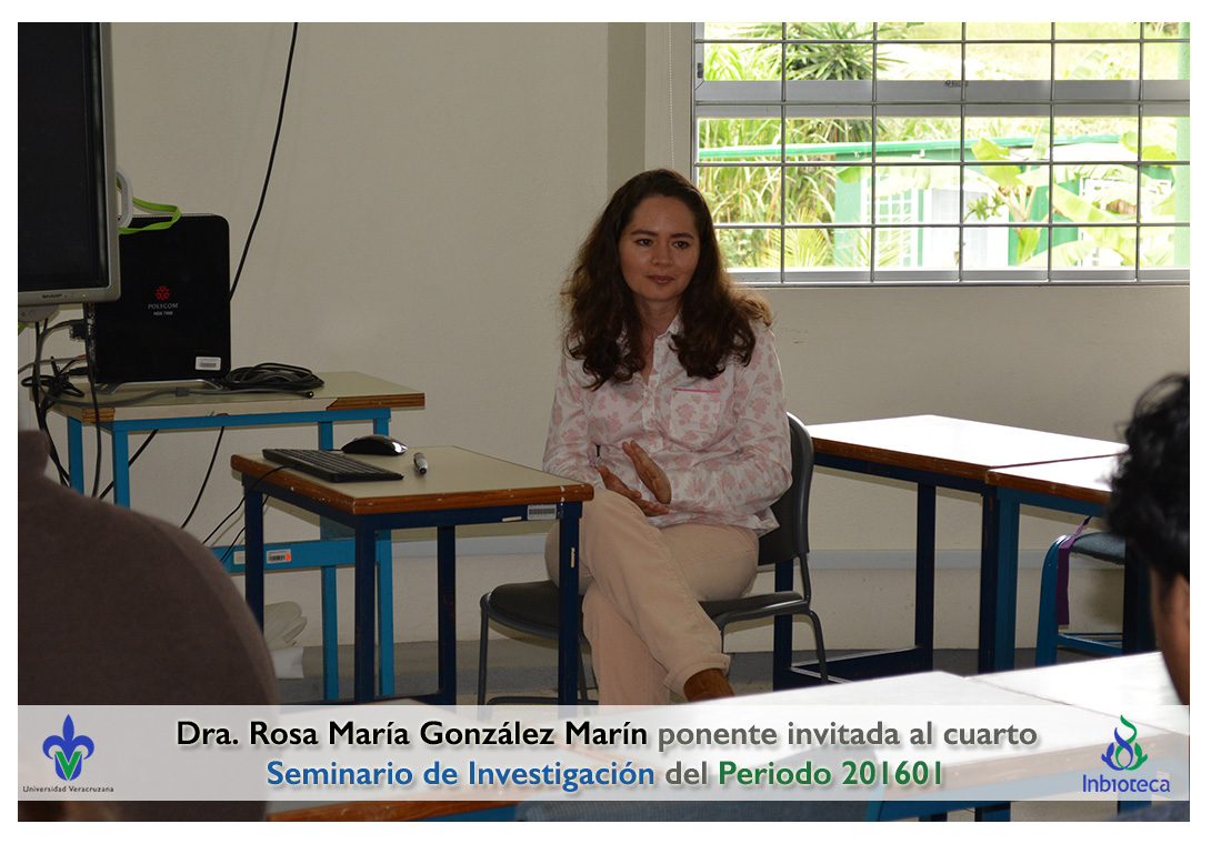 La profesora invitada fué la Dra. Rosa María González Marín, Posdoctorante del INBIOTECA. La conferencia impartida fue "Proponiendo Alternativas para la Conservación y Sustentabilidad de Humedales en la Planicie Costera de Veracruz, México".