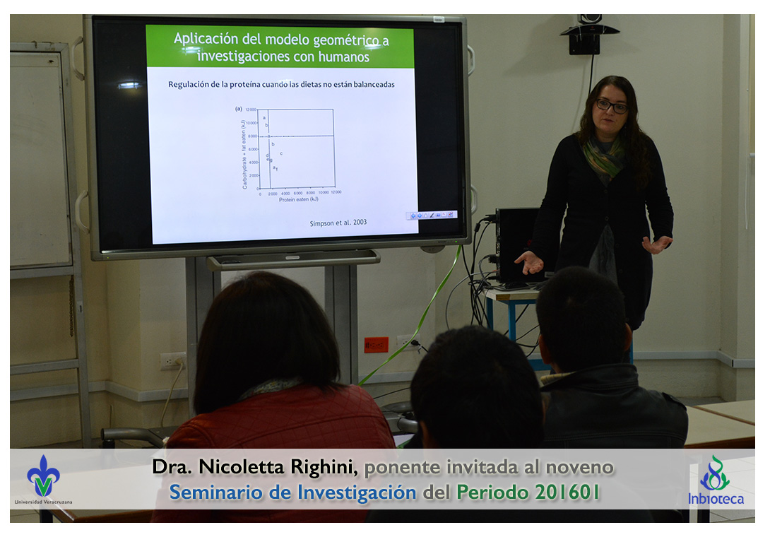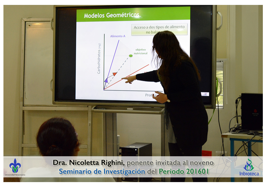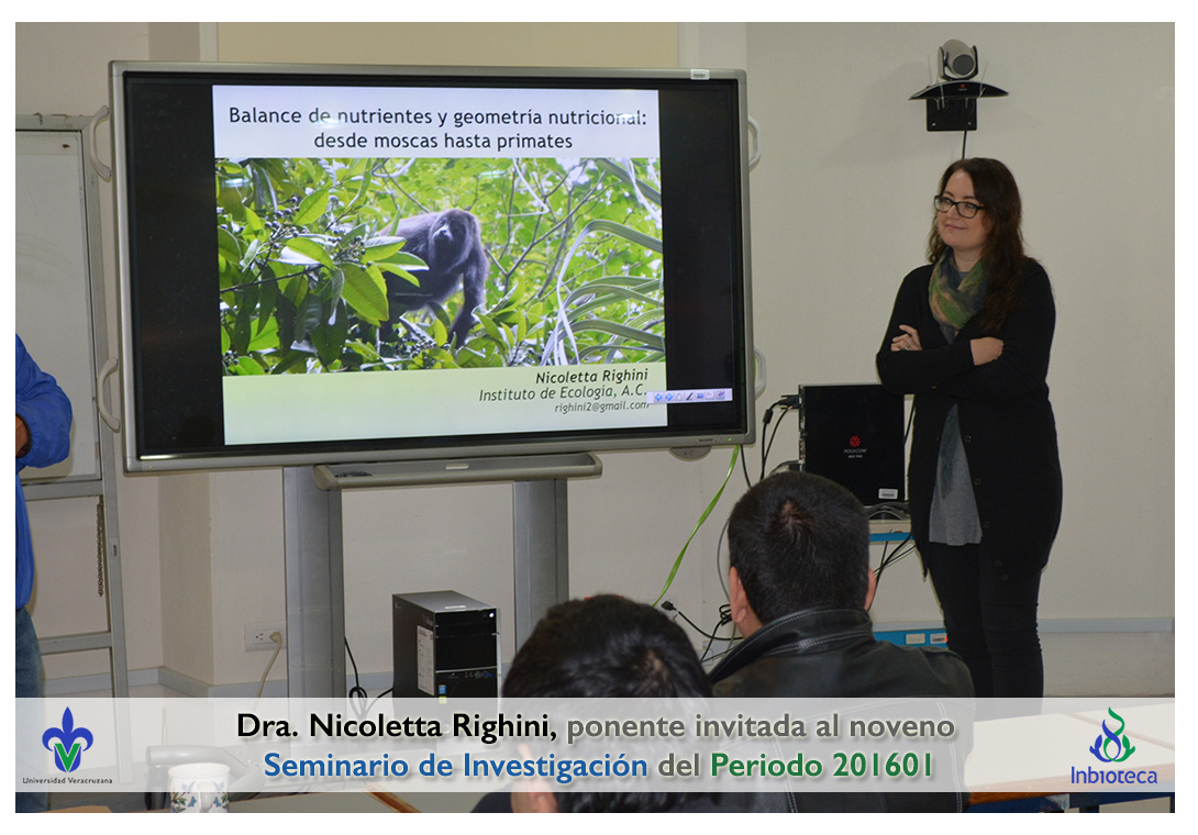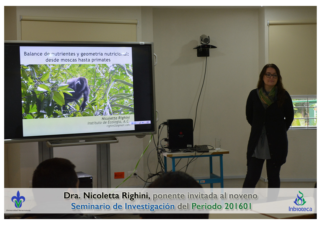 La profesora invitada fué la Dra. Nicoletta Righini, Investigador Asociado del Instituto de Ecología A.C. (INECOL) y del Department of Anthropology de la University of Illinois. La conferencia impartida fue "Balance de nutrientes y geometría nutricional: desde moscas hasta primates".