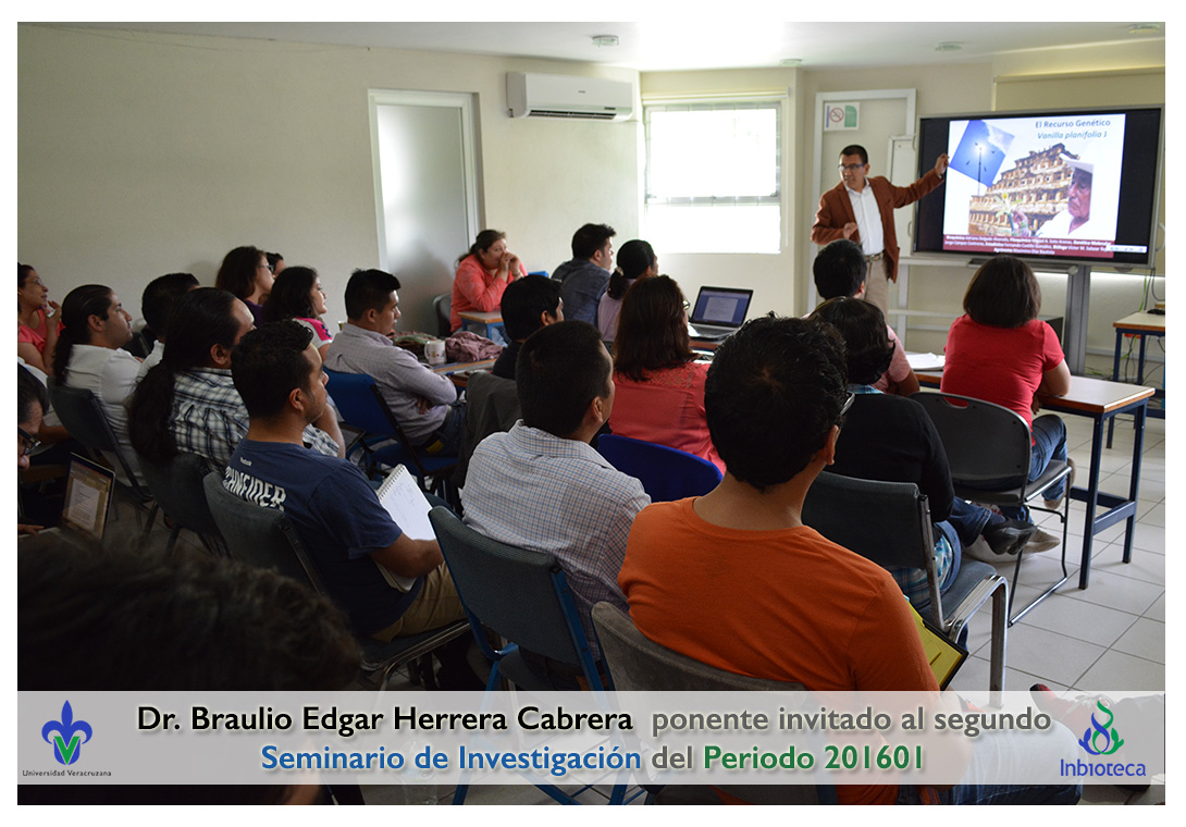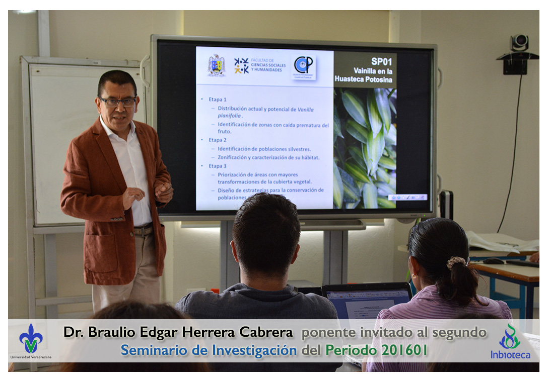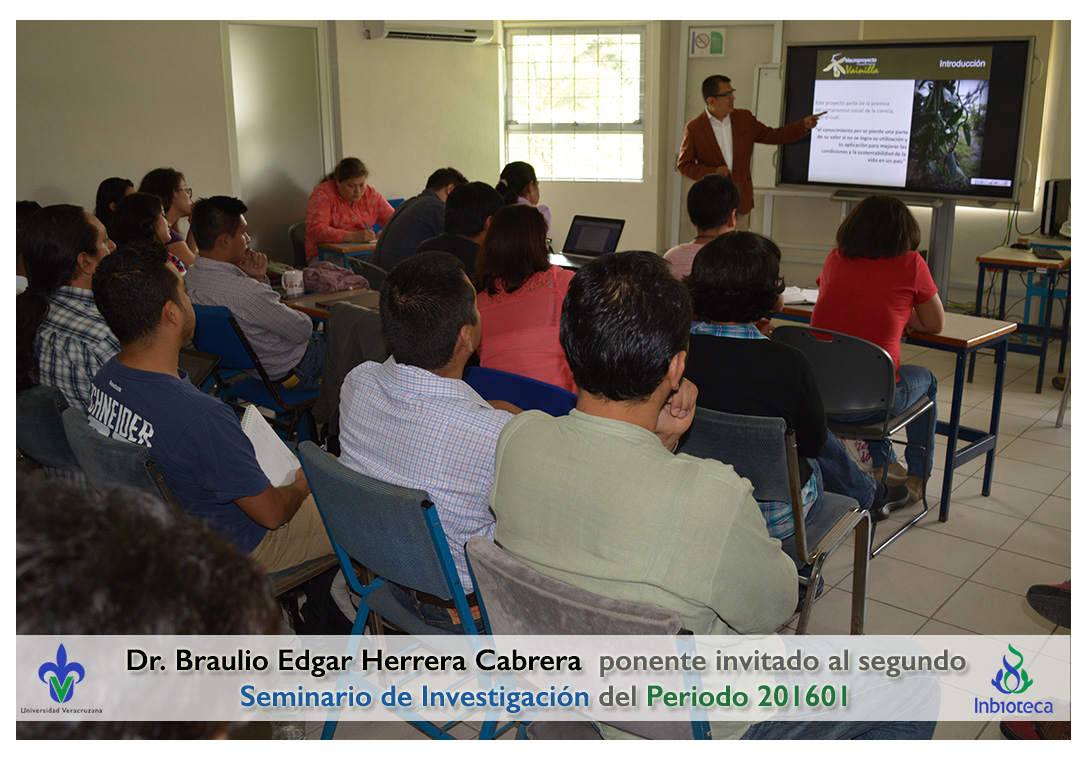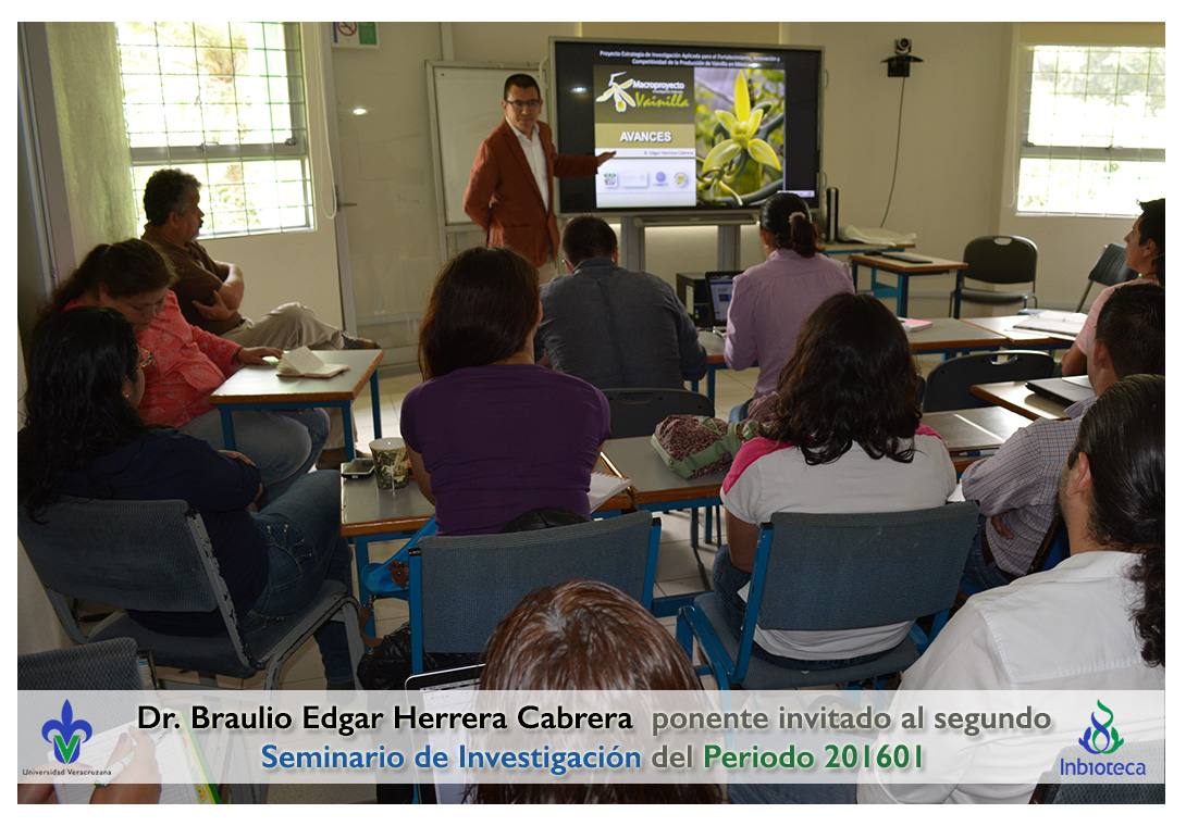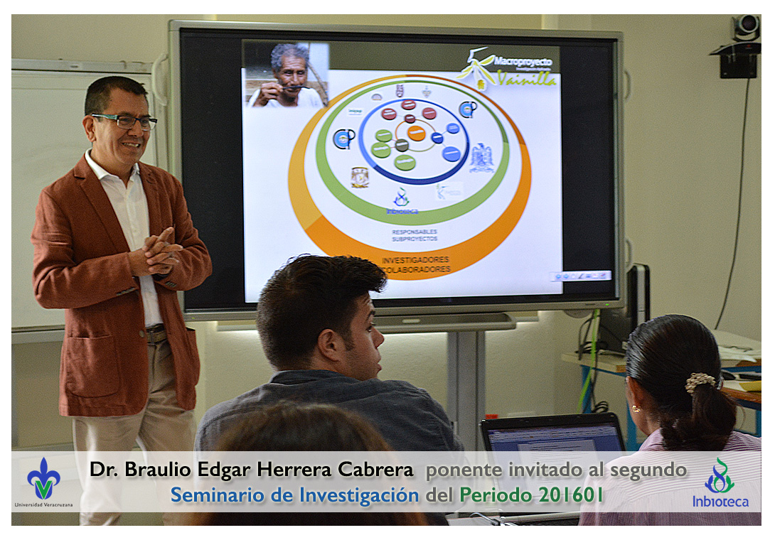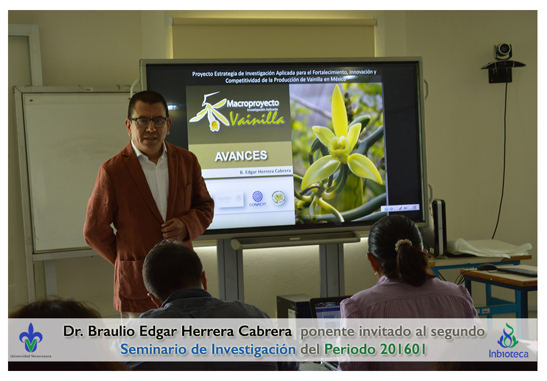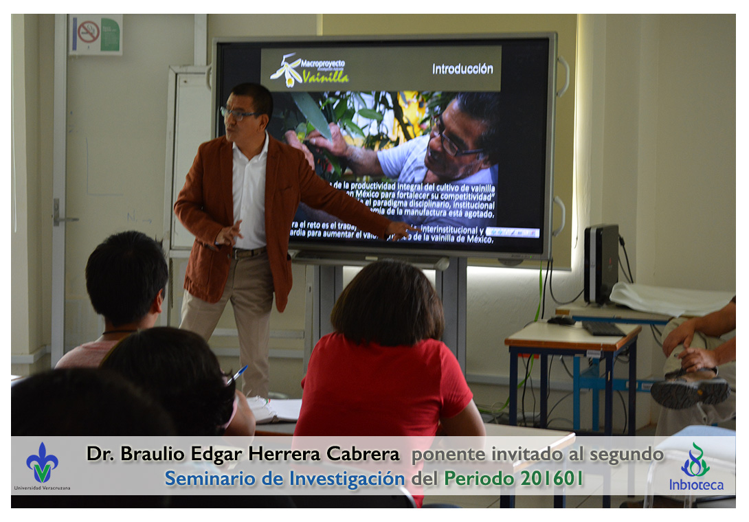 El profesor invitado fué el Dr. Braulio Edgar Herrera Cabrera, Investigador Titular del Colegio de Posgraduados (COLPOS), Campus Puebla. La conferencia impartida fue "Megaproyecto de Vainilla, Avances".