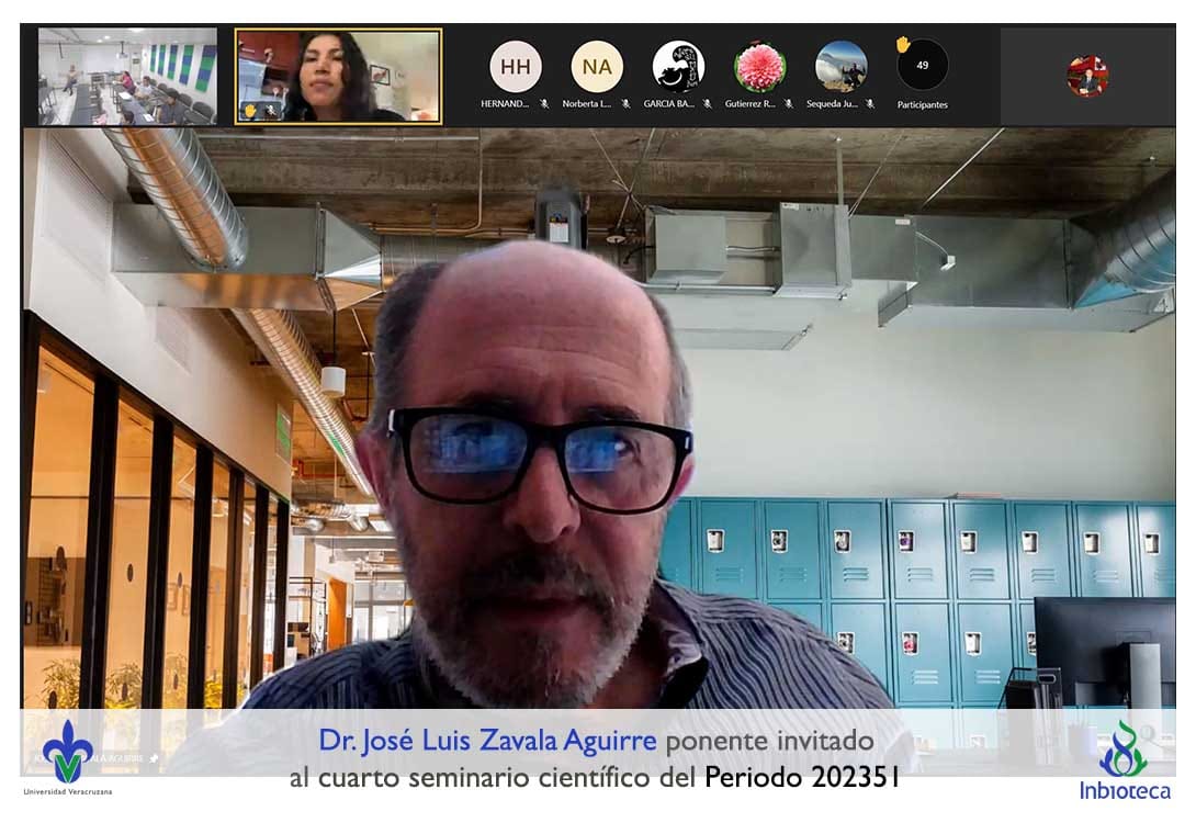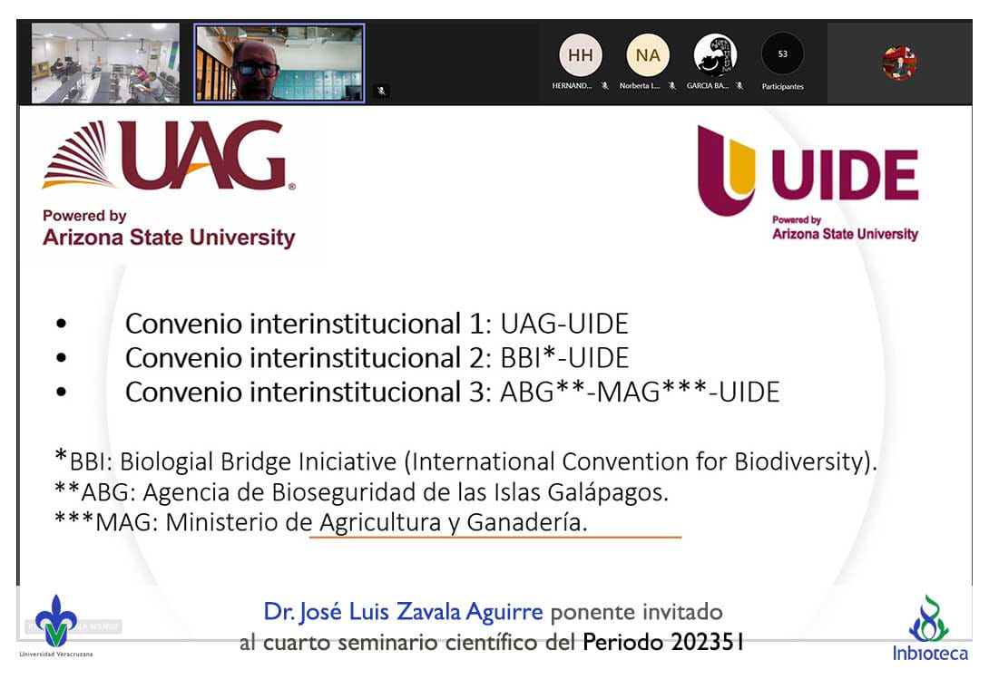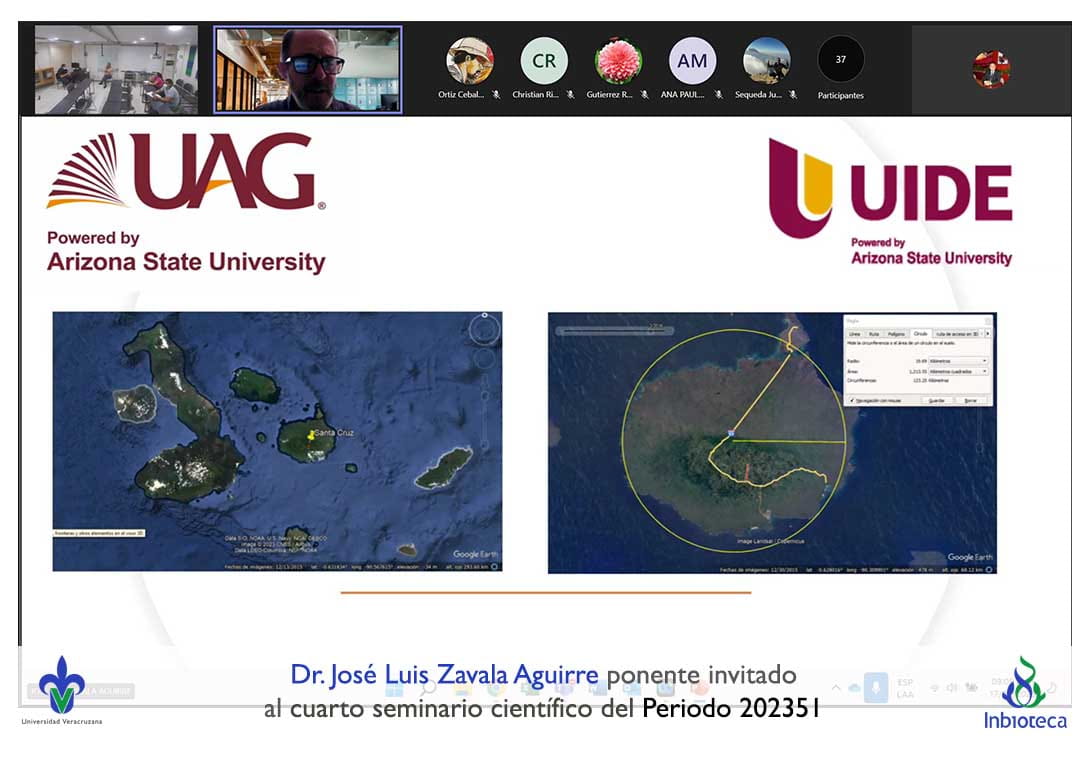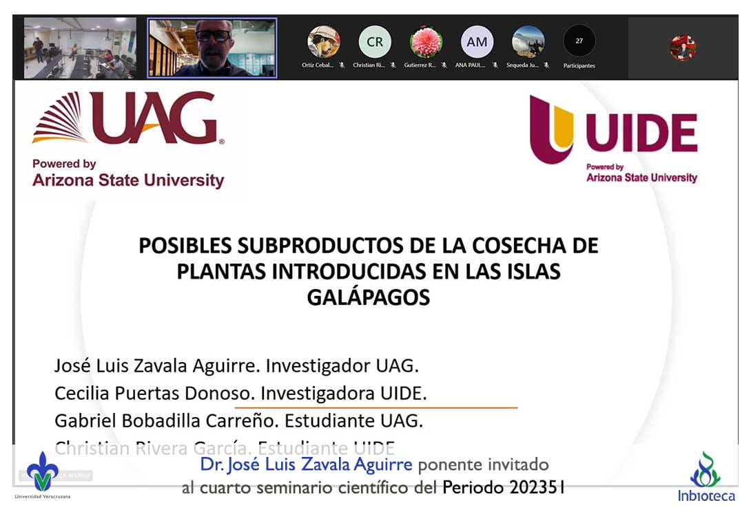 El seminario se desarrolló con la participación del Dr. José Luis Zavala Aguirre Profesor Investigador Titular y adscrito a la Dirección Departamental de Biotecnológicas y Ambientales de la Universidad Autónoma de Guadalajara (UAG). La conferencia se tituló: Posibles subprouctos de la coecha de plantas introducidas en las Islas Galápagos.