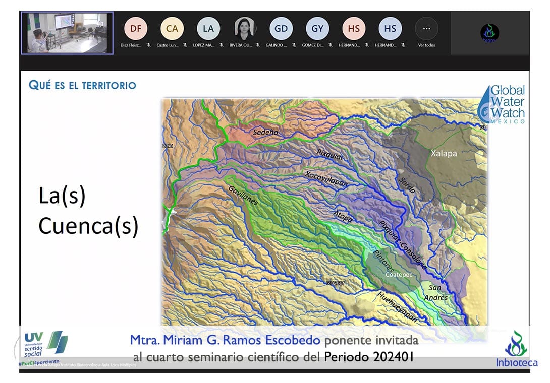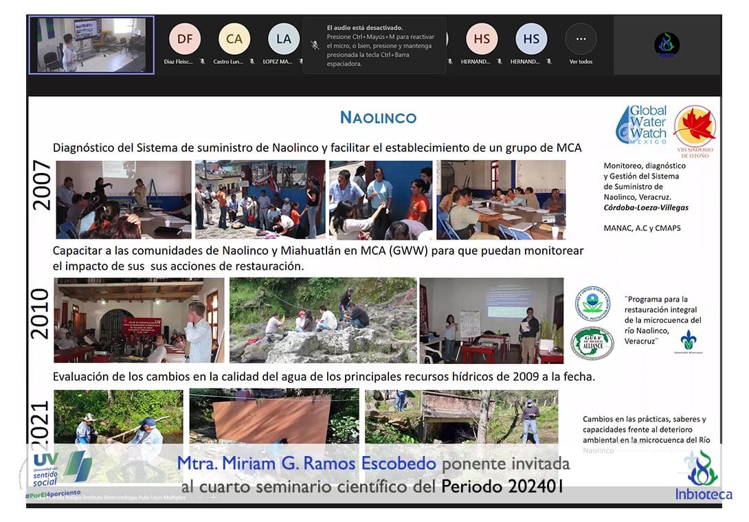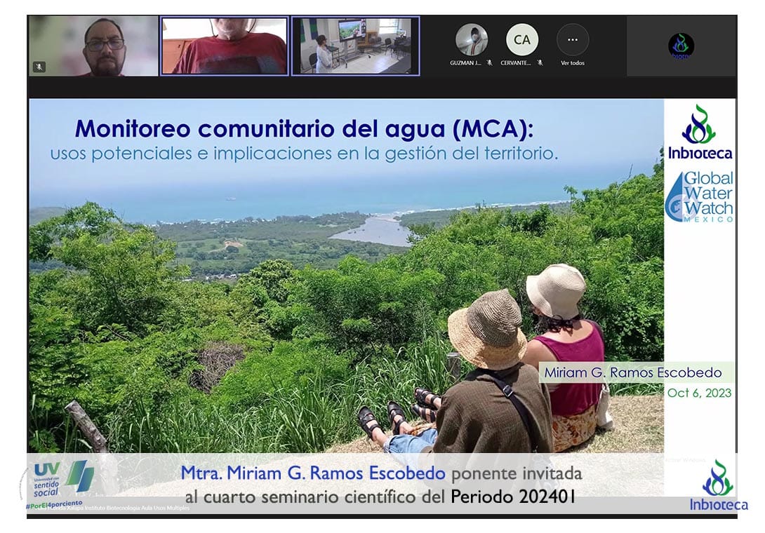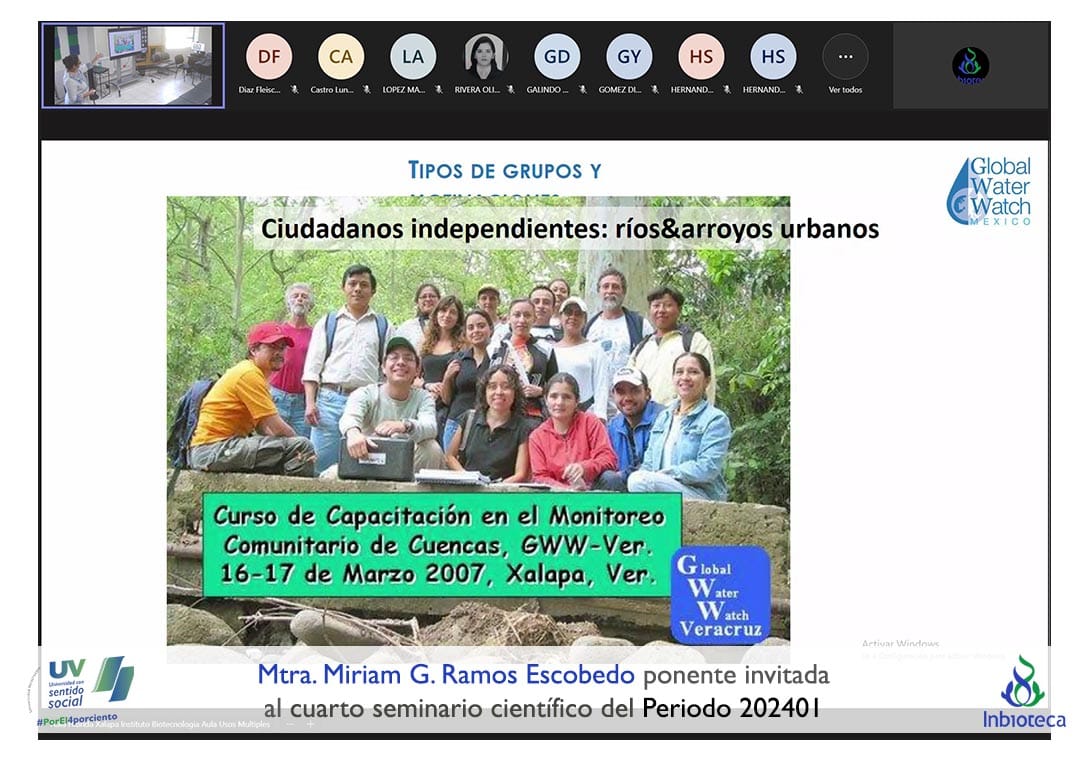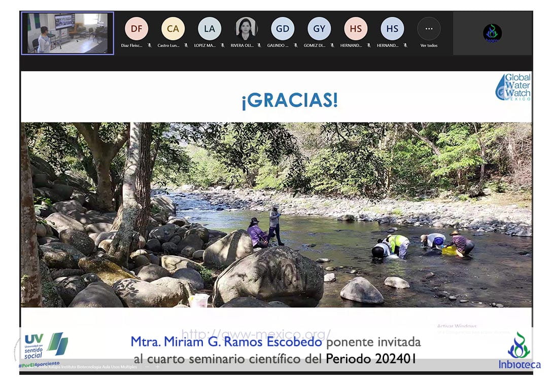 El seminario se desarrolló con la participación de la M. en C. Miriam Guadalupe Ramos Escobedo de la Global Water Watch México. La conferencia se tituló: Monitoreo comunitario del agua (MCA): usos potenciales e implicaciones en la gestión del terriotorio.