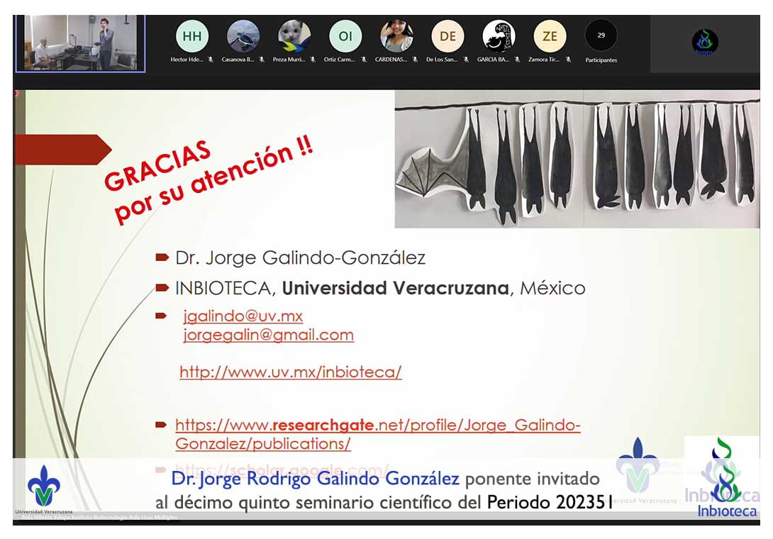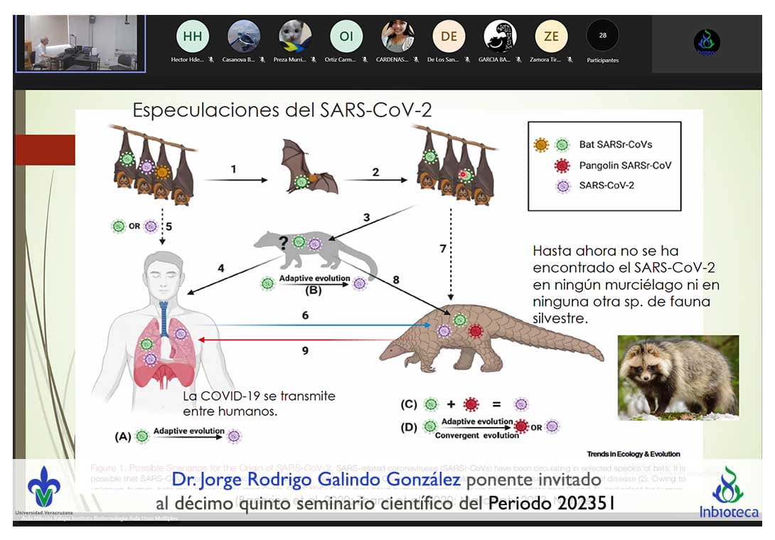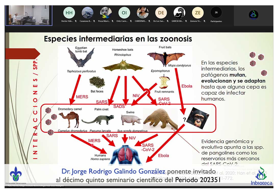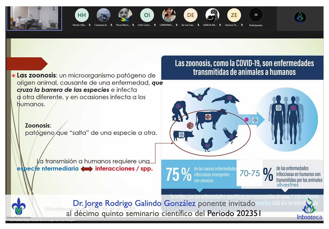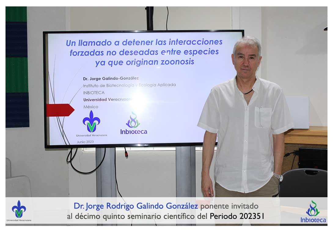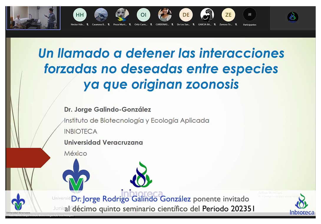 El seminario se desarrolló con la participación del Dr. Jorge Rodrigo Galido González académico/investigador del Instituto de Biotecnología y Ecología Aplicda (INBIOTECA) de la Universidad Veracruzana. La conferencia se tituló: Un llamado a detener las interacciones forzadas no deseadas entre especies ya que originan zoonosis.
