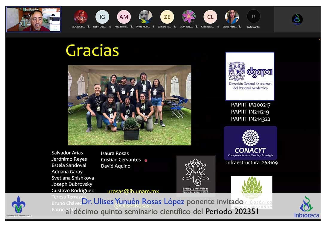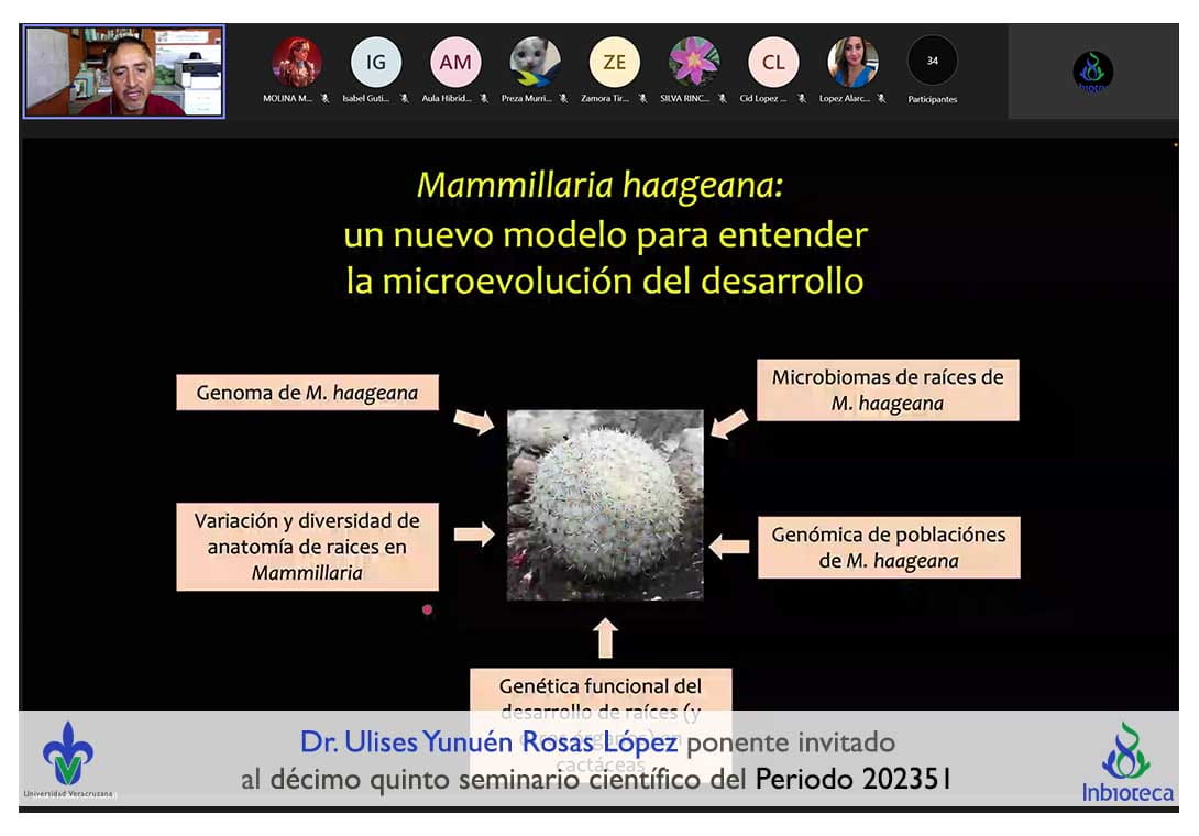 El seminario se desarrolló con la participación del Dr. Ulises Yunuén Rosas López investigador del Jardín Botánico del Instituto de Biotecnología de la Universidad Nacional Autónoma de México (UNAM). La conferencia se tituló: Datilgenomics y cactogenomics: el poder de los estudios en especies no modelo.