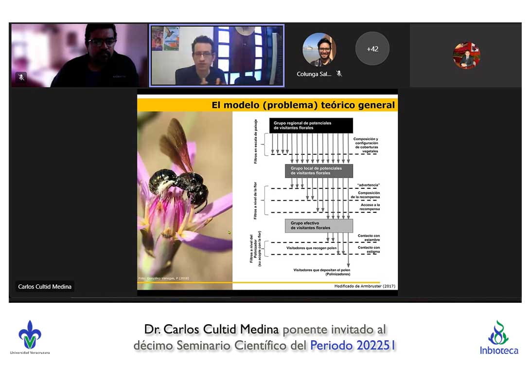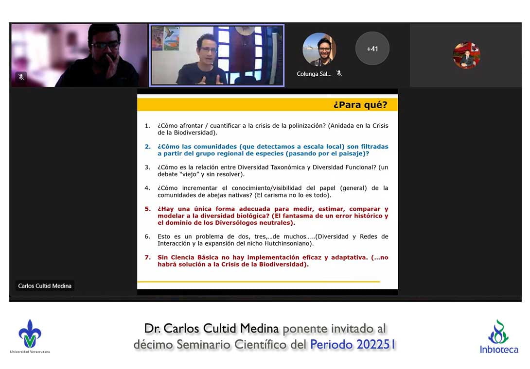 El seminario se desarrolló con la participación del Dr. Carlos Cultid Medina Investigador, Catedrático CONACyT del Instituto de Ecología A. C. (INECOL) Centro Regional del Bajío, Pátzcuaro. La conferencia se tituló: ¿Cuántas, Quiénes y Qué hacen?: análisis de la diversidad taxonómica y funcional de abejas nativas.