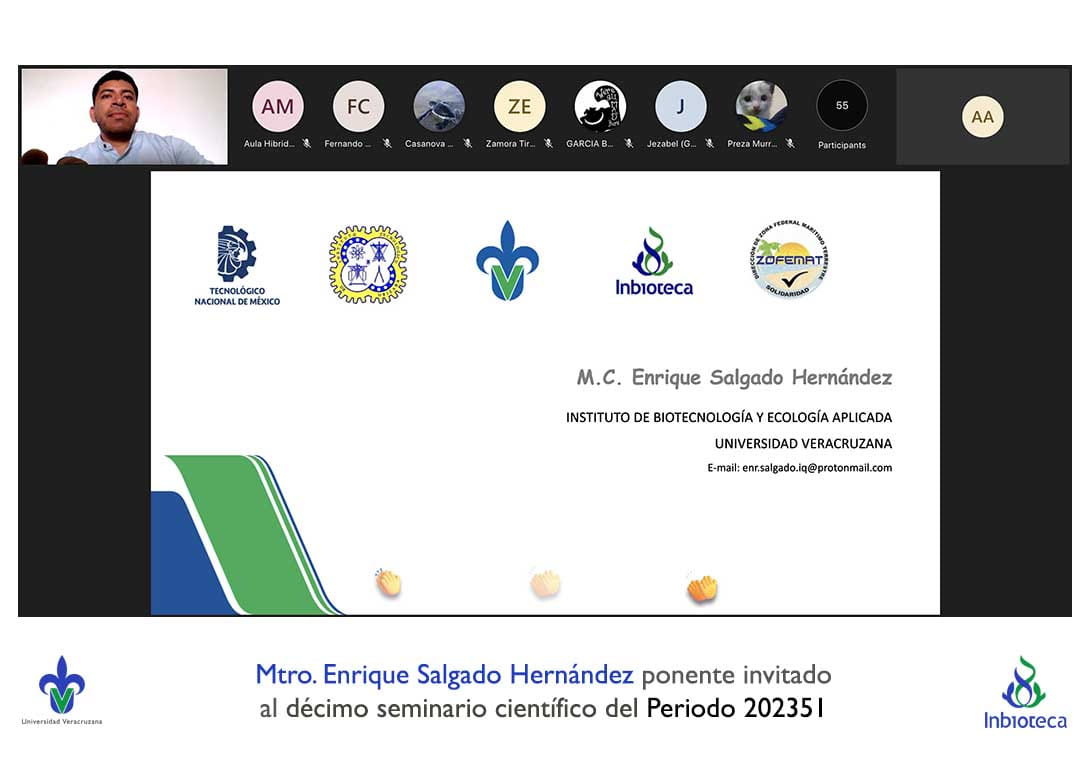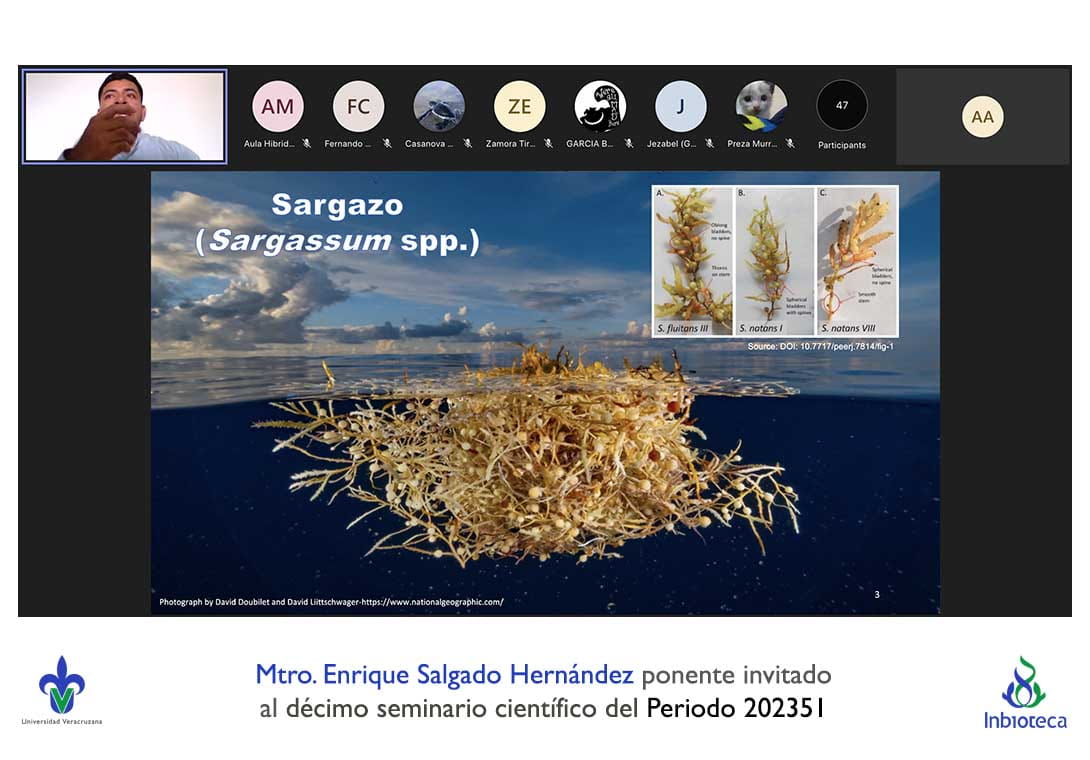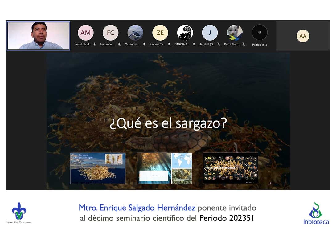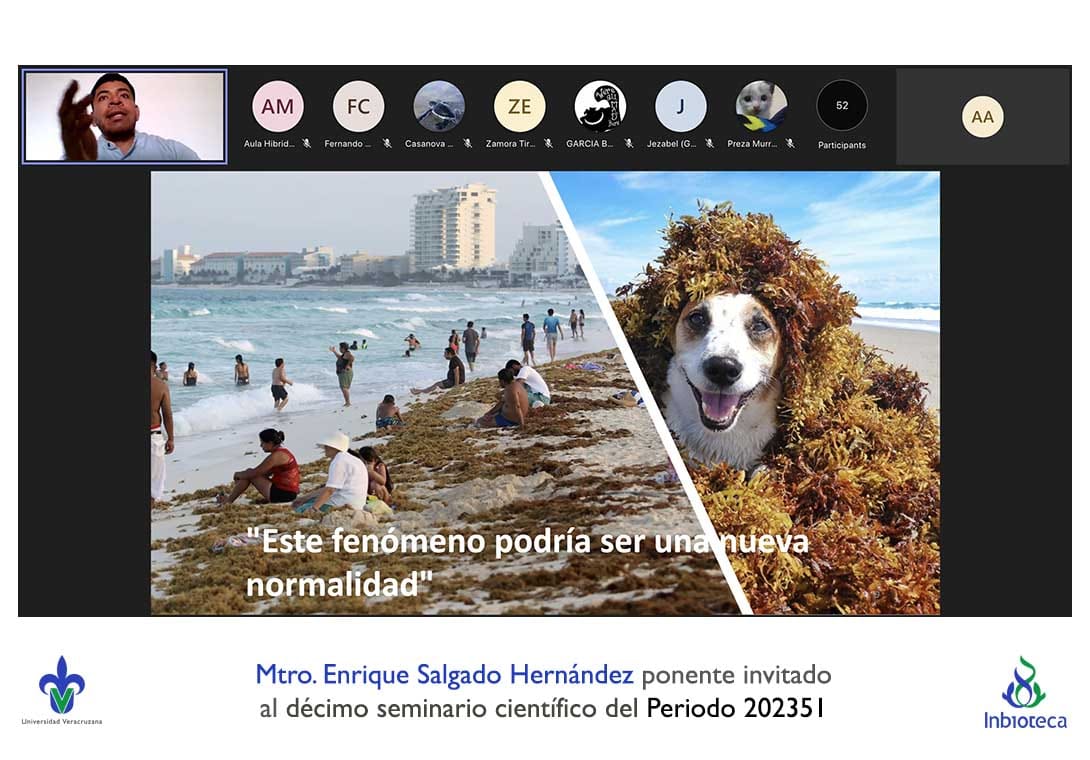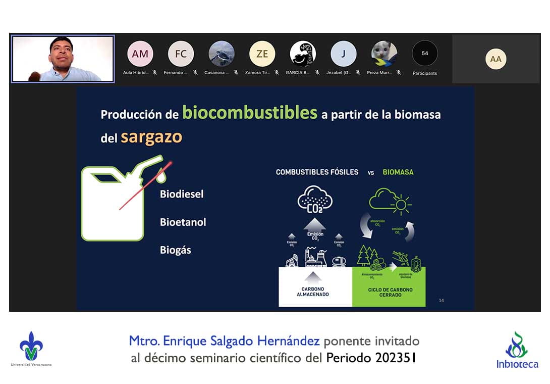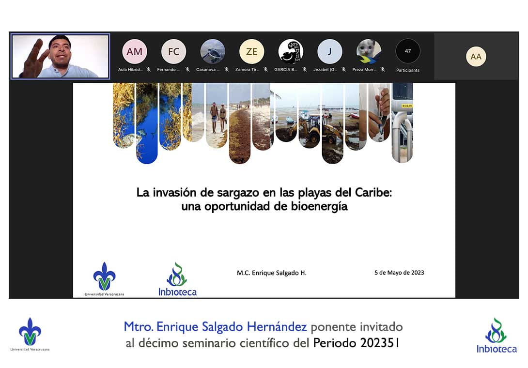El seminario se desarrolló con la participación del M.C. Enrique Salgado Hernández estudiante del Doctorado en Ciencias en Ecología y Biotecnología (DCEB) del INBIOTECA-UV. La conferencia se tituló: La invasión de sargazo en las playas del Caribe: una oportunidad de bioenergía.