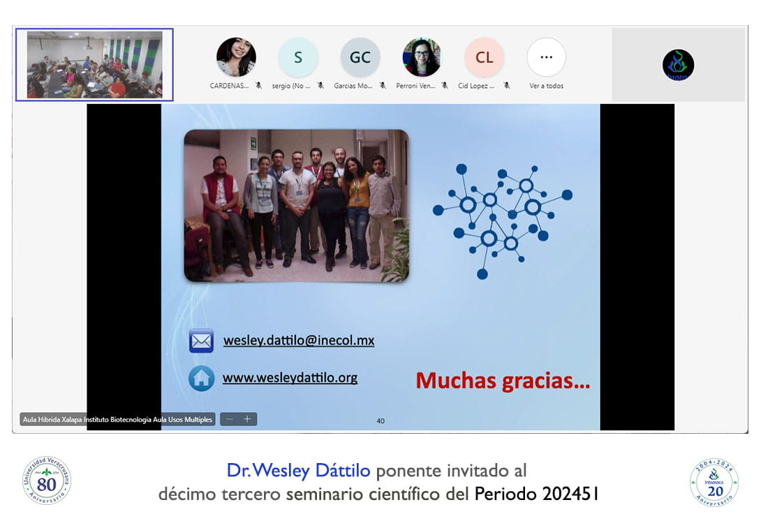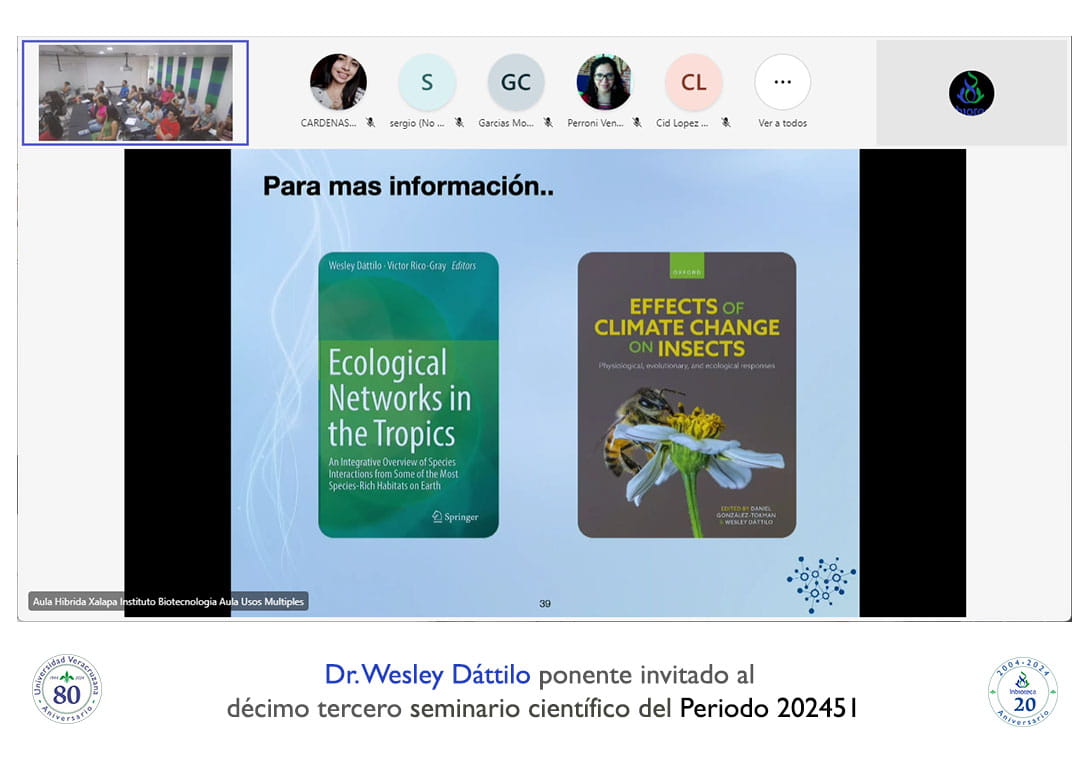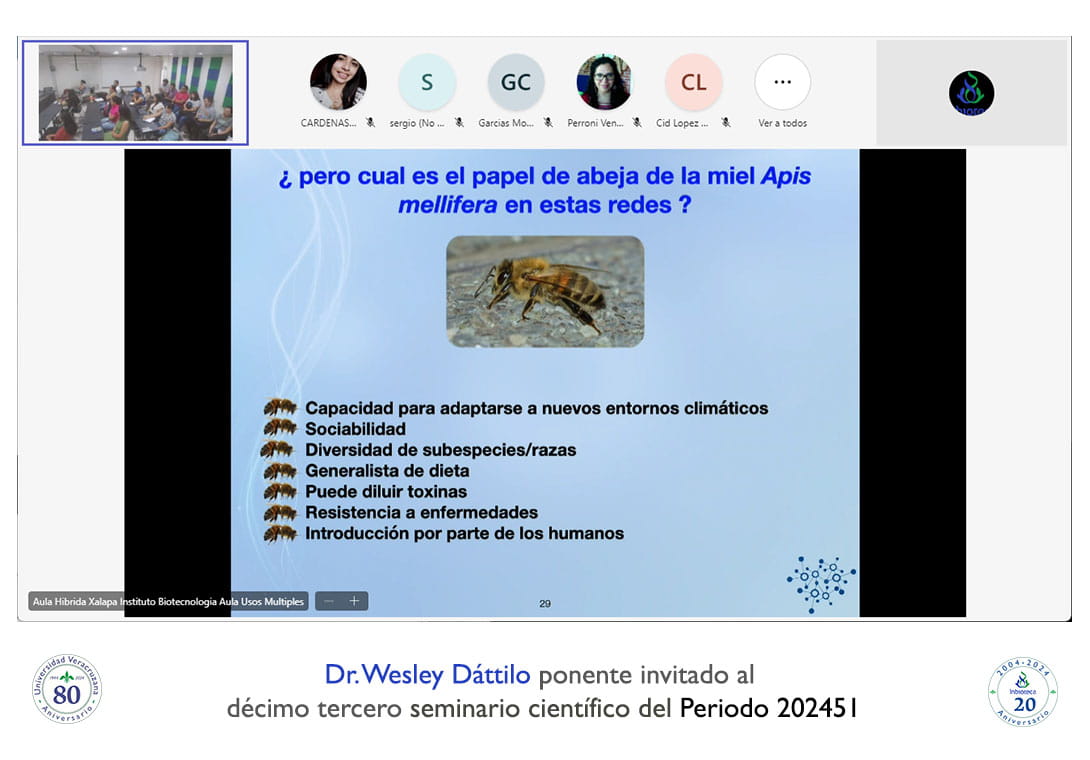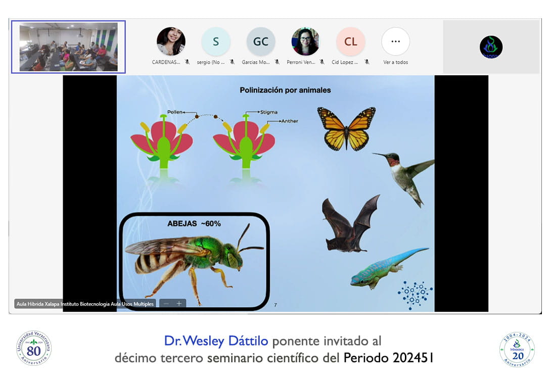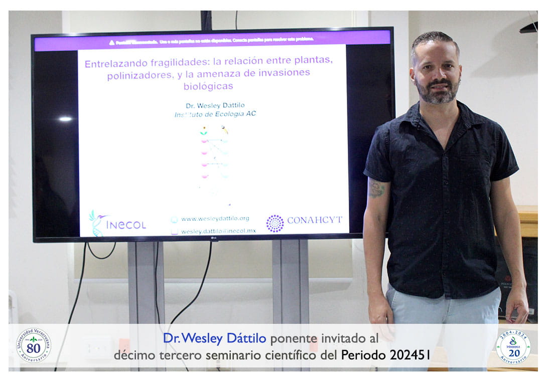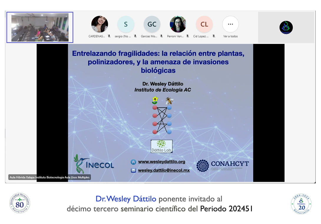 El seminario se desarrolló con la participación del Dr. Wesley Dáttilo investigador titular de la Red de Ecoetología del Instituto de Ecología A. C. (INECOL). La conferencia se tituló: Entrelazando fragilidades: la relación entre plantas, polinizadores y la amenaza de invasiones biológicas.