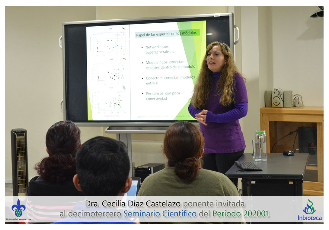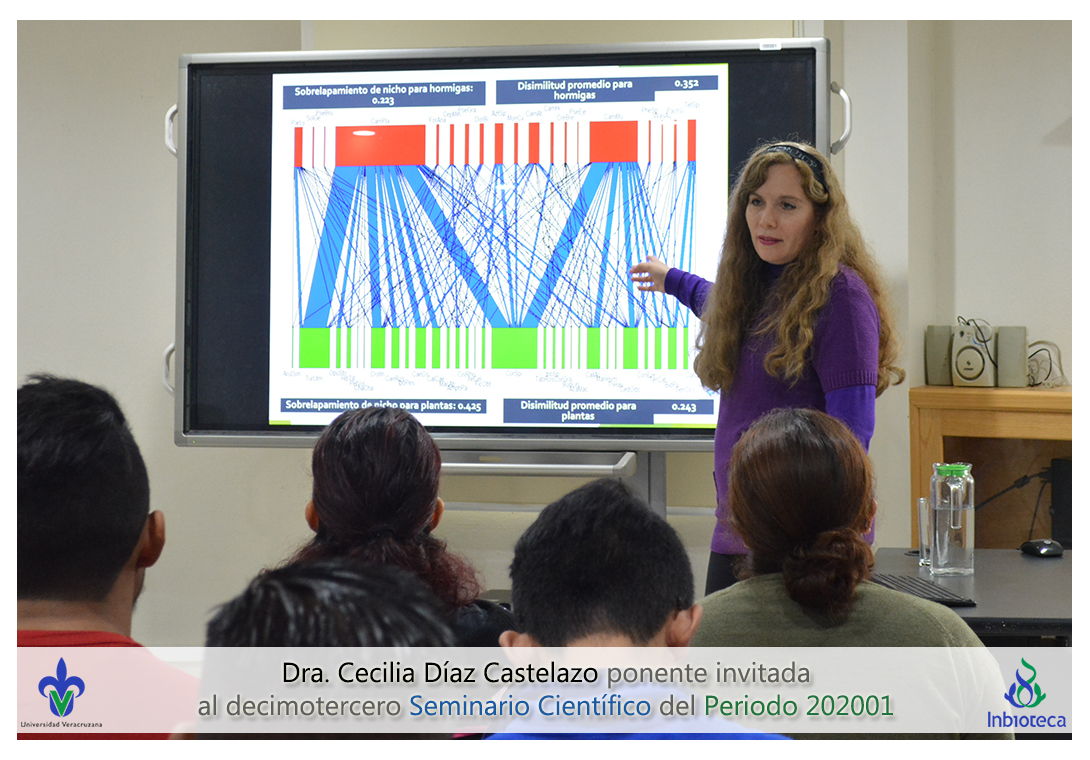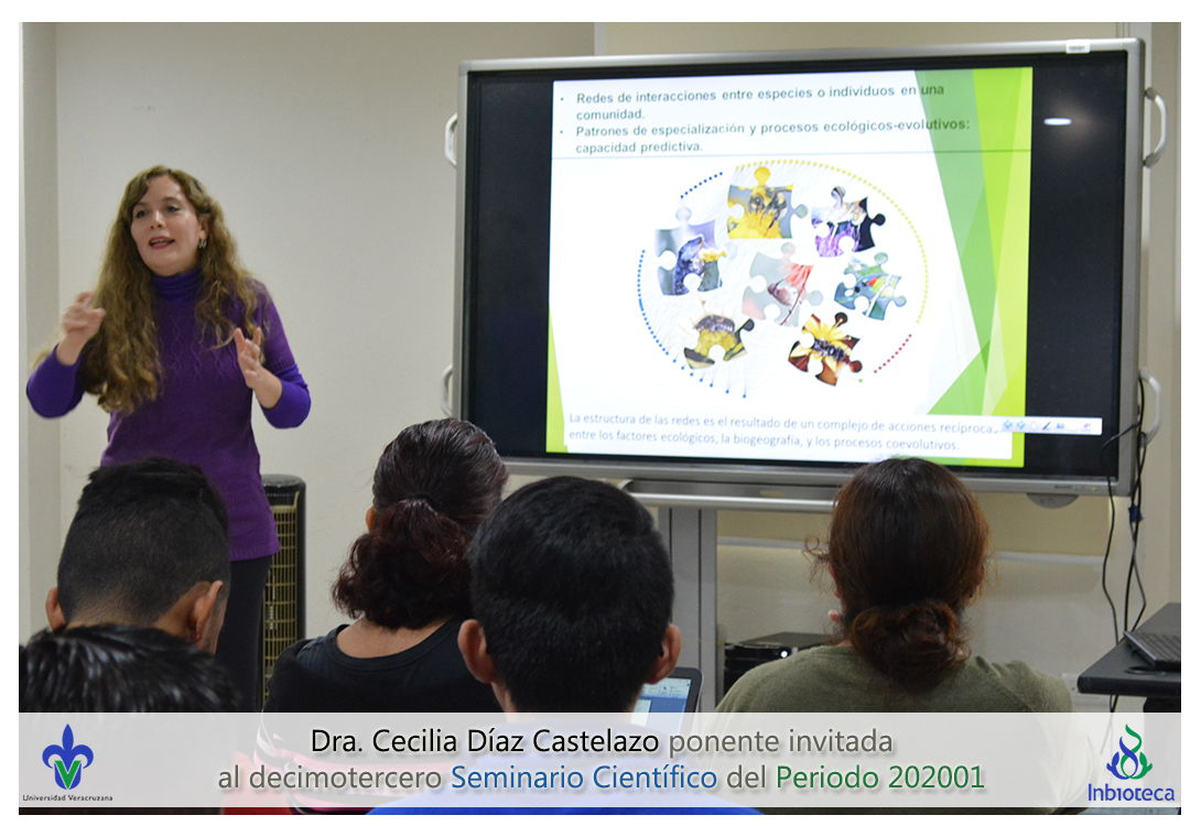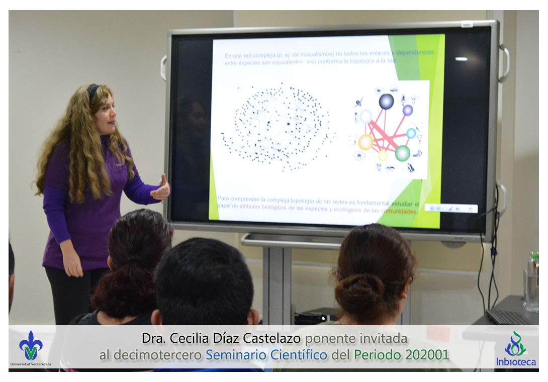 La ponente invitada fue la Dra. Cecilia Díaz Castelazo de la Red de Interacciones Multitróficas del Instituto de Ecología, A.C. (INECOL). La conferencia impartida fue "Fundamentos y estructura de Redes ecológicas".