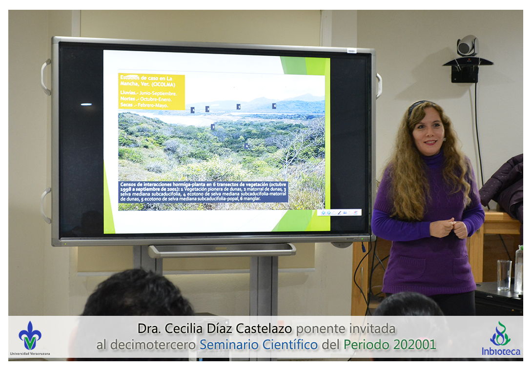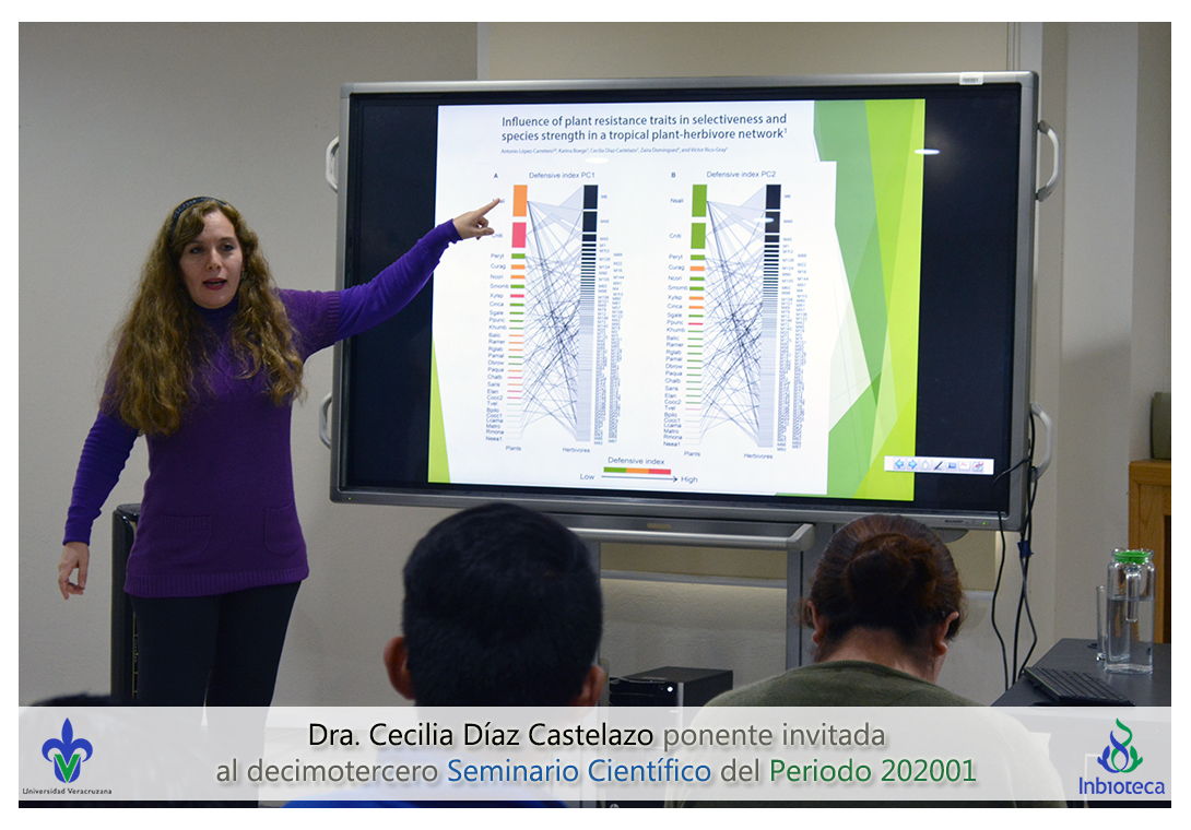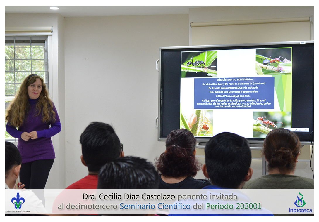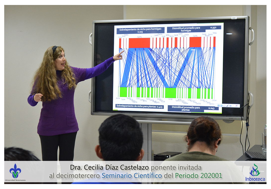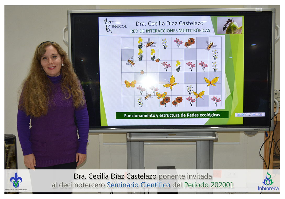 La ponente invitada fue la Dra. Cecilia Díaz Castelazo de la Red de Interacciones Multitróficas del Instituto de Ecología, A.C. (INECOL). La conferencia impartida fue "Fundamentos y estructura de Redes ecológicas".