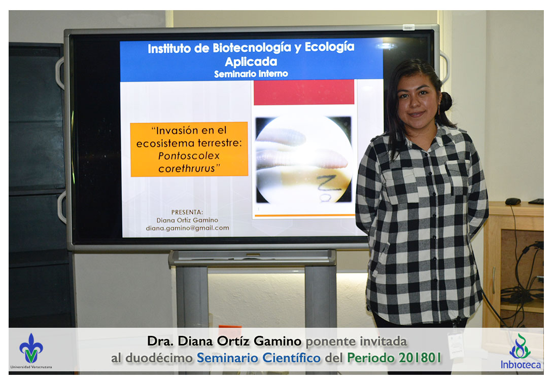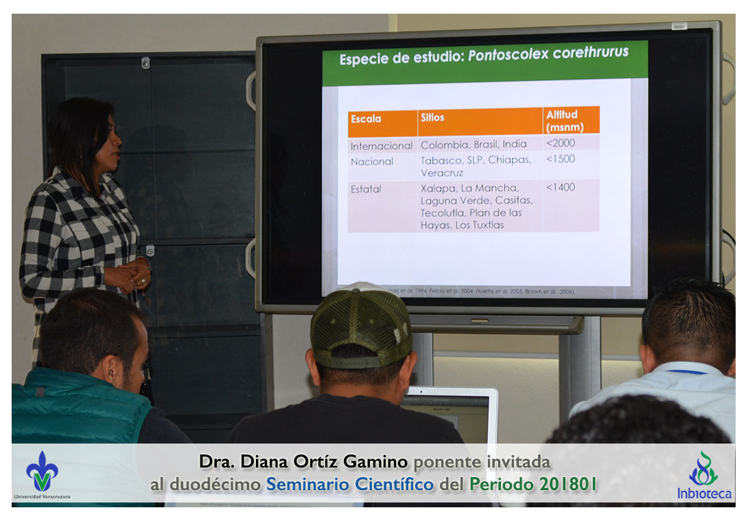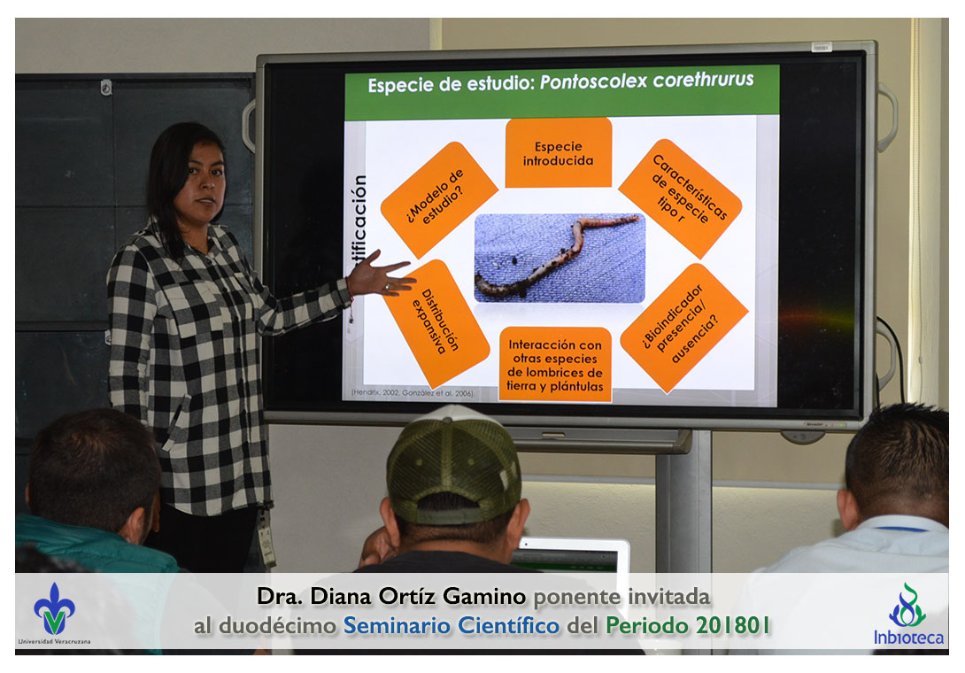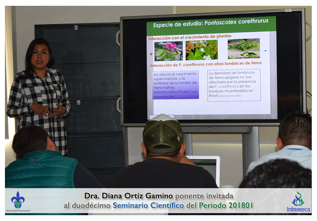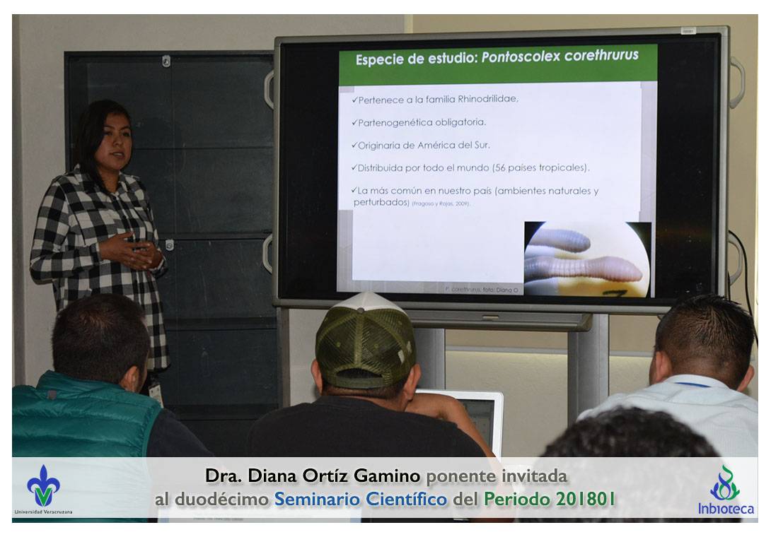 La ponente invitada fue la Dra. Diana Ortíz Gamino Posdoctorante de la Facultad de Agronomía y Veterinaria de la Universidad Autónoma de San Luis Potosí (UASLP). La conferencia impartida fue "Invasión en el ecosistema terrestre: Pontoscolex corethrurus".