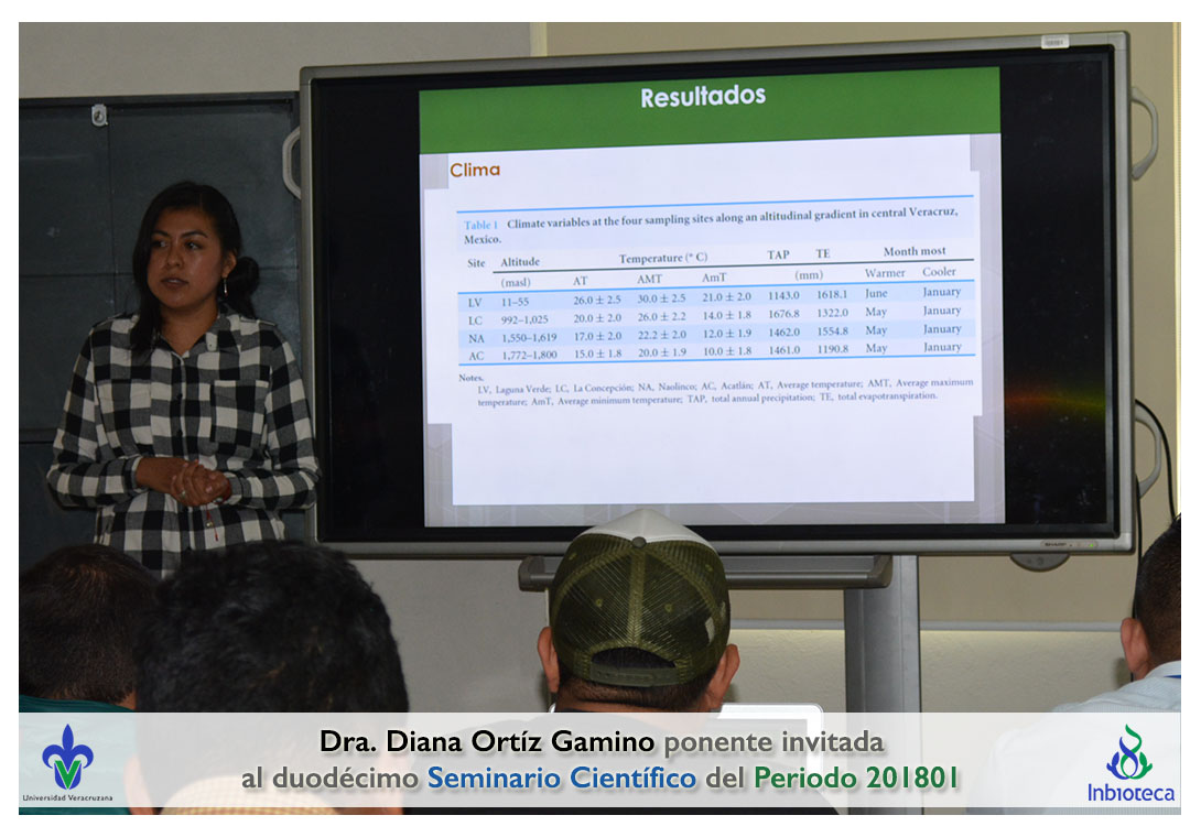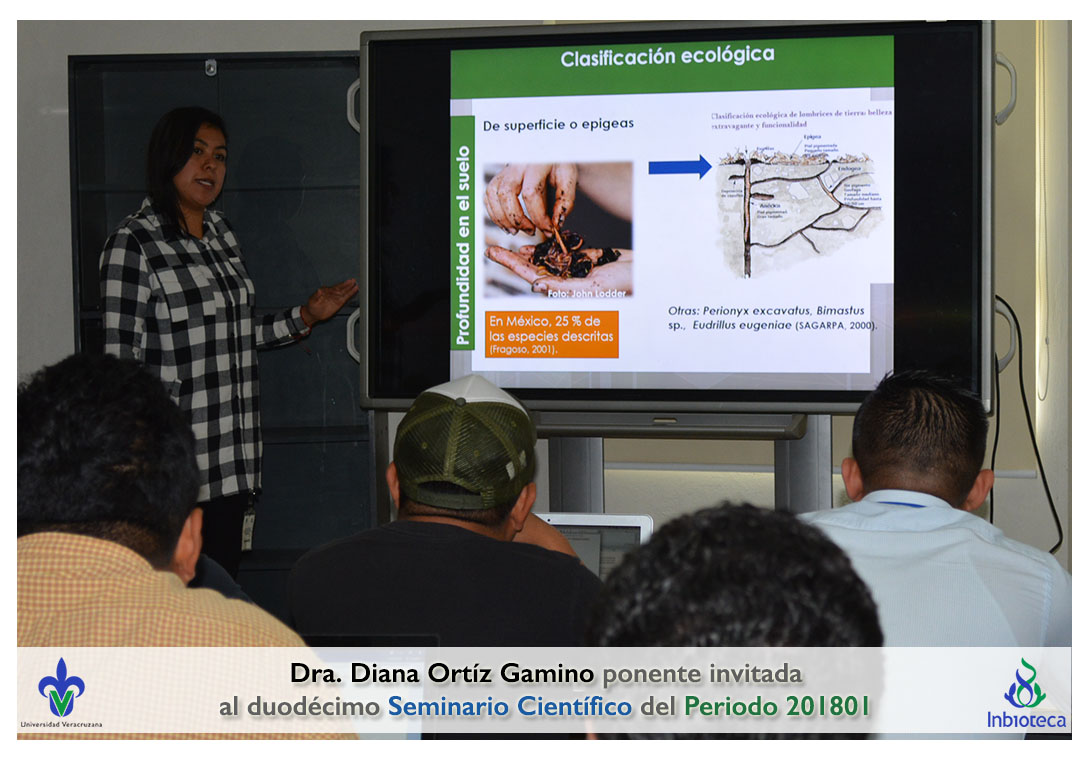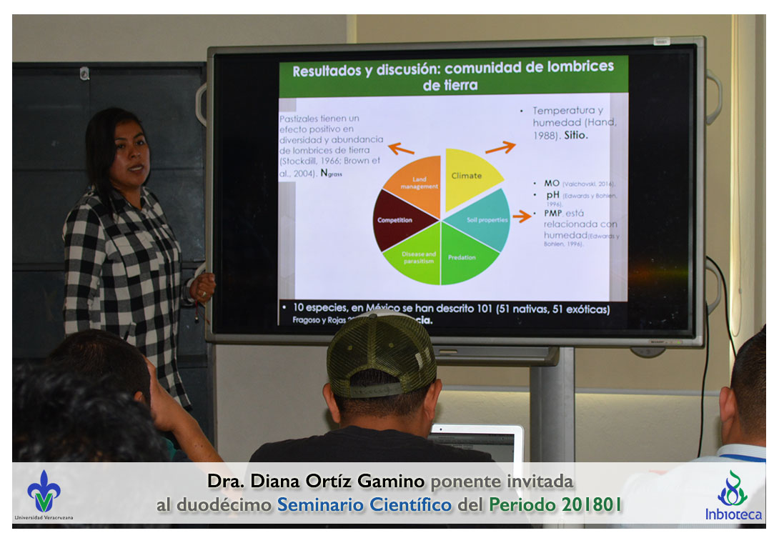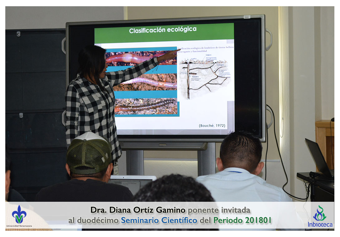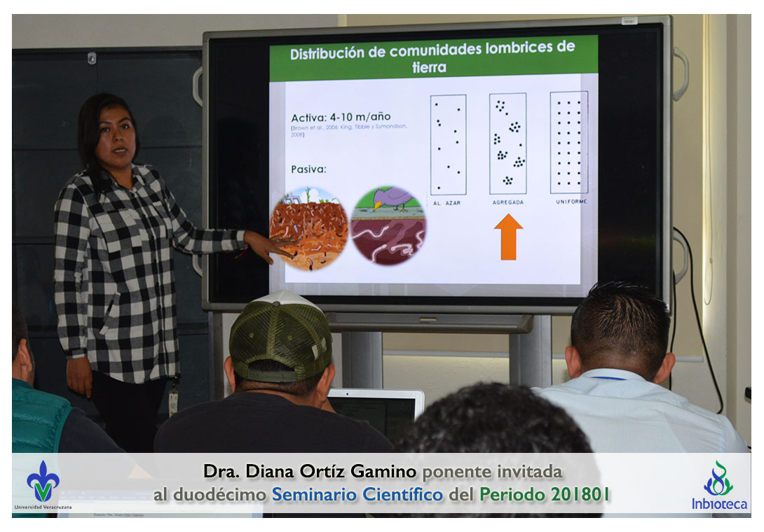 La ponente invitada fue la Dra. Diana Ortíz Gamino Posdoctorante de la Facultad de Agronomía y Veterinaria de la Universidad Autónoma de San Luis Potosí (UASLP). La conferencia impartida fue "Invasión en el ecosistema terrestre: Pontoscolex corethrurus".