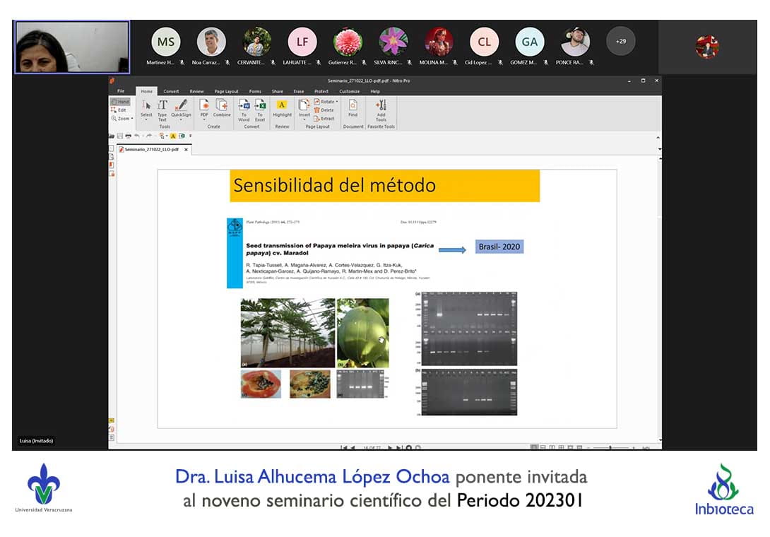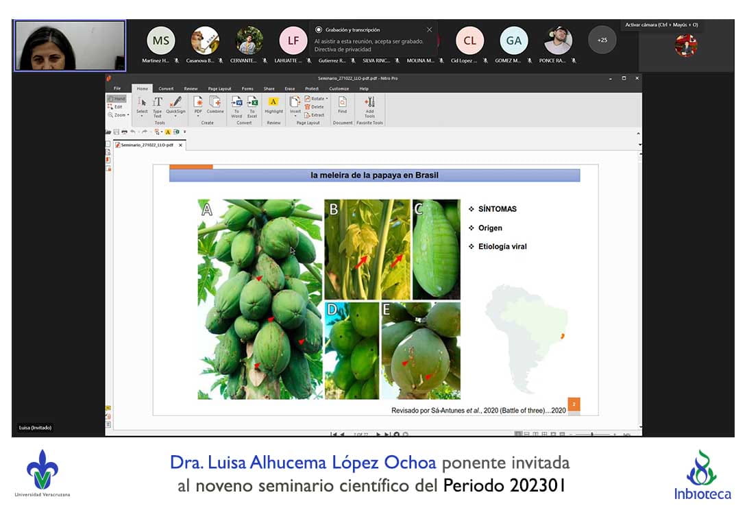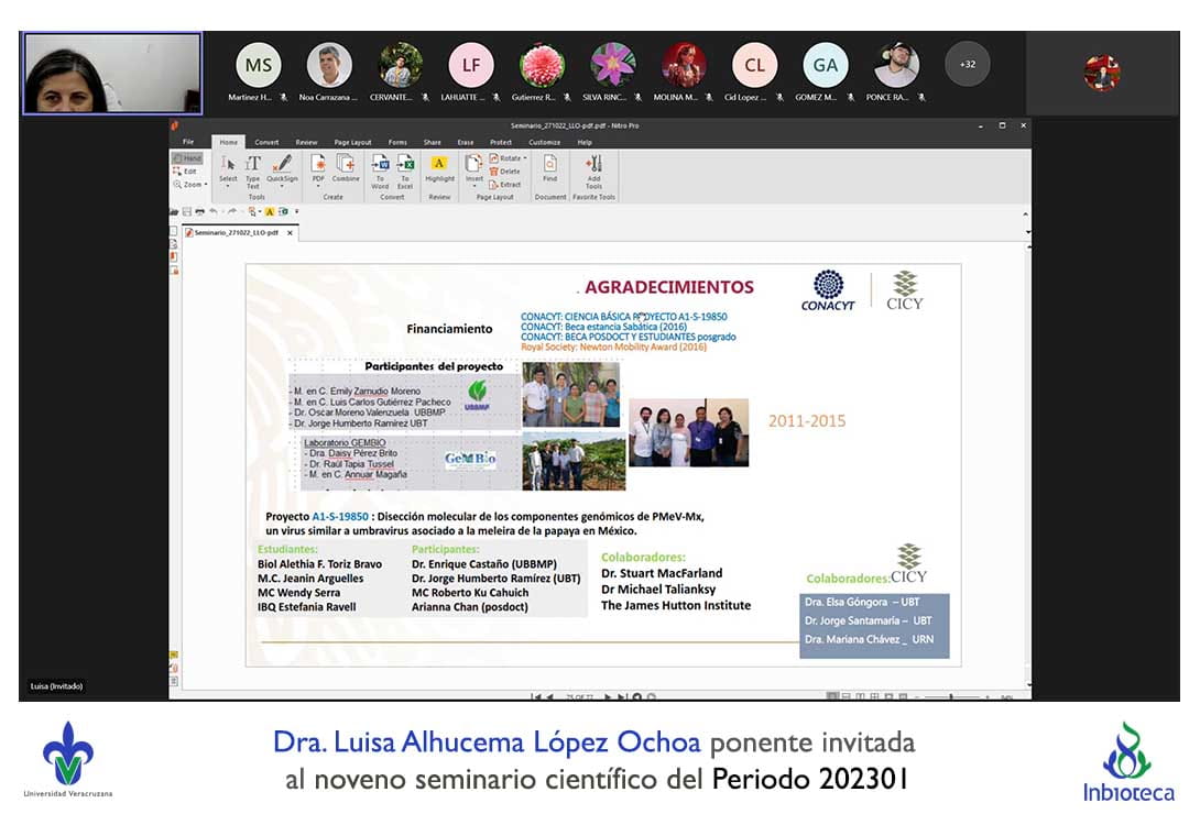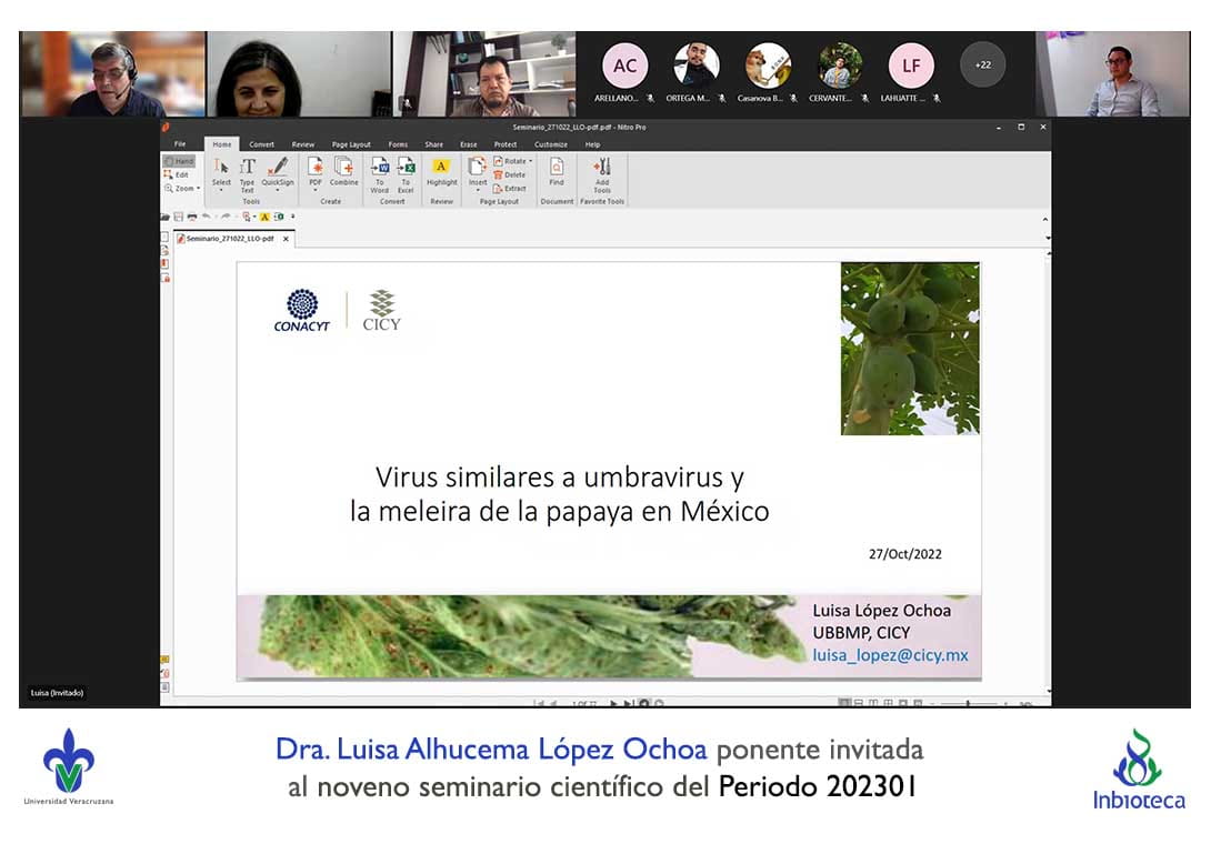 El seminario se desarrolló con la participación de la Dra. Luisa Alhucema López Ochoa Investigador titular de la Unidad Académica de Bioquímica y Biología Mollecular de Plantas en el Centro de Investigación Científica de Yucatán, A.C. (CICY). La conferencia se tituló: Virus similares a umbravirus y la meleira de la papaya en México.