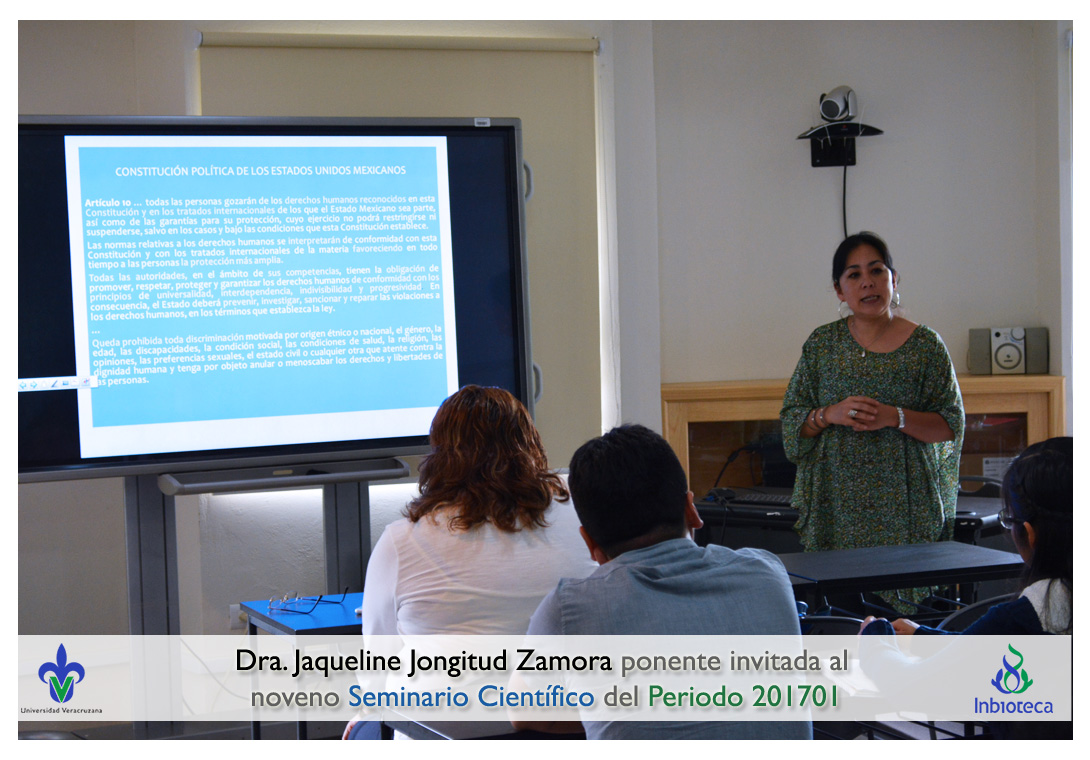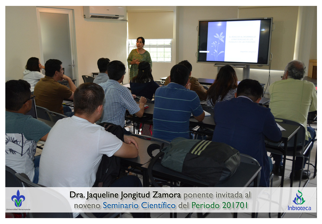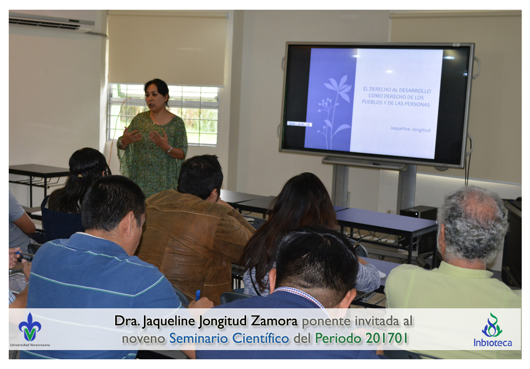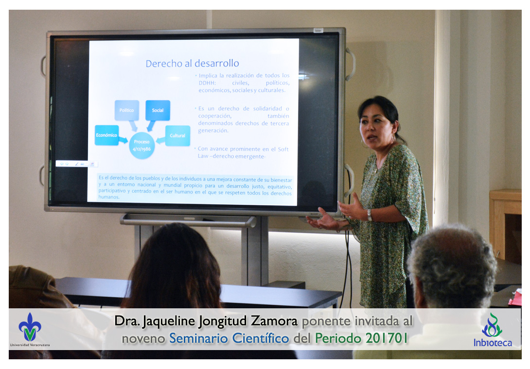 La ponente invitada fue la Dra. Jaqueline Jongitud Zamora Investigadora del Centro de Estudios sobre Derecho, Globalización y Seguridad (CEDEGS) de la Universidad veracruzana. La conferencia impartida fue "El derecho al desarrollo como derecho de los pueblos y de las personas".