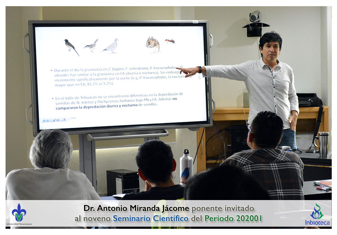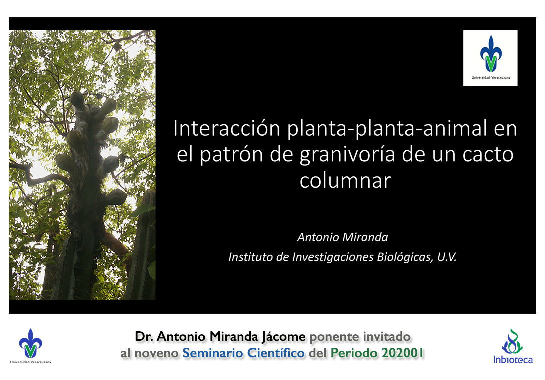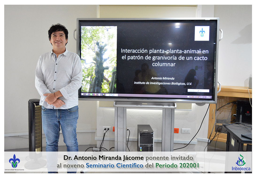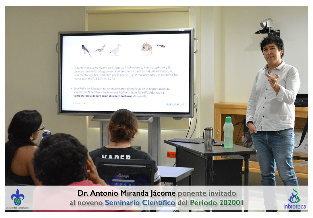 El ponente invitado fue el Dr. Antonio Miranda Jácome académico/investigador del Instituto de investigaciones Biológicas de la Universidad Veracruzana. La conferencia impartida fue "Interacción planta-planta-animal en el patrón de granivoría de un cacto columnar".