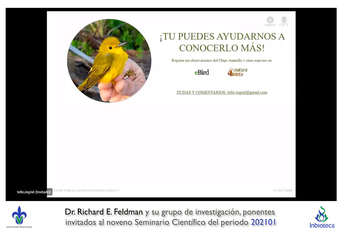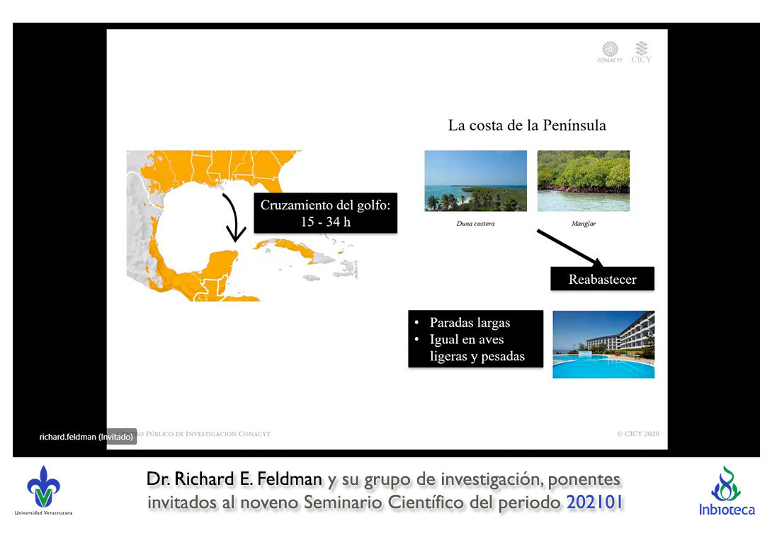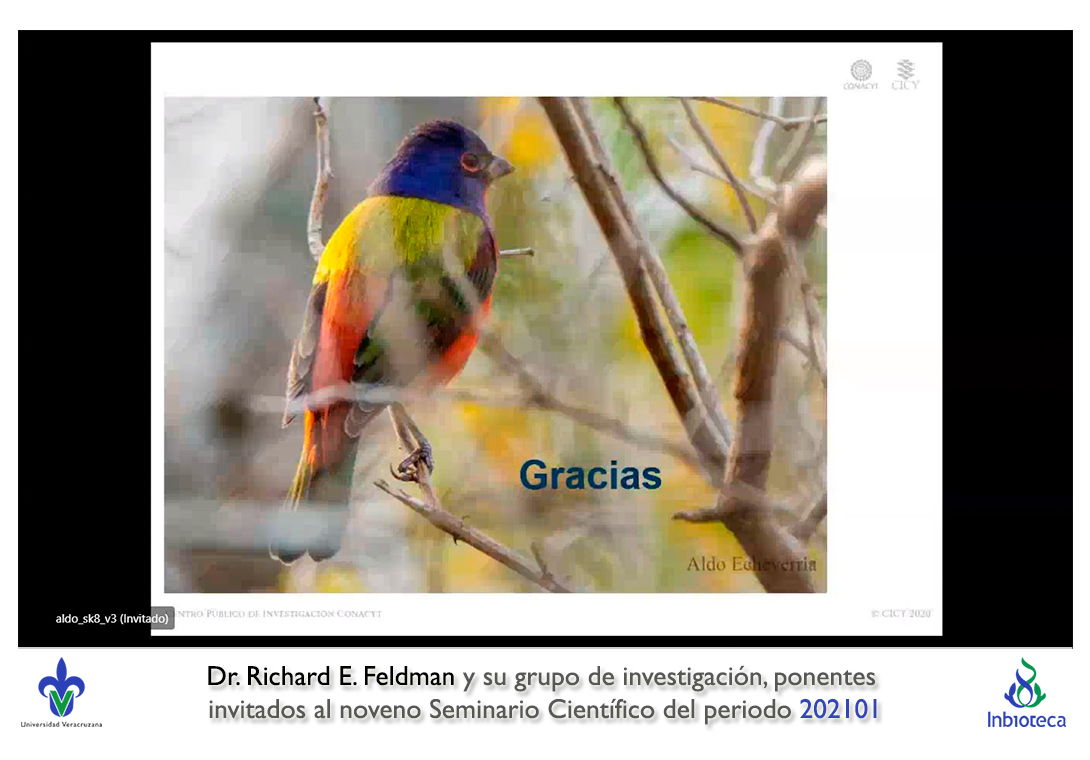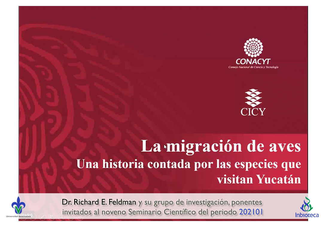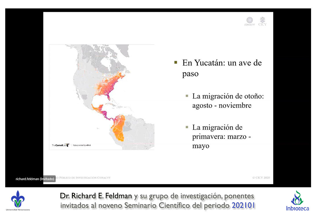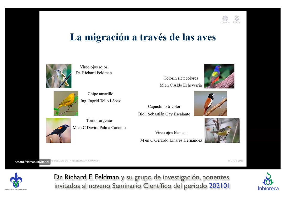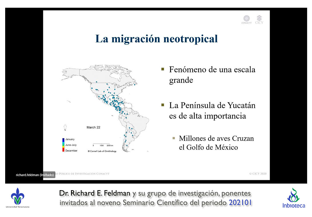 27 de noviembre de 2020.- En el "Aula Virtual" del INBIOTECA se realizó el noveno Seminario Científico para los estudiantes de posgrado Doctorado en Ciencias en Ecología y Biotecnología del ciclo Seminarios Científicos y Docencia 2020 (Periodo 202101). El ponente invitado fue el Dr. Richard E. Feldman de la Unidad de Recursos Naturales del Centro de Investigación Científica de Yucatán en Mérida, Yucatán, México. La conferencia impartida fue "La migración de aves: una historia contada por las especies que visitan la Península de Yucatán".