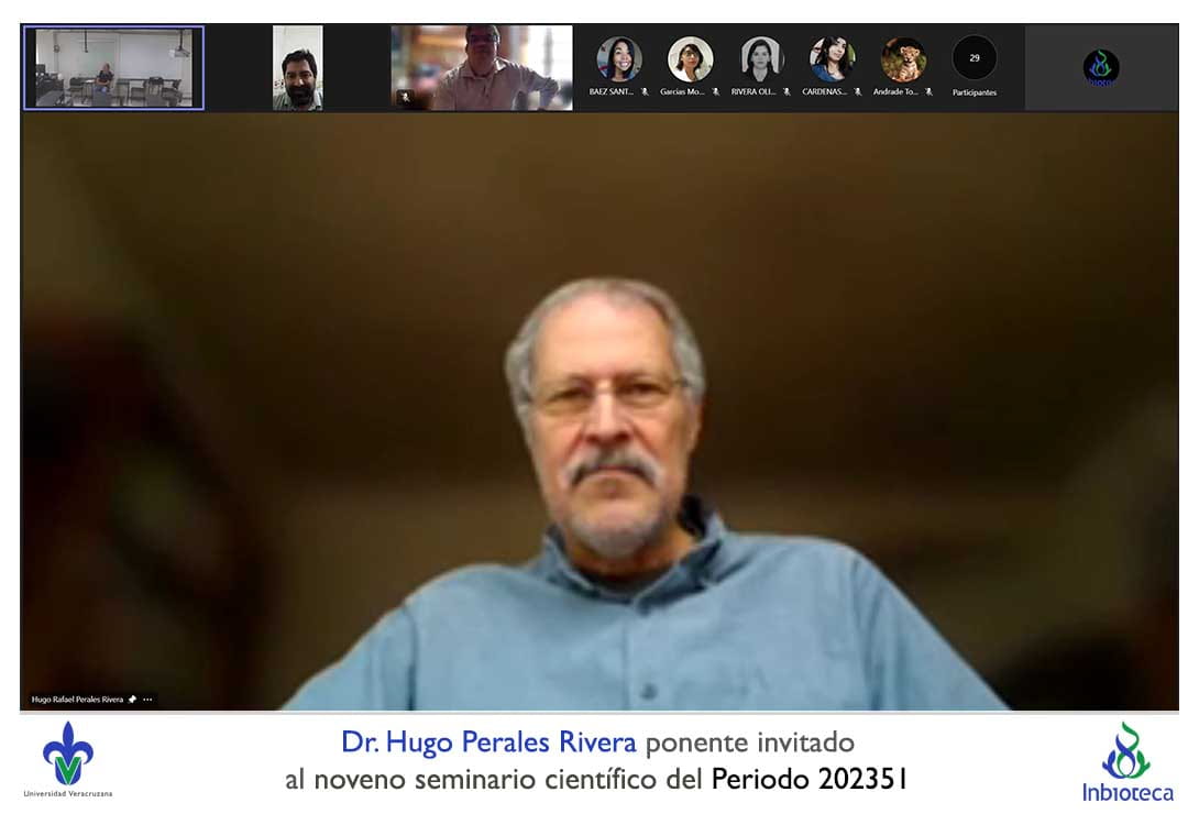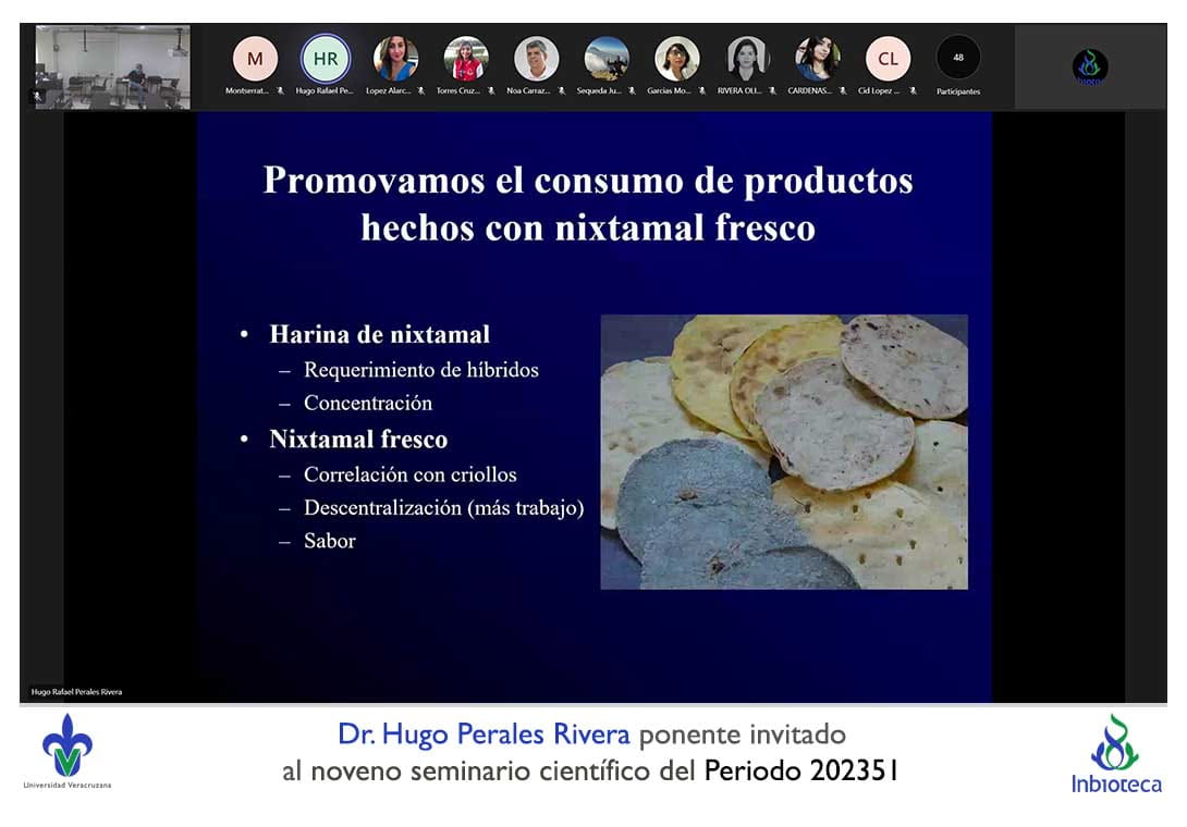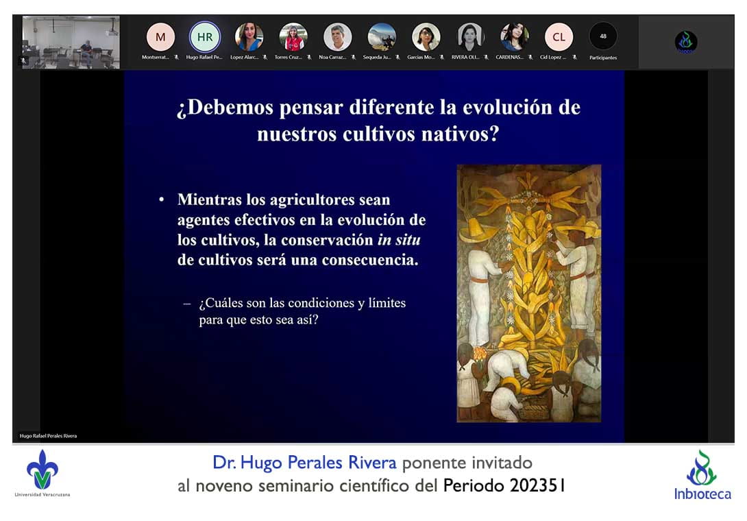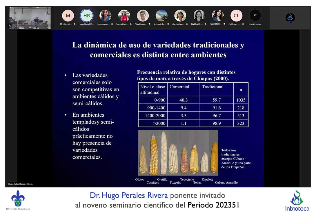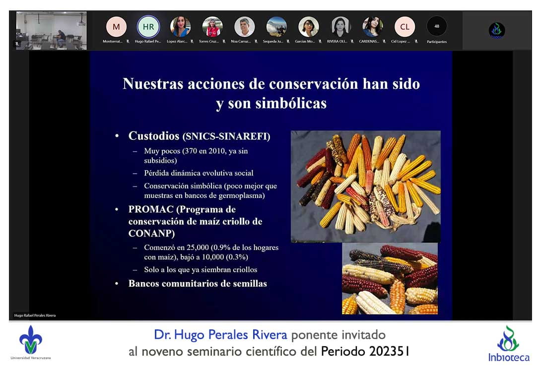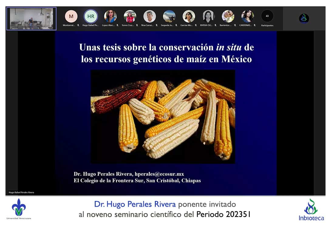 El seminario se desarrolló con la participación del Dr. Hugo Perales Rivera Investigador especialista en Ecología del El Colegio de la Frontera Sur (ECOSUR) en la Unidad San Cristóbal, chiapas, México. La conferencia se tituló: Una tesis sobre la conservación in situ de los recursos genéticos de maíz en México.