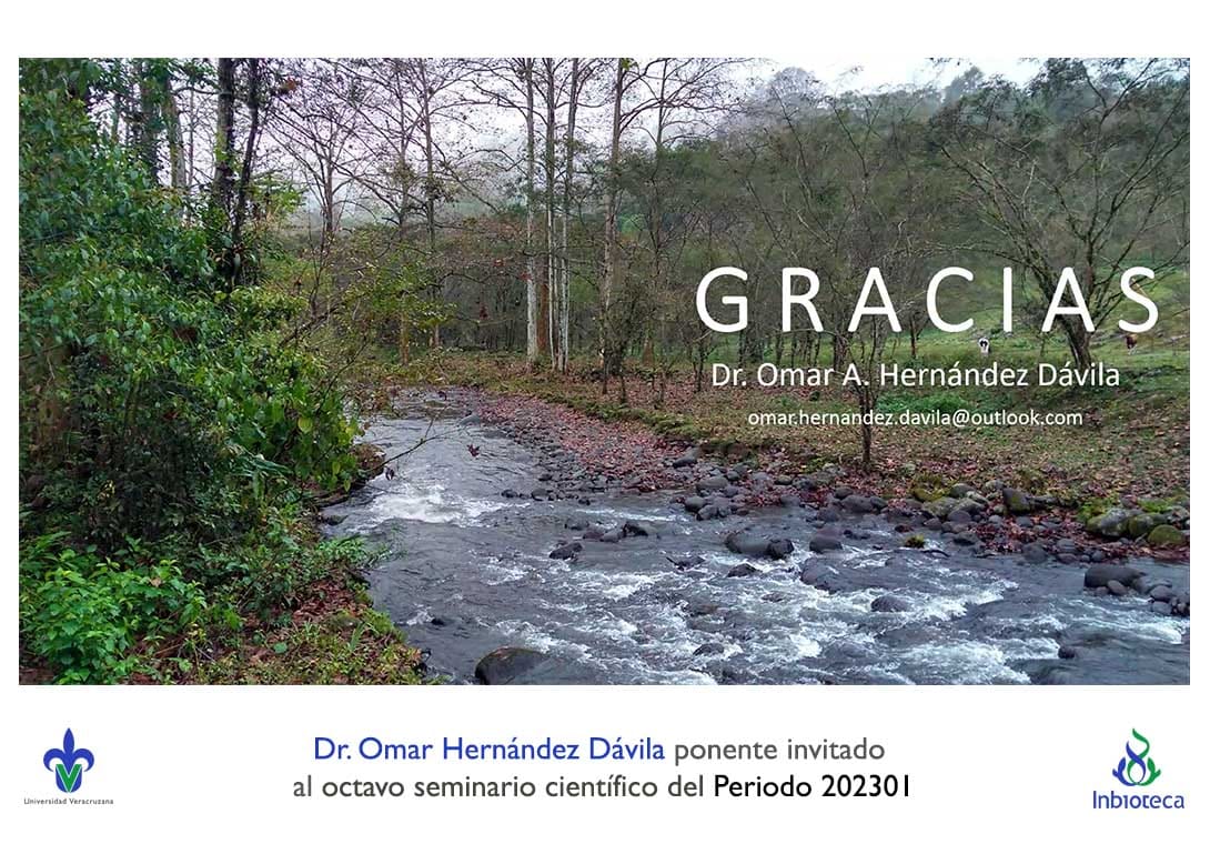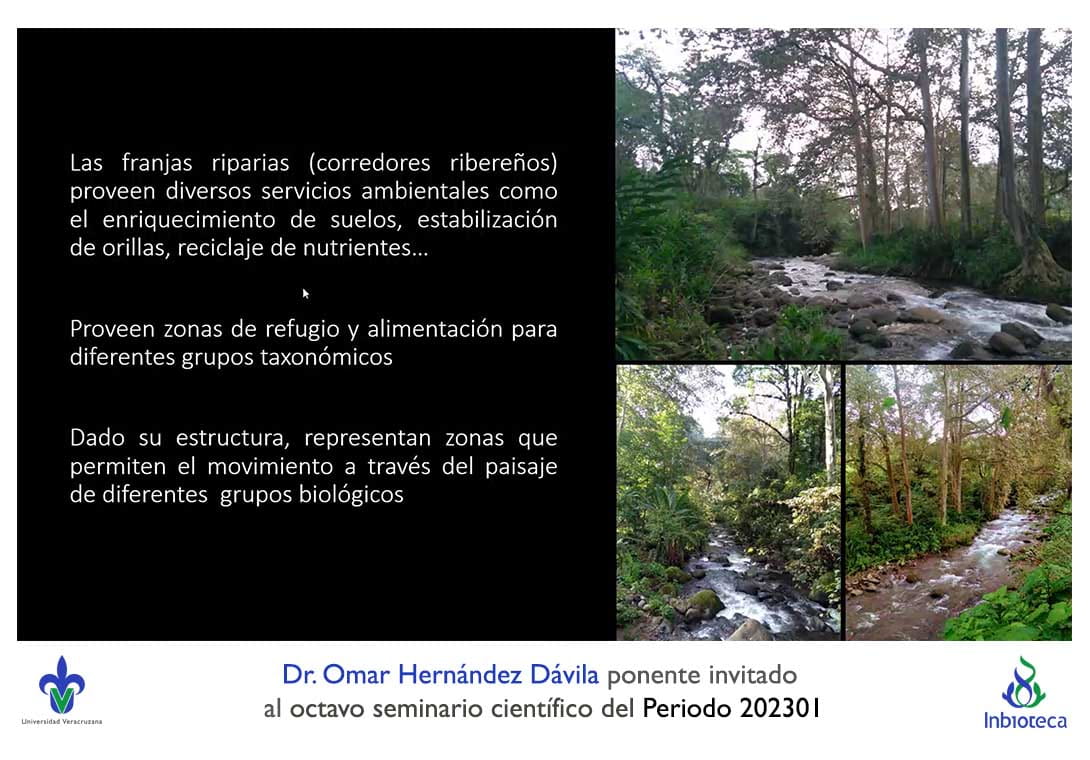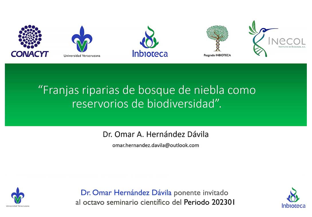 El seminario se desarrolló con la participación del Dr. Omar Hernández Dávila quién realiza una Estancia Posdoctoral en el Instituto de Biotecnología y Ecología Aplicada (INBIOTECA) de la Universidad Veraacruzana. La conferencia se tituló: Franjas riparias de bosque de niebla como reservorios de biodiversidad.