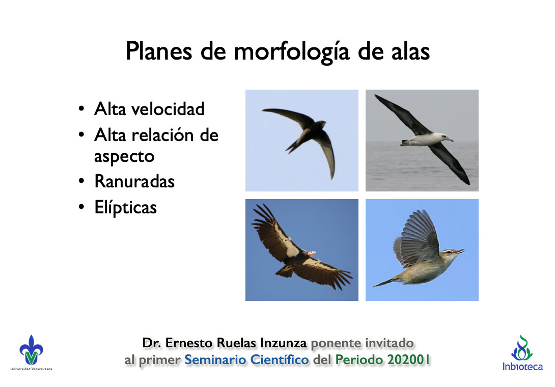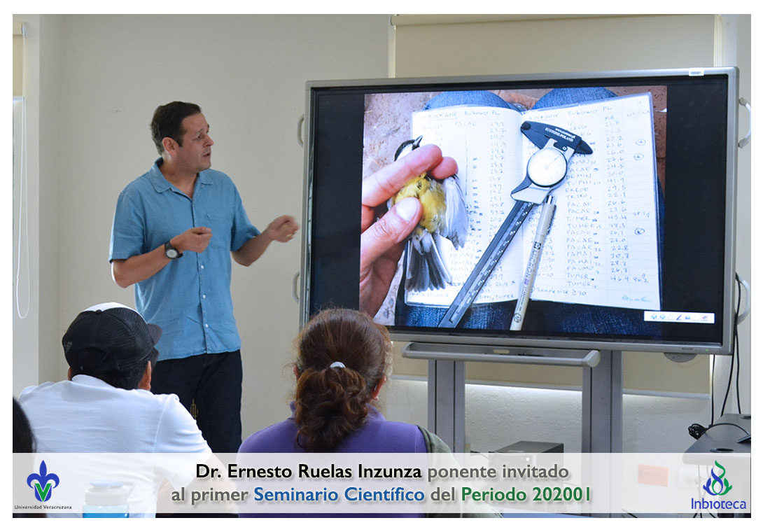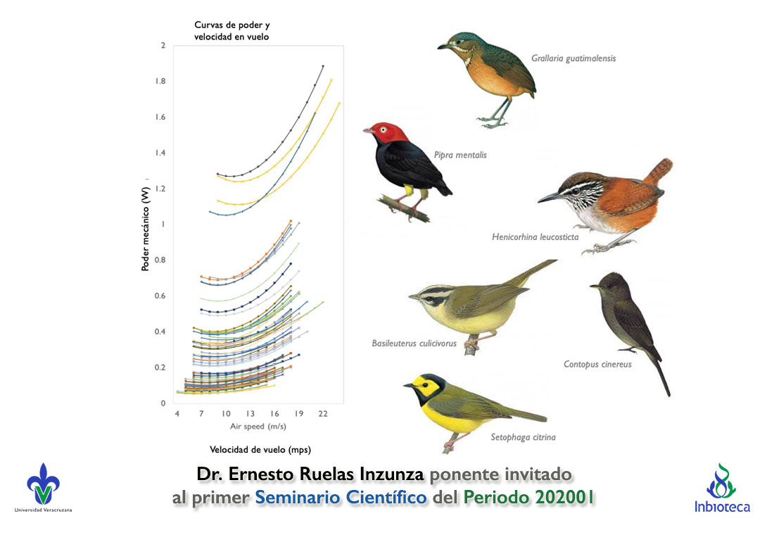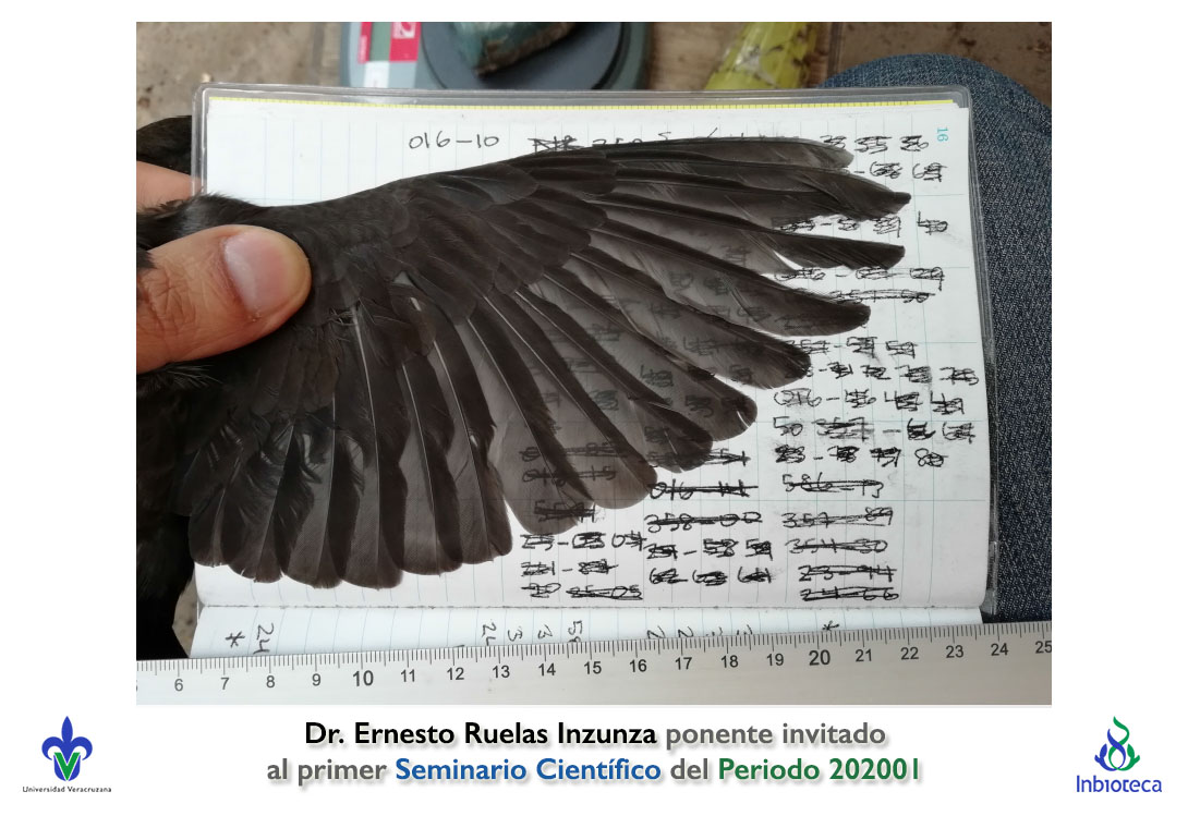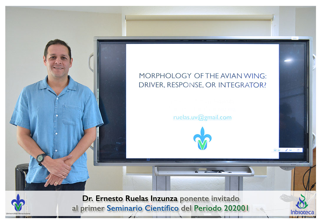 El ponente invitado fue el Dr. Ernesto Ruelas Inzunza académico/investigador del Cuerpo Académico: Estructura y Funcionamiento de Ecosistemas (UV-CA-324) del INBIOTECA-UV. La conferencia impartida fue "Morfología de las alas de las aves: Mecanismo conductor, variable respuesta o elemento integrador", donde se destaca que las alas pequeñas de las aves sedentarias hacen que el costo energético de volar sea mayor que en las aves migratorias. Esto tiene relación con la ecología y evolución de las especies.