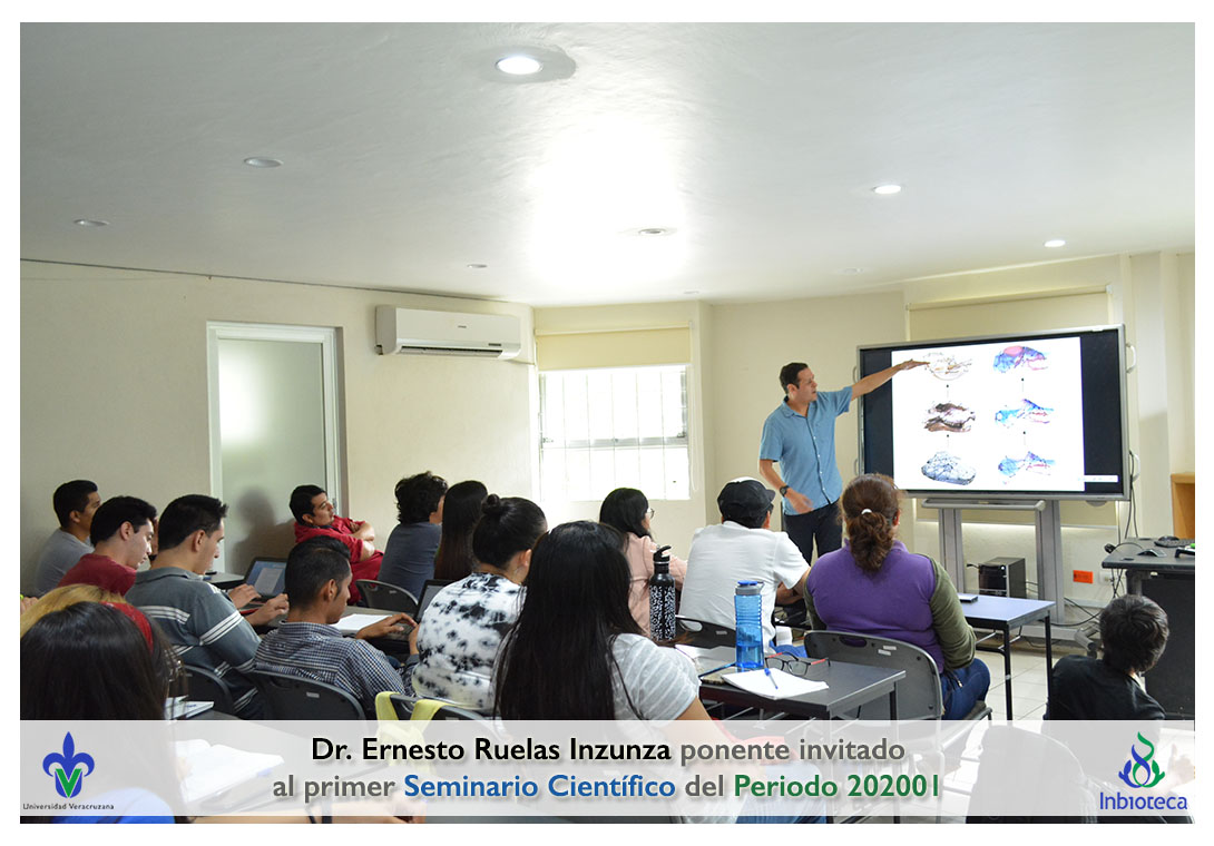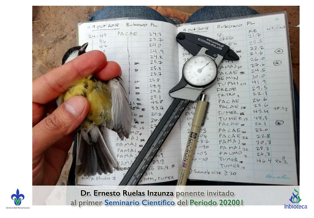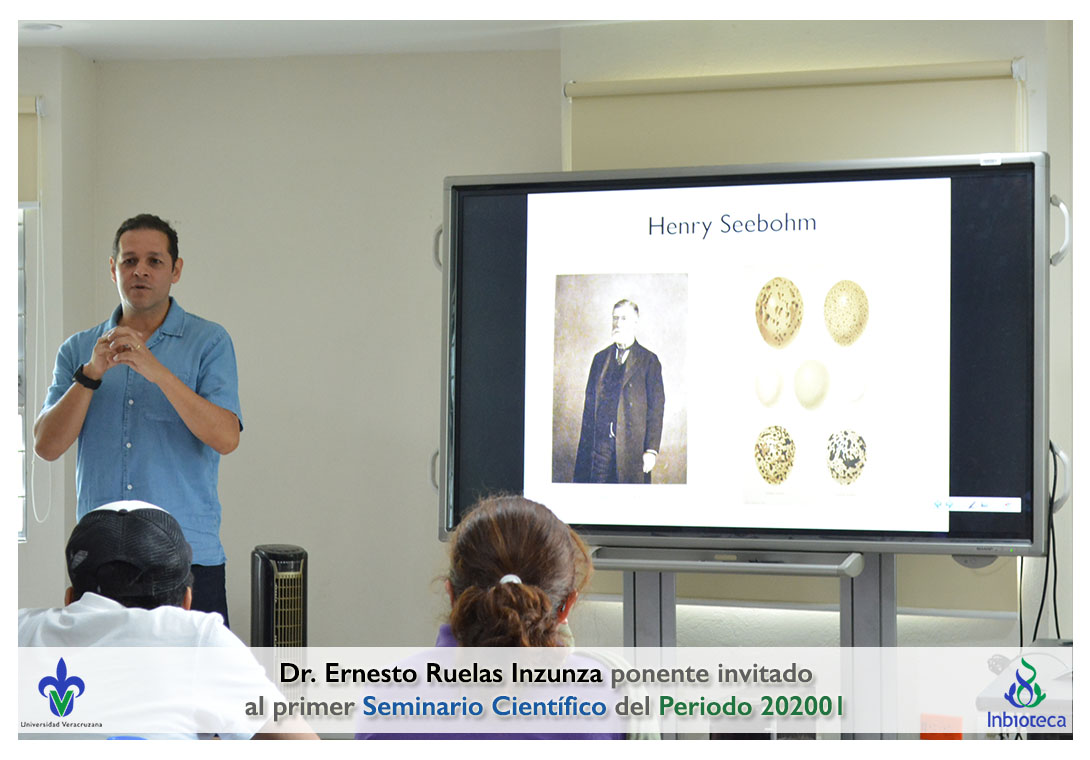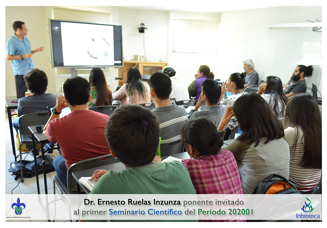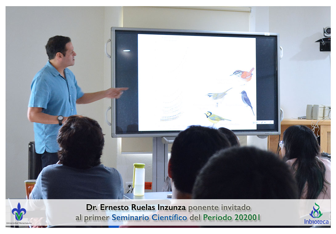 El ponente invitado fue el Dr. Ernesto Ruelas Inzunza académico/investigador del Cuerpo Académico: Estructura y Funcionamiento de Ecosistemas (UV-CA-324) del INBIOTECA-UV. La conferencia impartida fue "Morfología de las alas de las aves: Mecanismo conductor, variable respuesta o elemento integrador", donde se destaca que las alas pequeñas de las aves sedentarias hacen que el costo energético de volar sea mayor que en las aves migratorias. Esto tiene relación con la ecología y evolución de las especies.