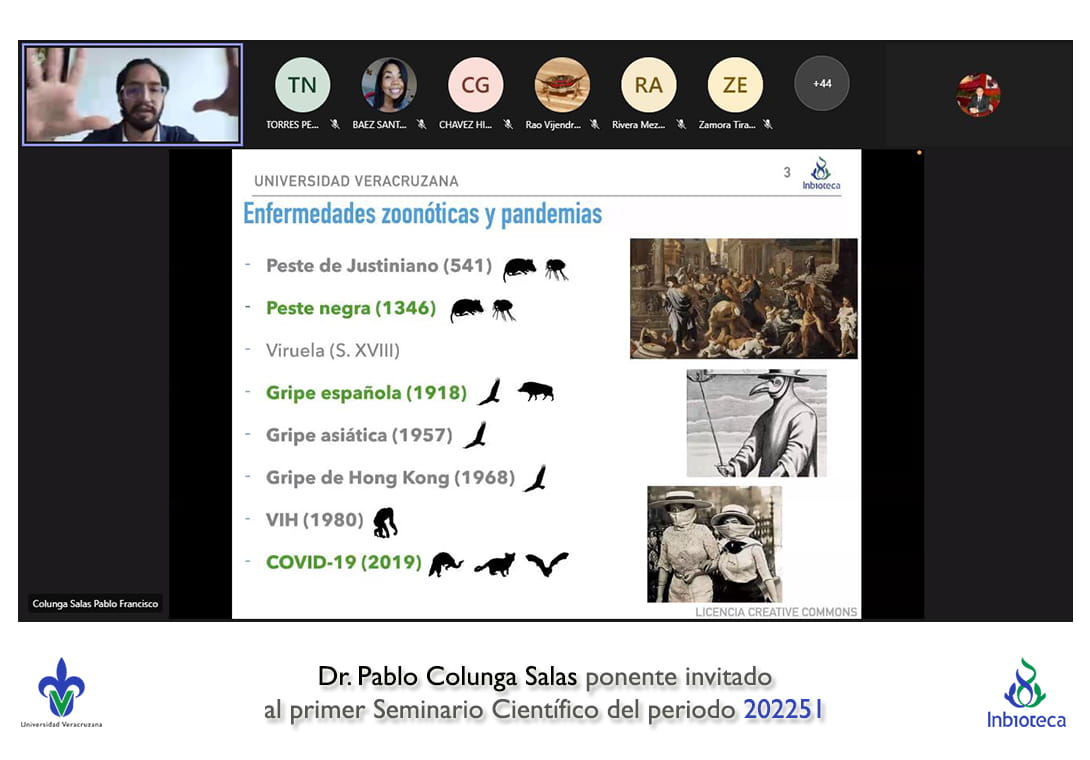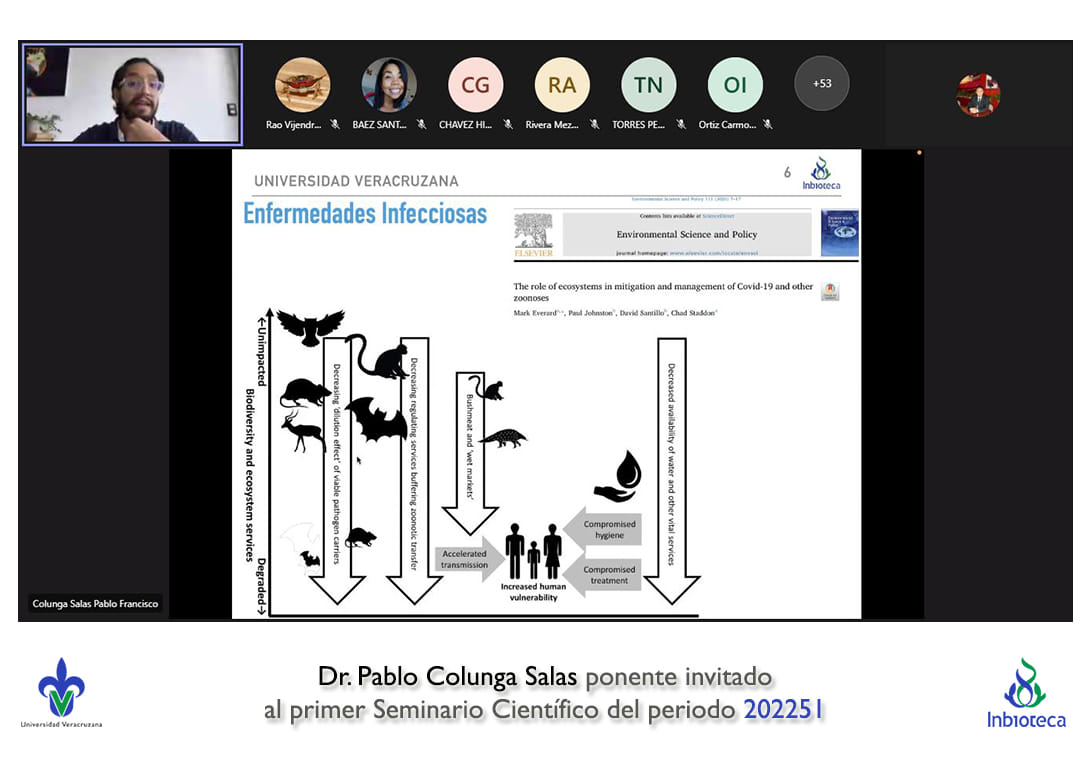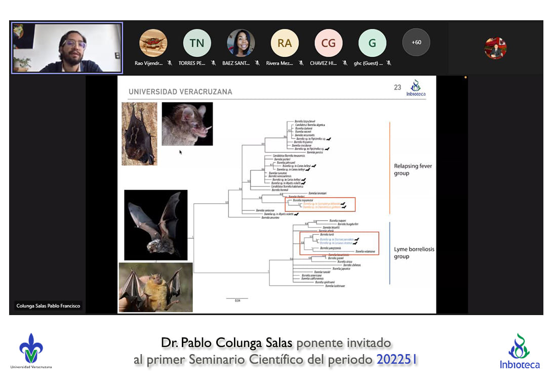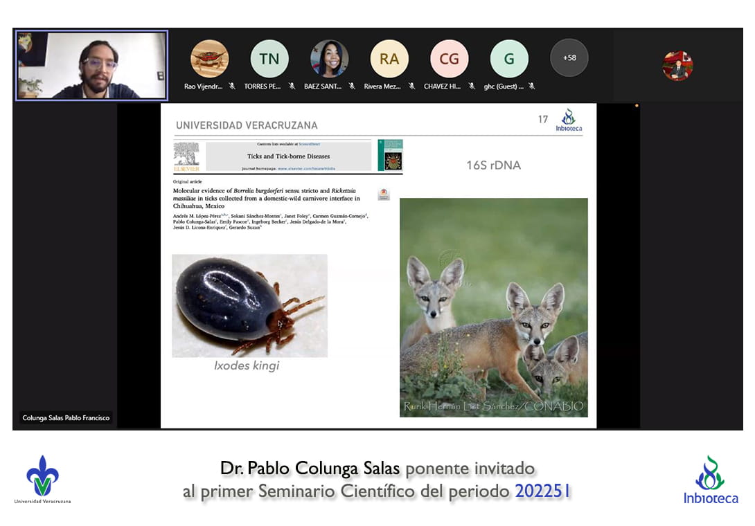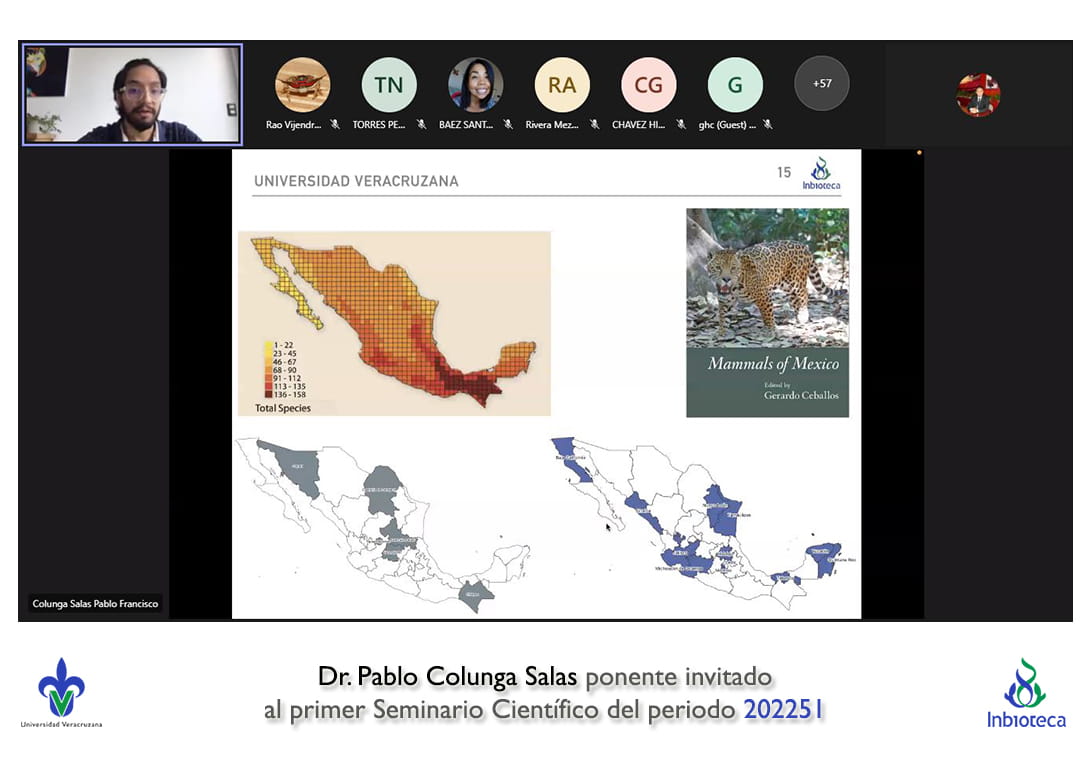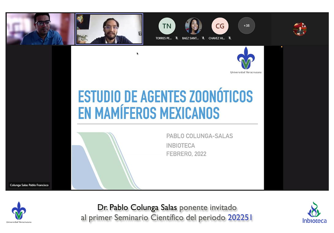 El seminario se desarrolló con la participación del Dr. Pablo Colunga Salas técnico académico del Instituto de Biotecnología y Ecología aplicada de la Universidad Veracruzana. La conferencia se tituló: Estudio de agentes zoonóticos en mamíferos mexicanos.
