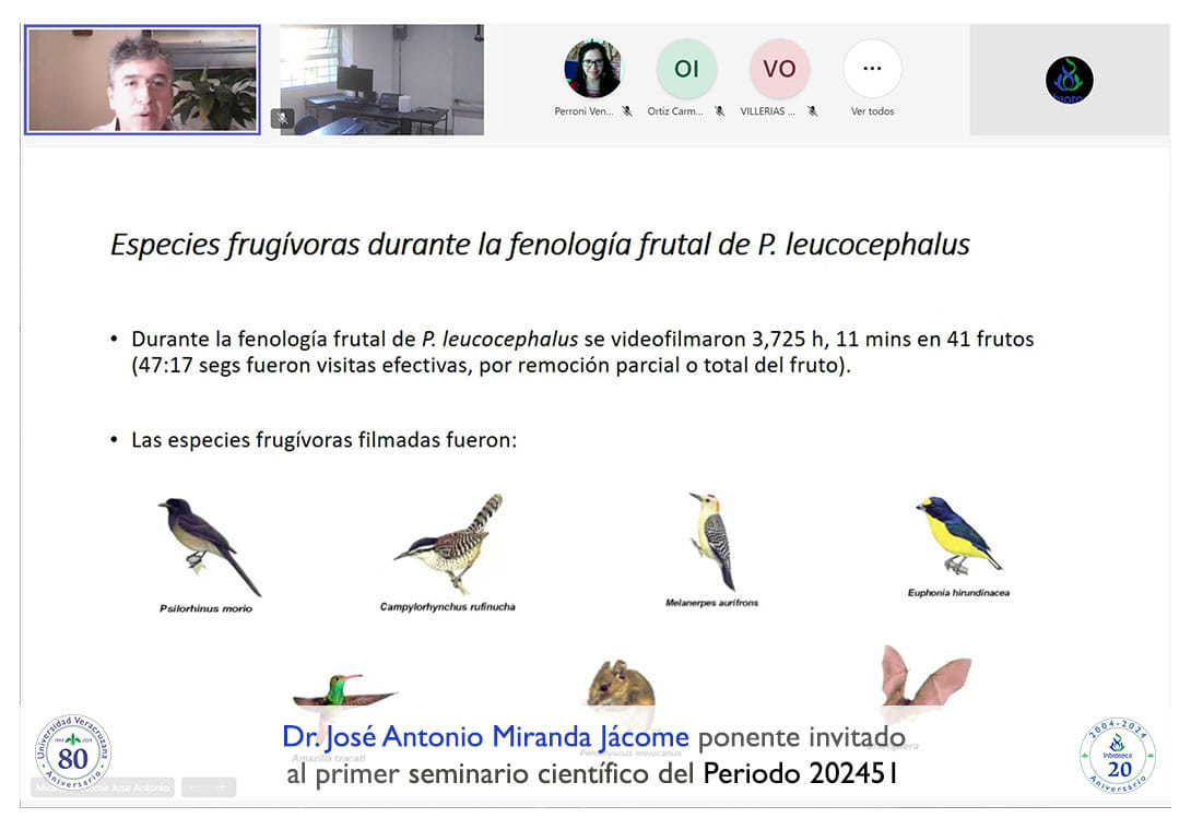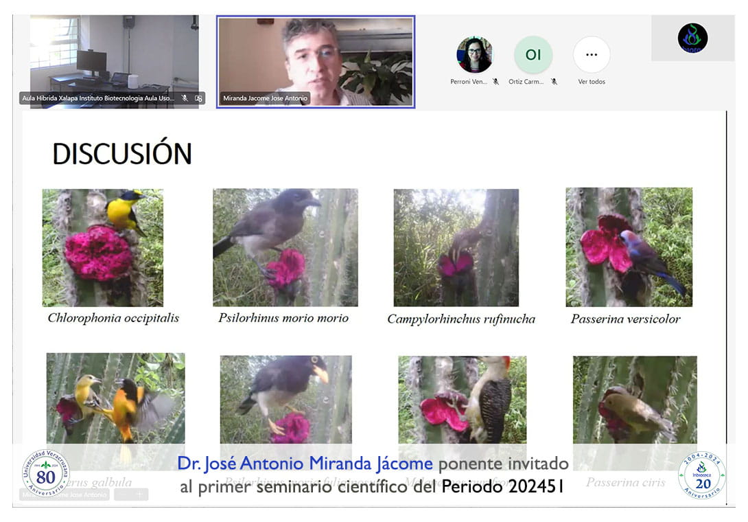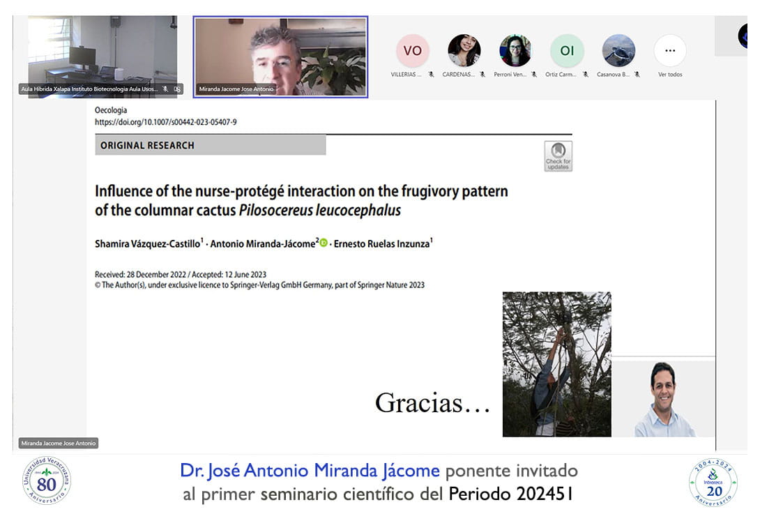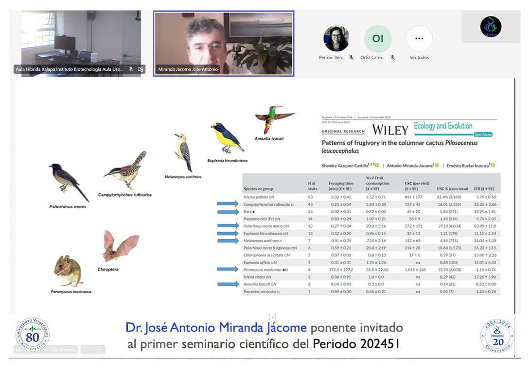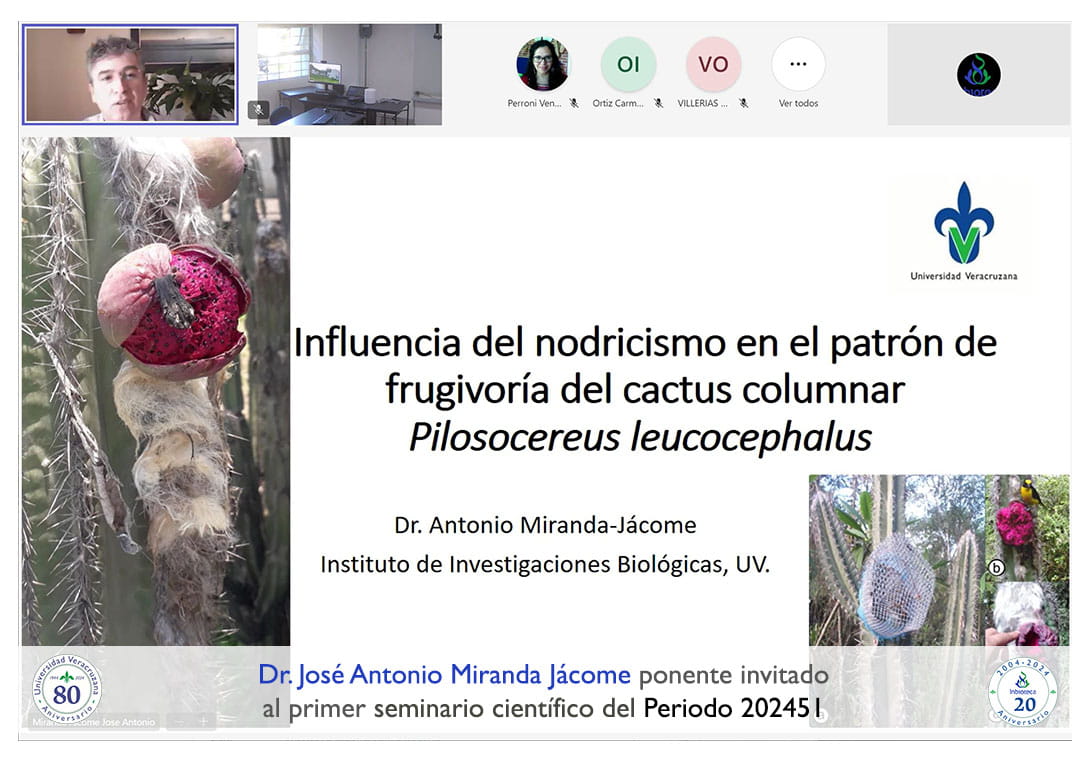 El seminario se desarrolló con la participación del Dr. José Antonio Miranda Jácome Investigador del Instituto de Investigaciones Biológicas de la Universidad Veracruzana. La conferencia se tituló: Influencia del nodricismo en el patrón de frugívora del cactus columnar Pilosocereus leucocephalus.