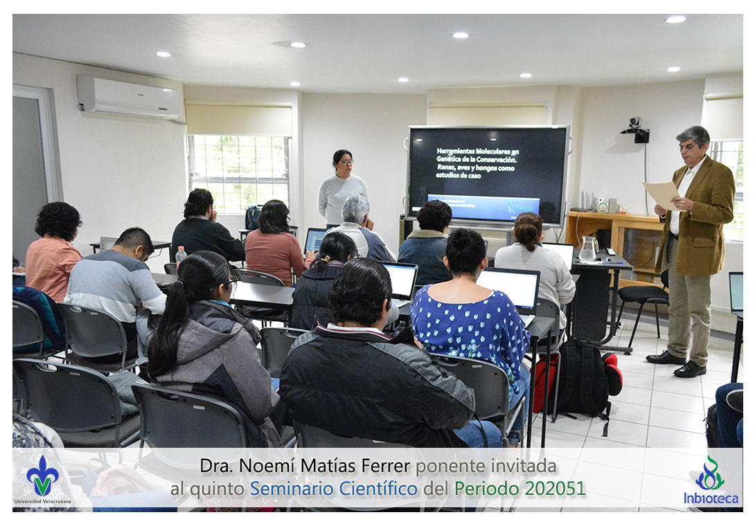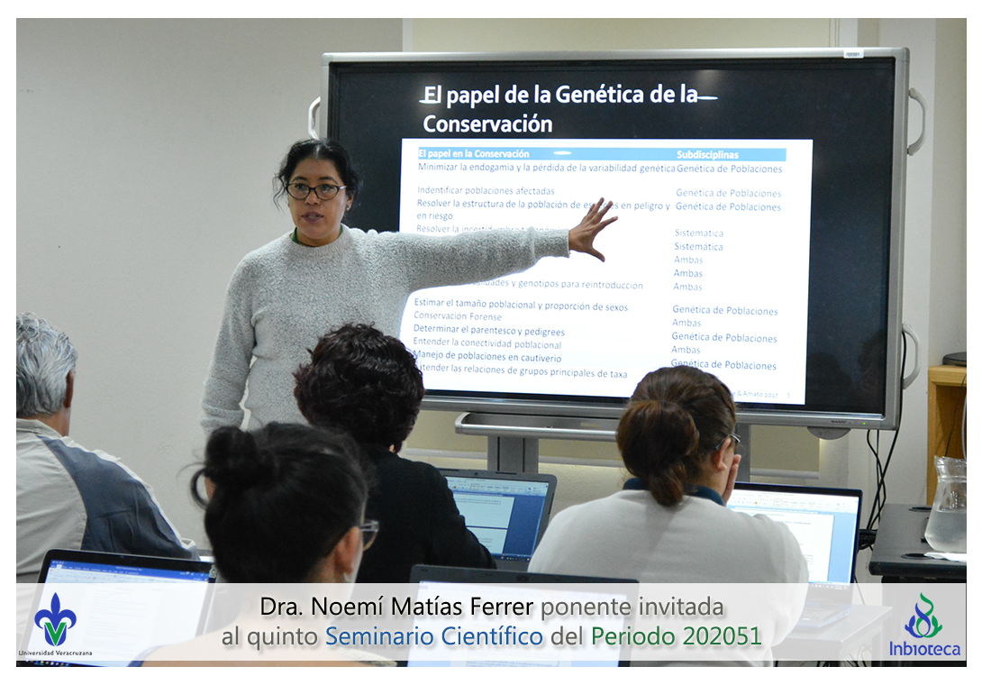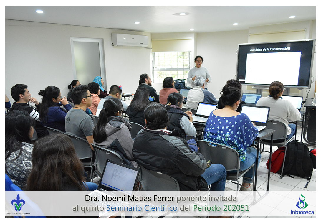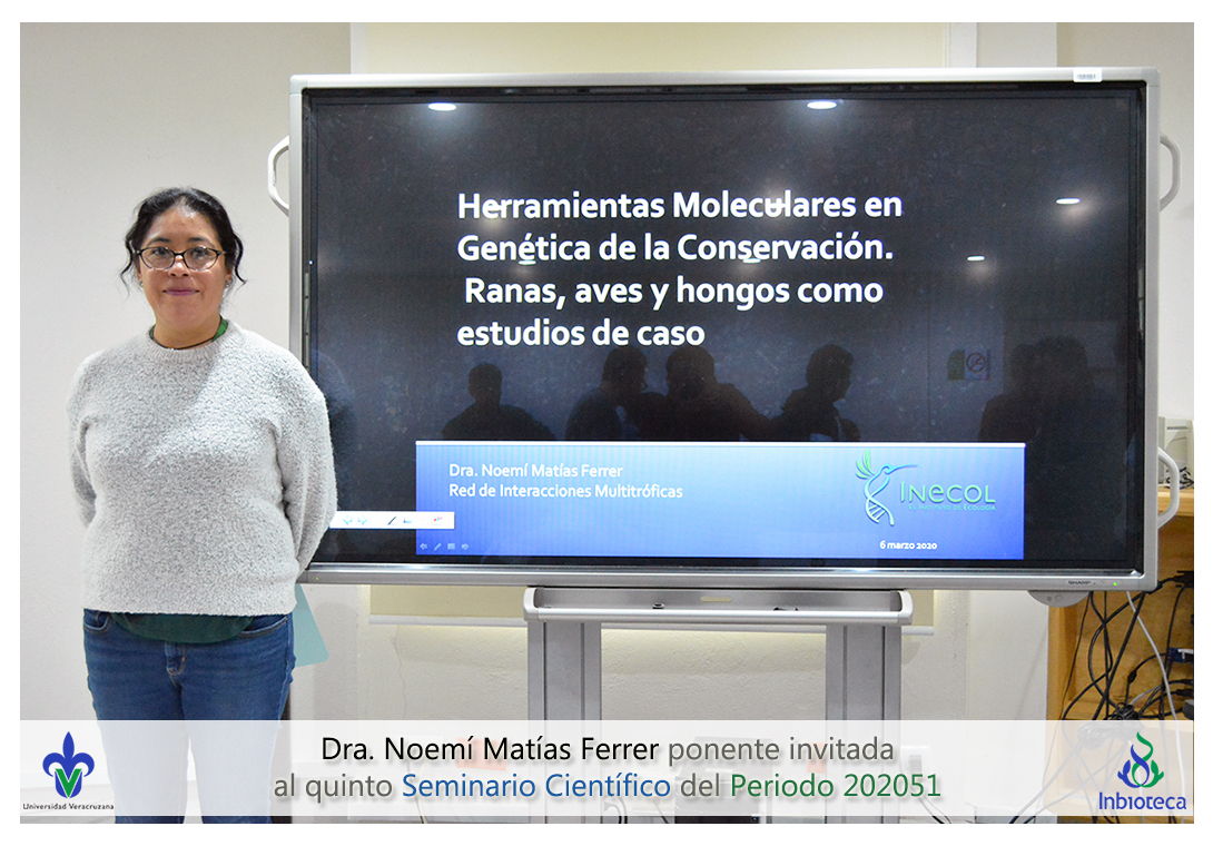 La ponente invitada fue la Dra. Noemí Matías Ferrer Técnico titular de la Red de Interacciones Multitróficas de la Instituto de Ecología, A. C. (INECOL). La conferencia impartida fue "Herramientas Moleculares en Genética de la Conservación. Ranas, aves y hongos como estudios de caso"