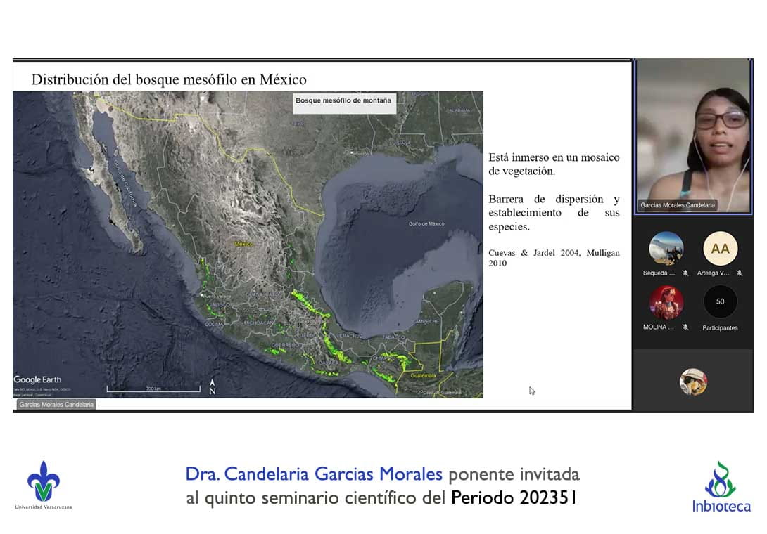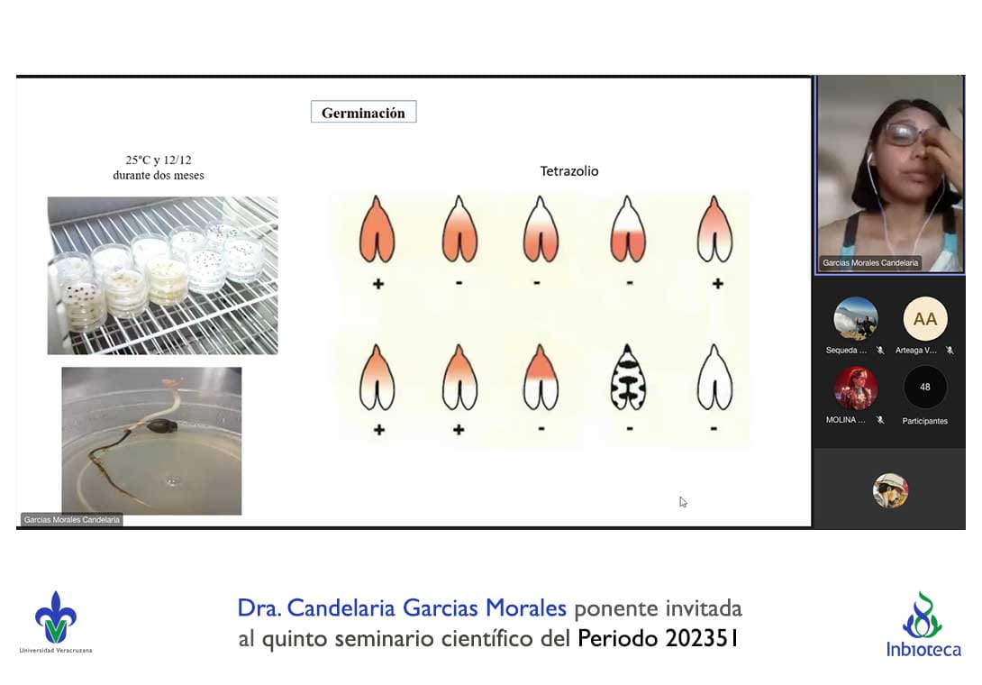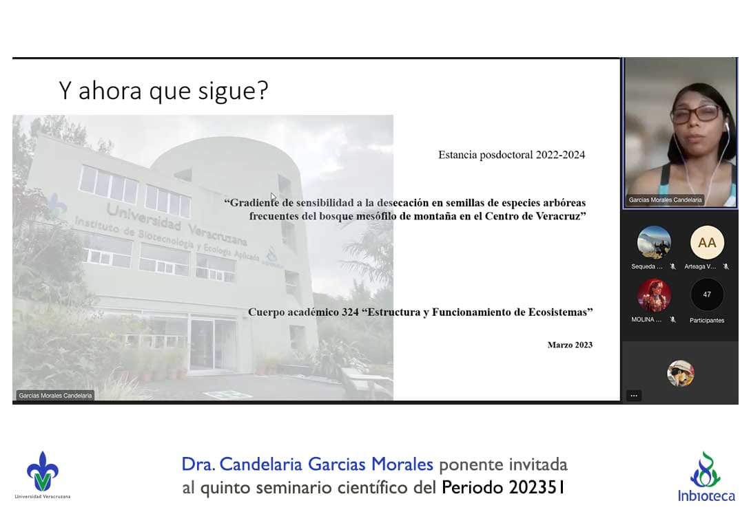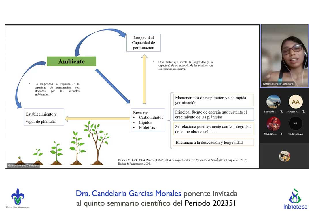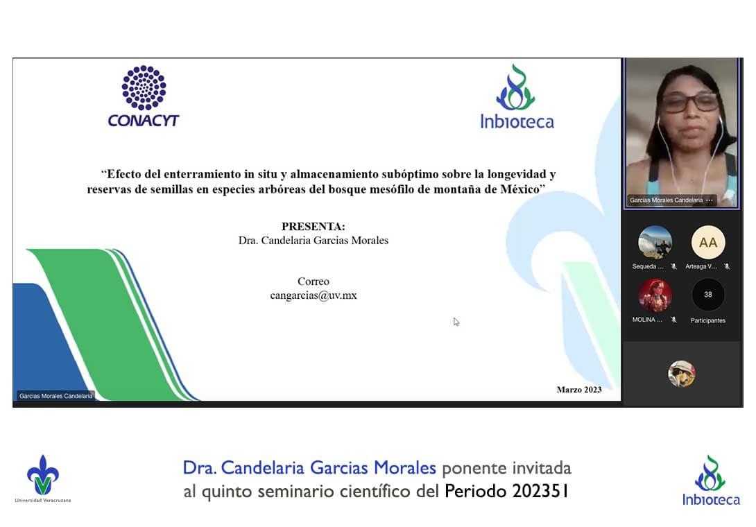 El seminario se desarrolló con la participación del Dra. Candelaria Garcias Morales Investigadora Posdoctoral CONACYT adscrita al Instituto de Biotecnología y Ecología Aplicada de la Universidad Veracruzana. La conferencia se tituló: Efecto del enterramiento in situ y almacenamiento subóptimo sobre la longevidad y reservas de semillas en especies arbóreas del bosque mesófilo de montaña de México.