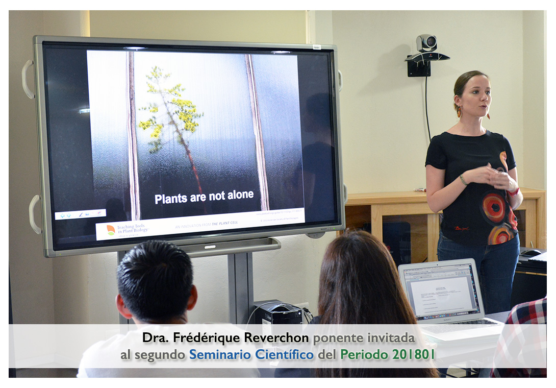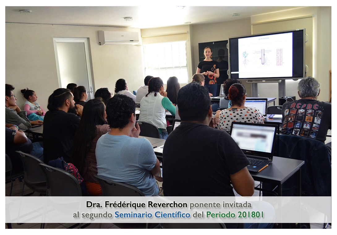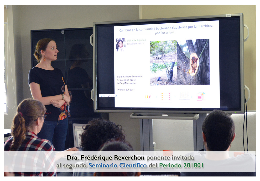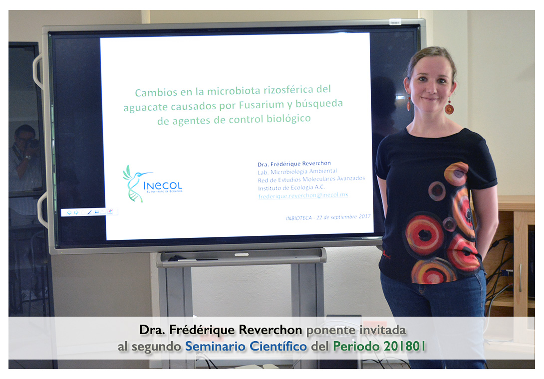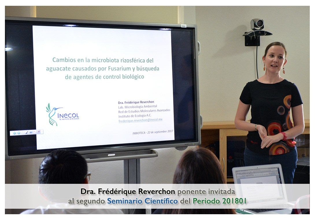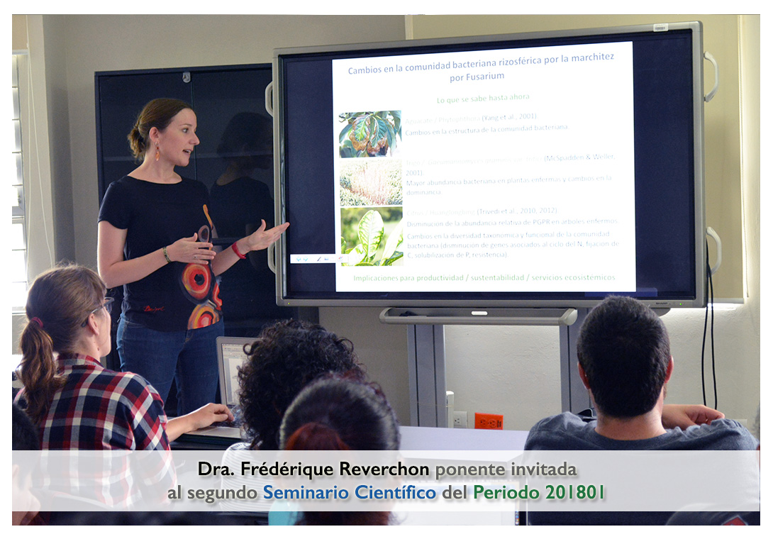 La ponente invitada fue la Dra. Frédérique Reverchon de la Red de Estudios Moleculares Avanzados – Campus III del Instituto de Ecología A.C. (INECOL). La conferencia impartida fue "Cambios en la microbiota rizosférica del aguacate causados por Fusarium y búsqueda de agentes de control biológico".