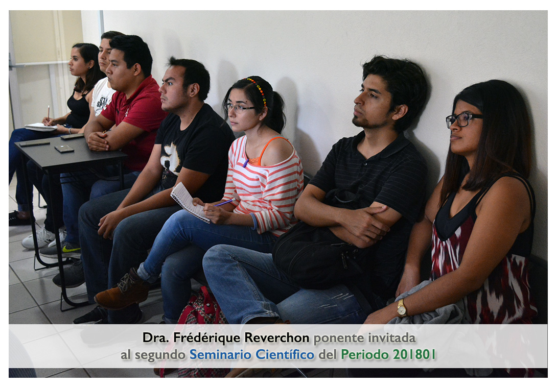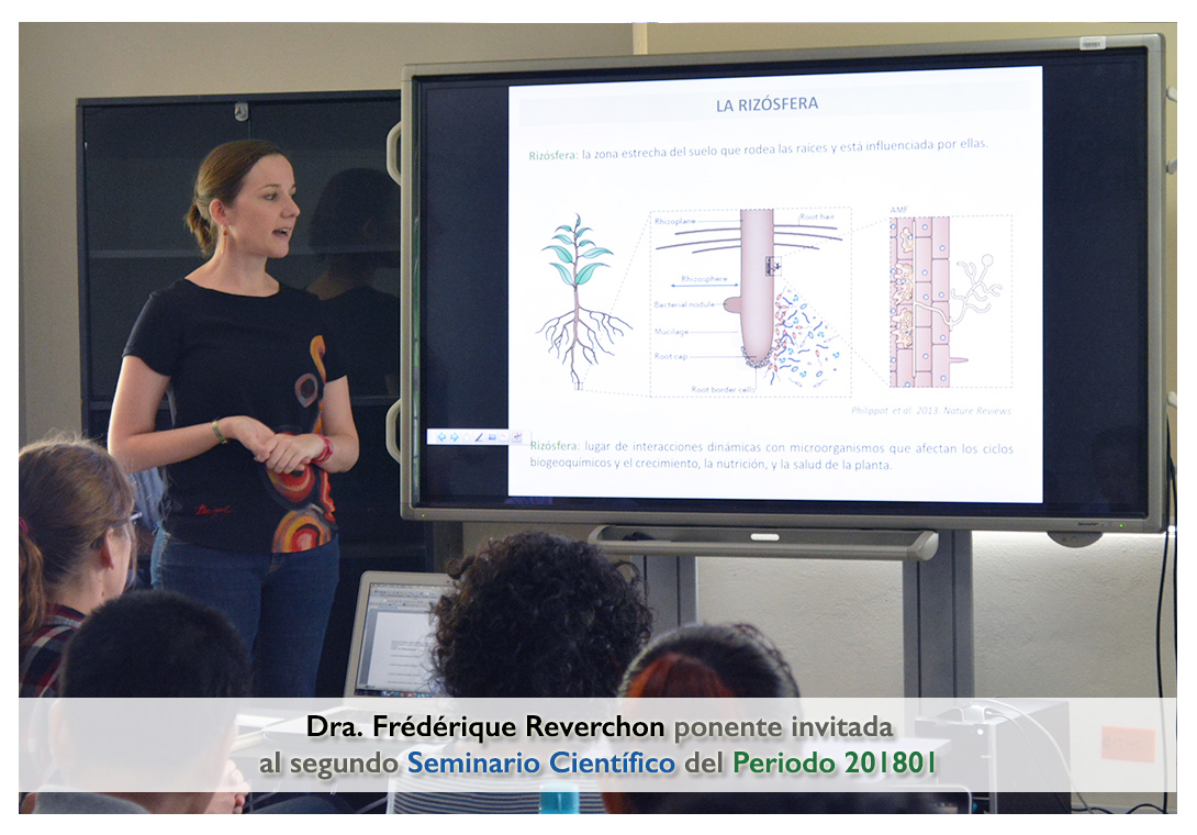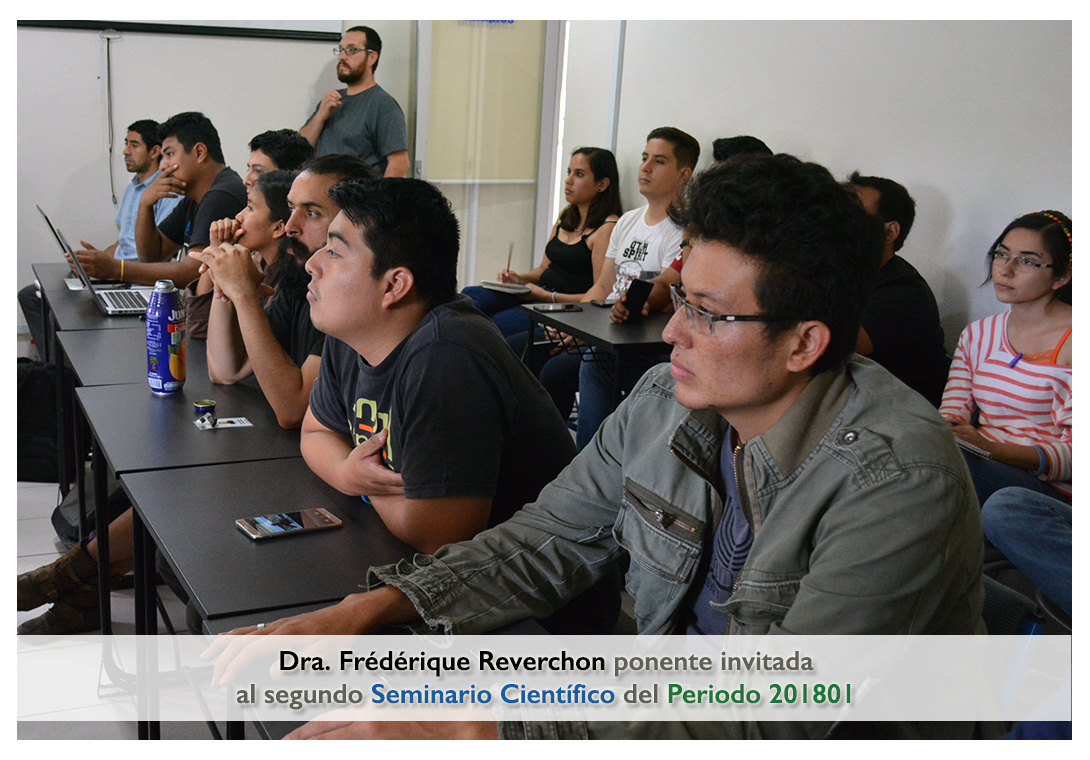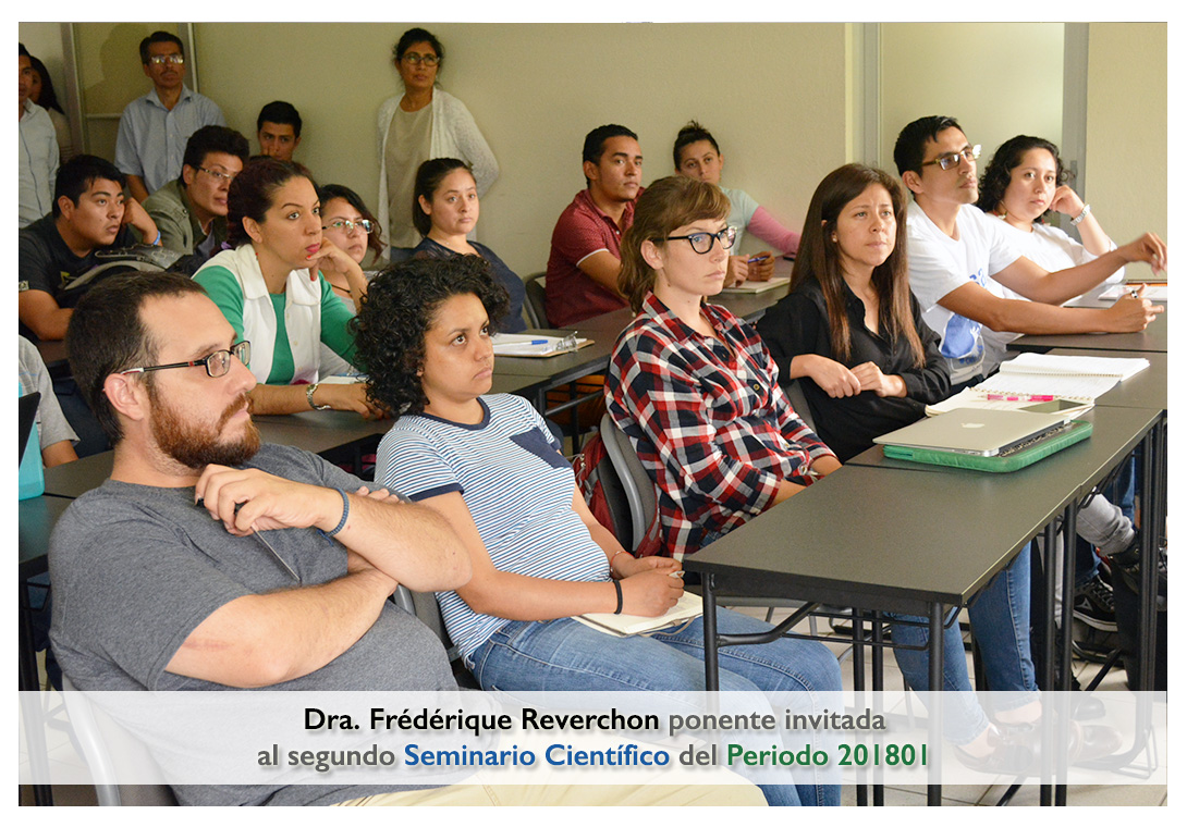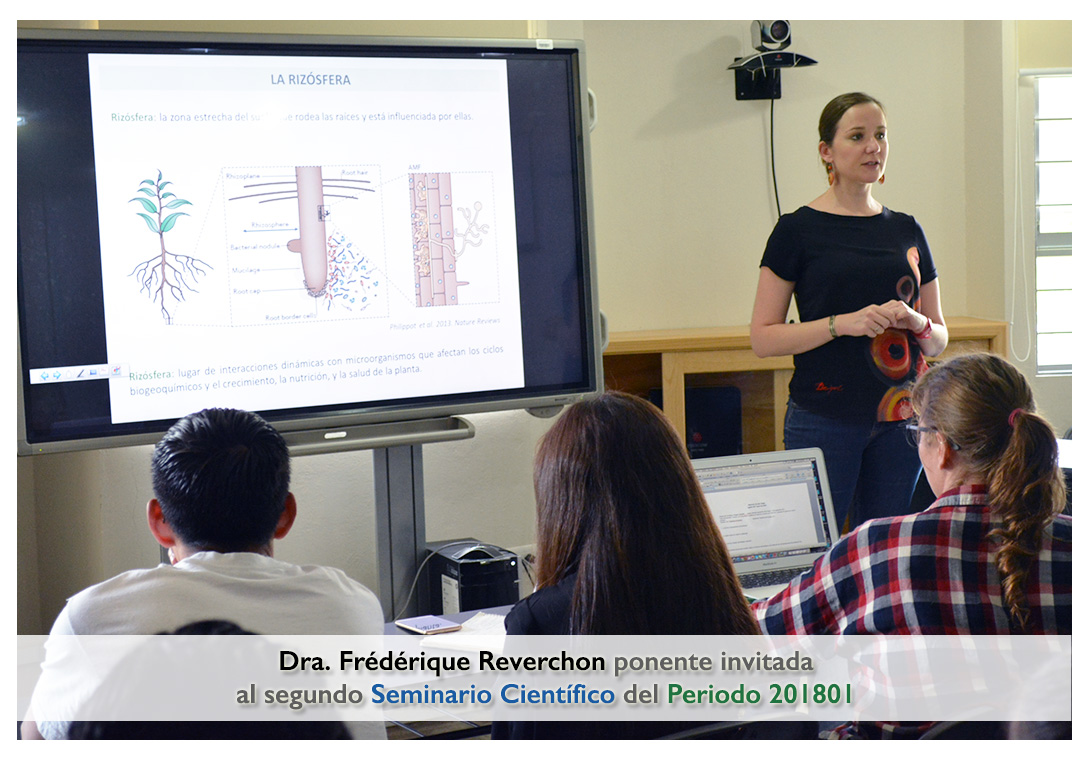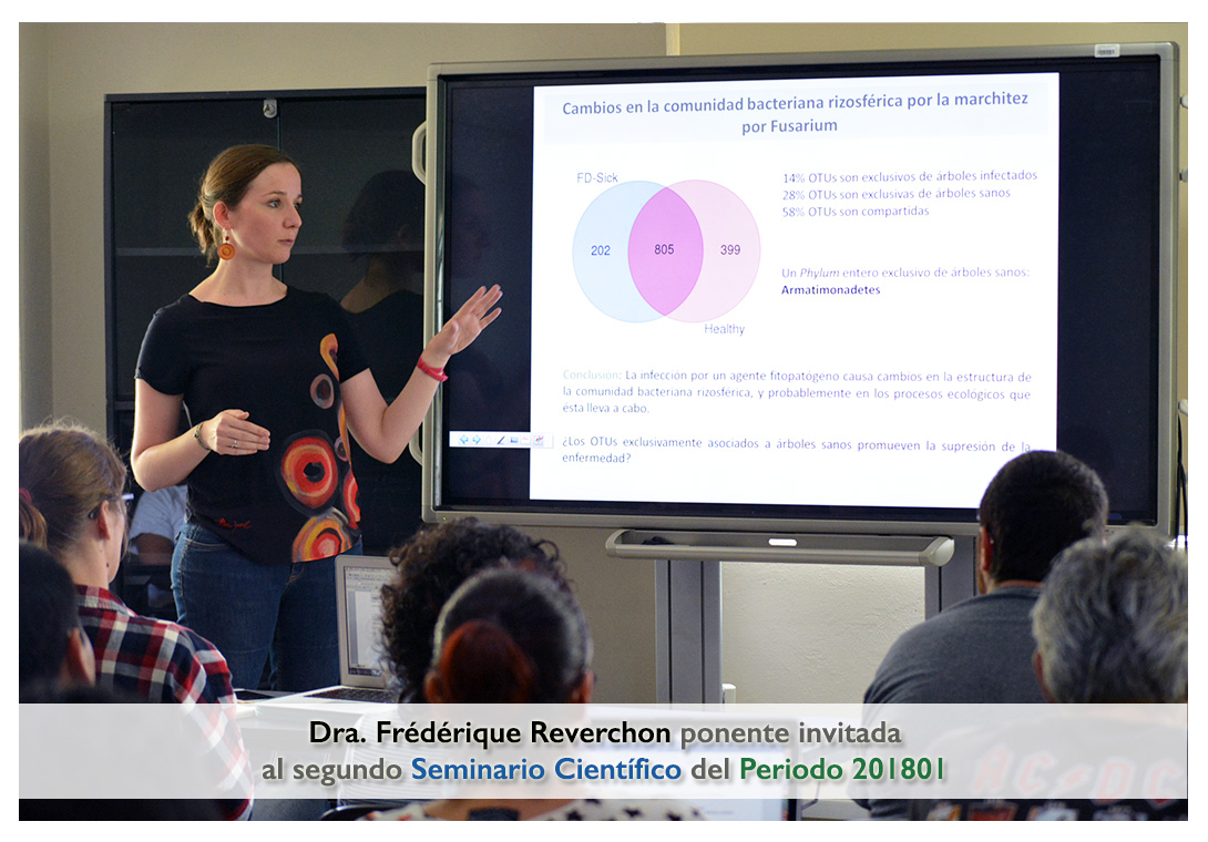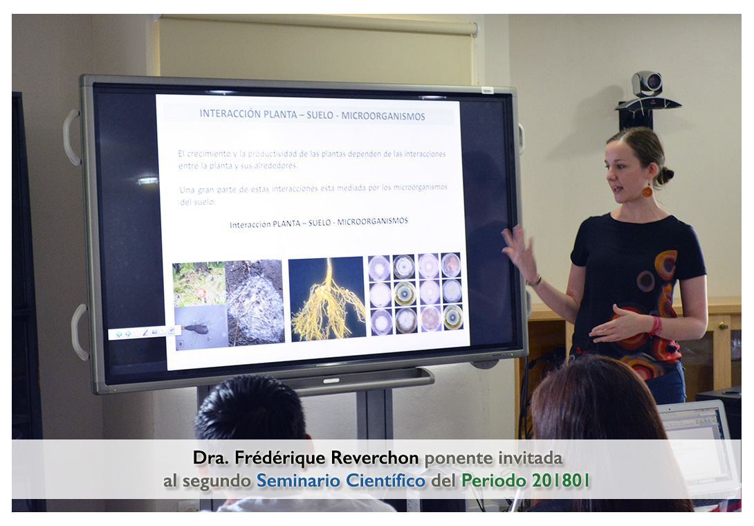 La ponente invitada fue la Dra. Frédérique Reverchon de la Red de Estudios Moleculares Avanzados – Campus III del Instituto de Ecología A.C. (INECOL). La conferencia impartida fue "Cambios en la microbiota rizosférica del aguacate causados por Fusarium y búsqueda de agentes de control biológico".