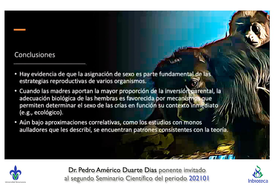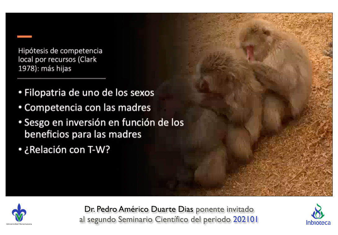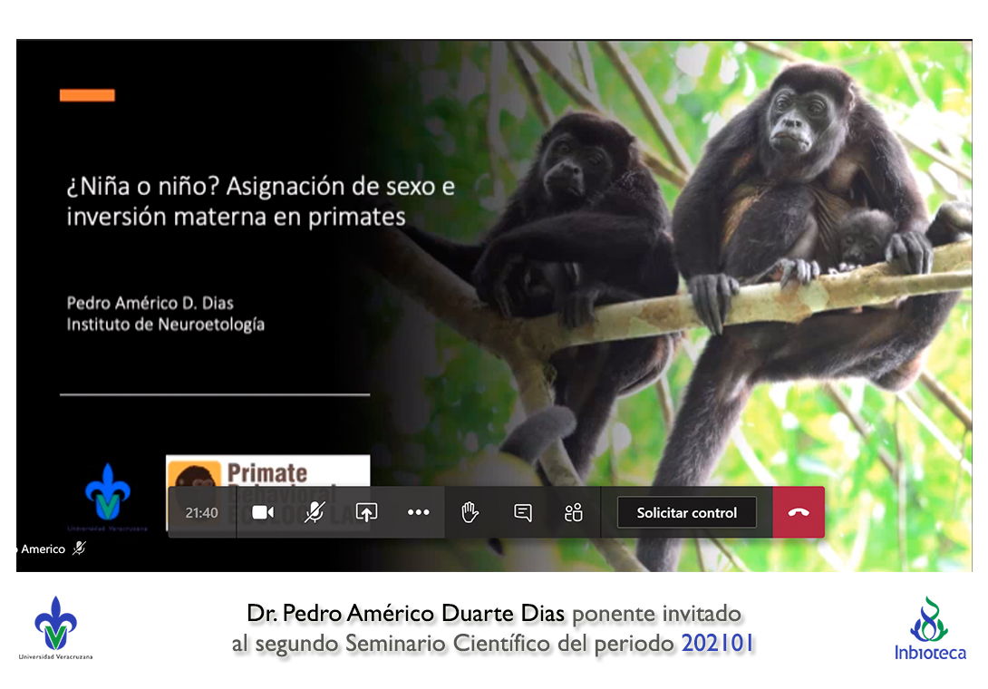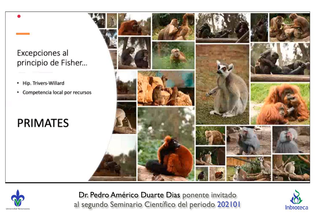 El ponente invitado fue el Dr. Pedro Américo Duarte Dias investigador titular (SNI 2) del Instituto de Neuroetología de la Universidad Veracruzana (UV). La conferencia impartida fue "¿Niña o niño? Asignación de sexo e inversión materna en primates.".
