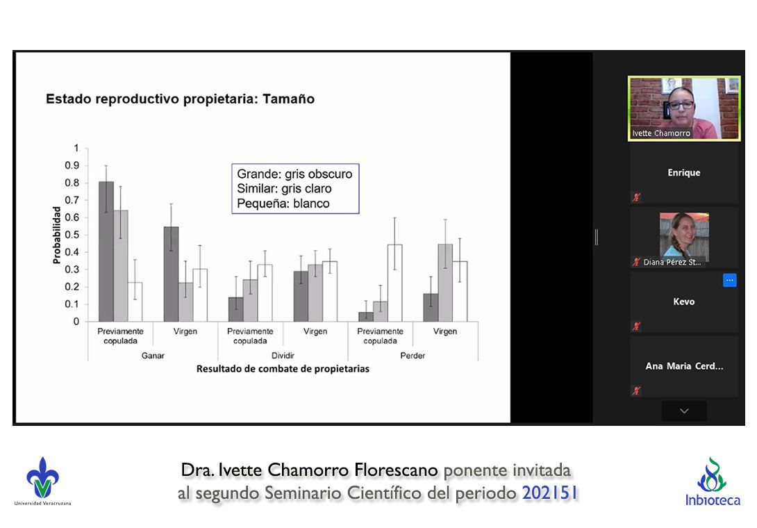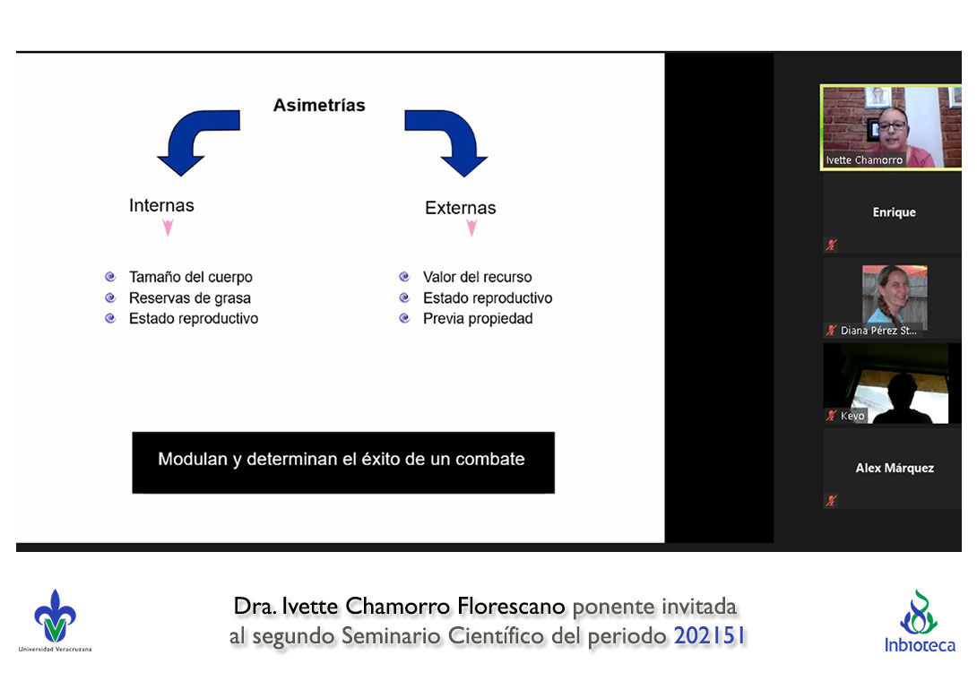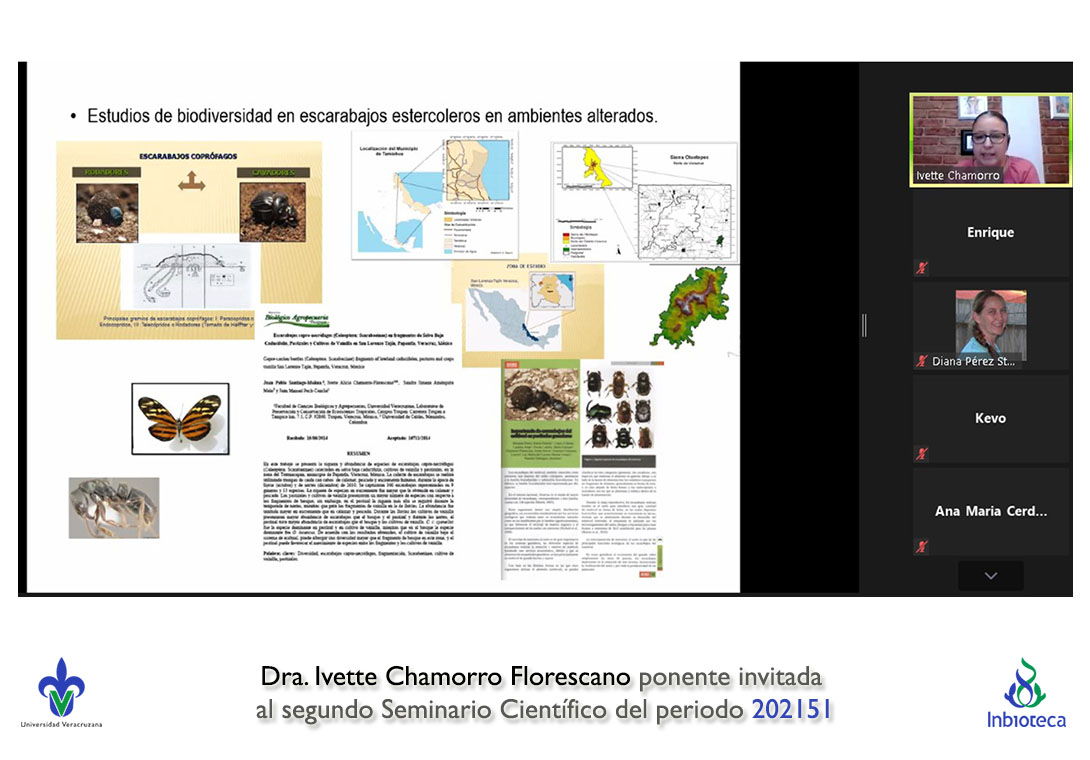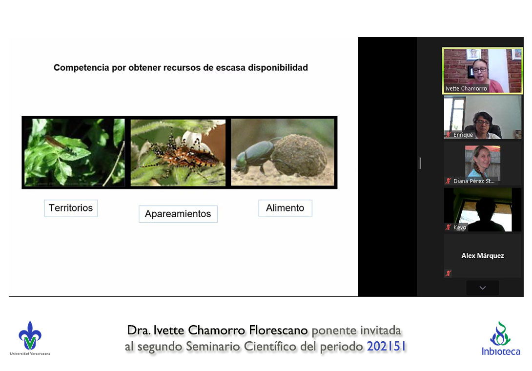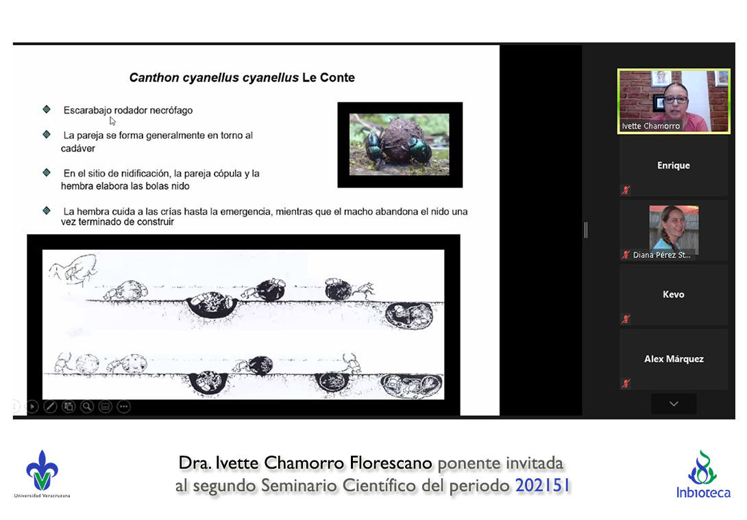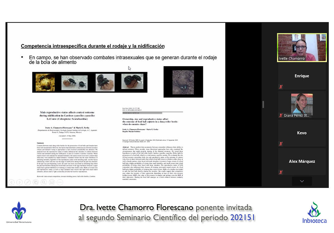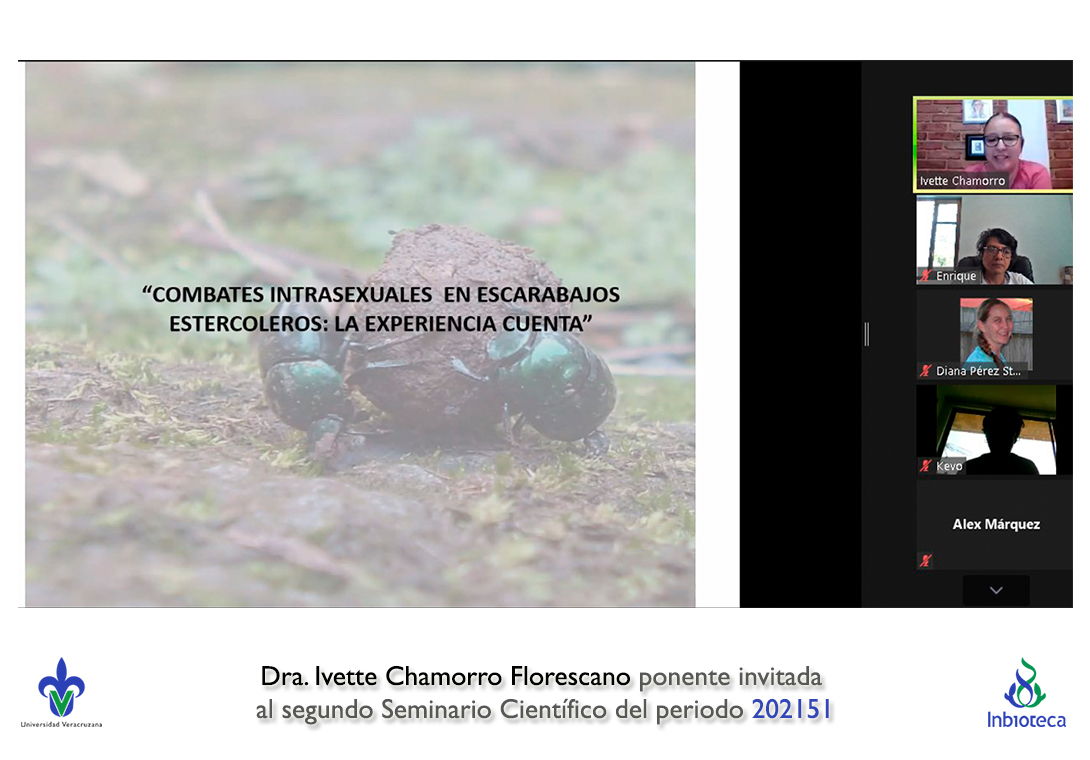 El seminario se realizó con la participación de la Dra. Ivette Chamorro Florescano profesor de la Facultad de Ciencias Biológicas y Agropecuarias Campus Tuxpan de la Universidad Veracruzana. La conferencia se tituló "Competencia intrasexual en escarabajos estercoleros: la experiencia cuenta".
