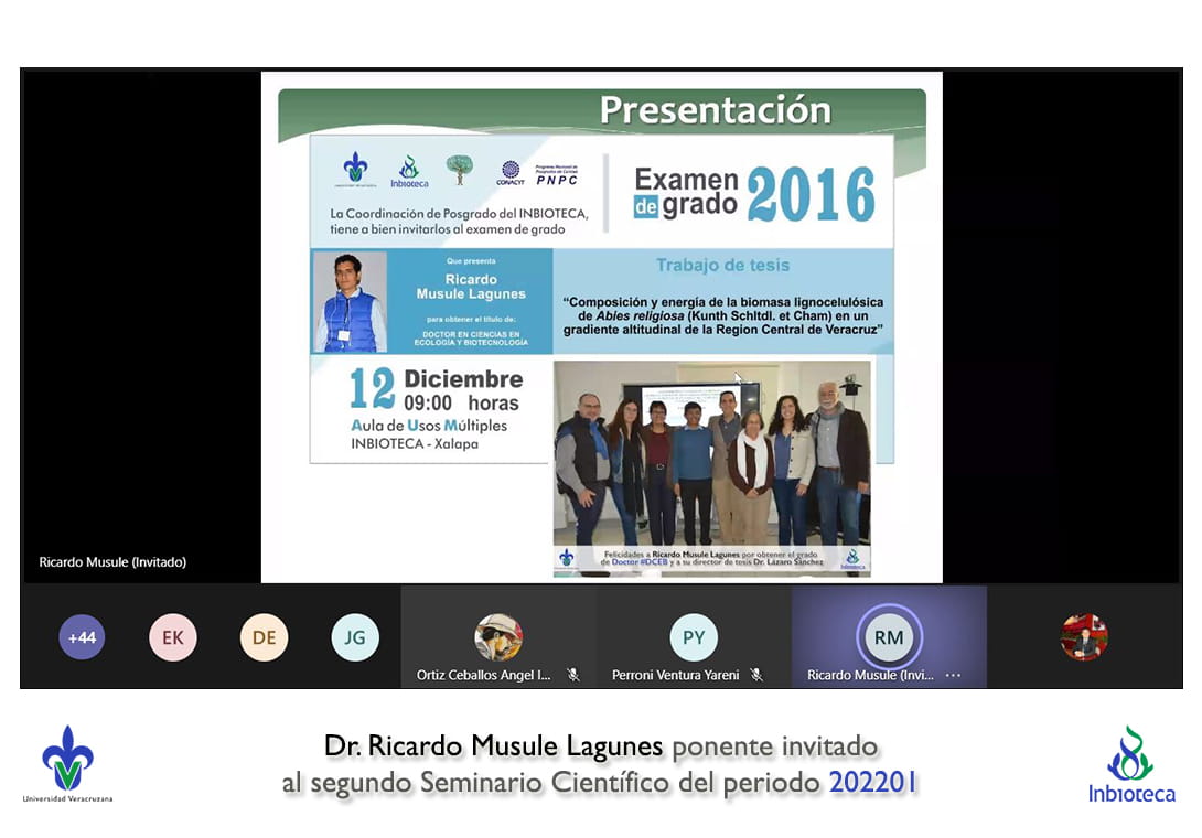 27 de agosto de 2021.- En el "Aula Virtual" del INBIOTECA se realizó el segundo Seminario Científico para los estudiantes del programa de Doctorado en Ciencias en Ecología y Biotecnología (PNPC: Competencia Internacional) del ciclo Seminarios Científicos y Docencia 2021 del Periodo 202201 (agosto 2021 – enero 2022).