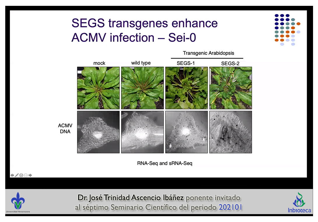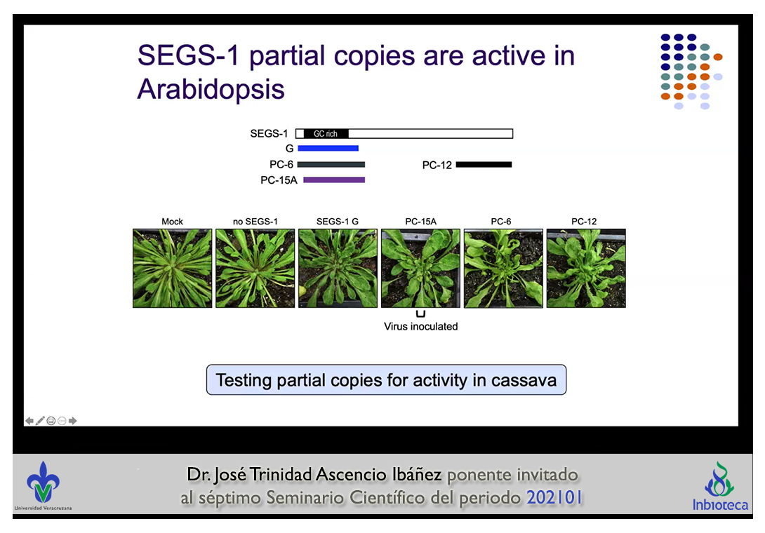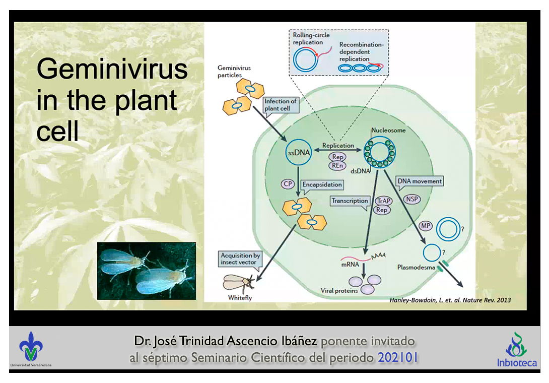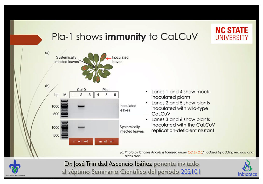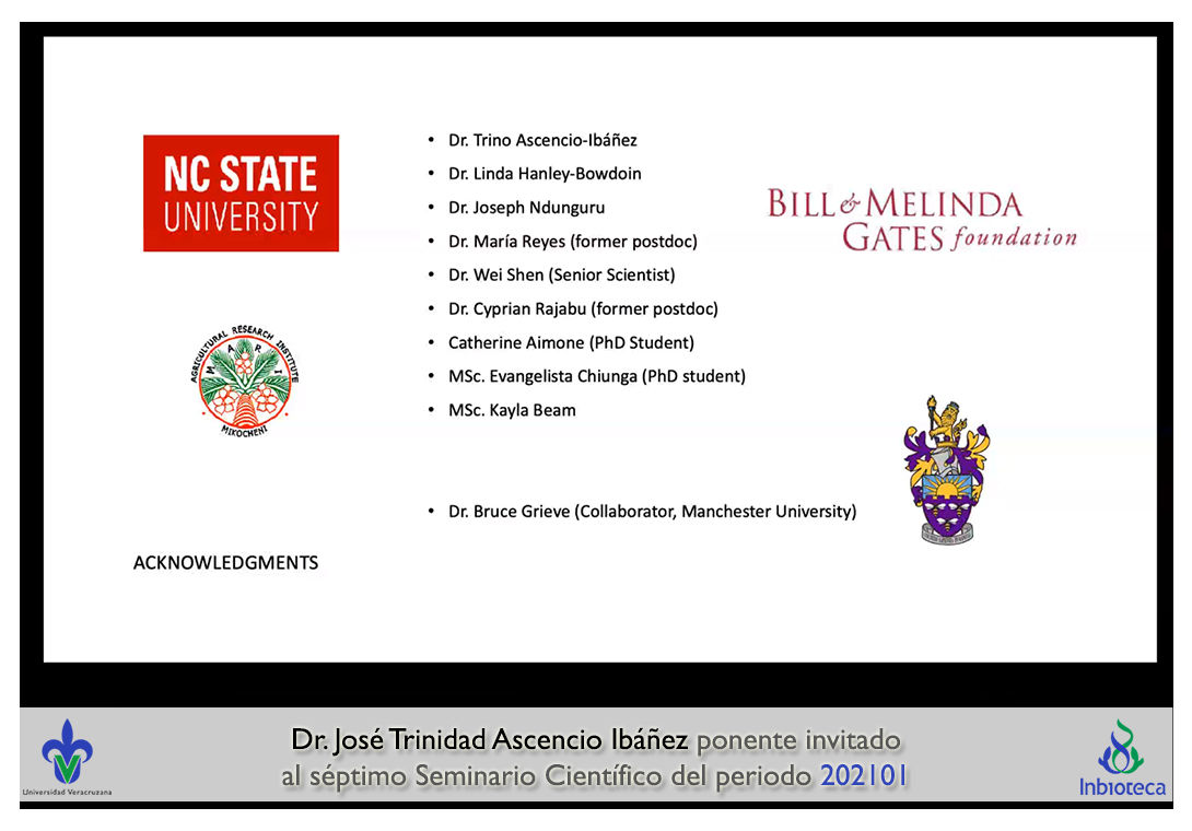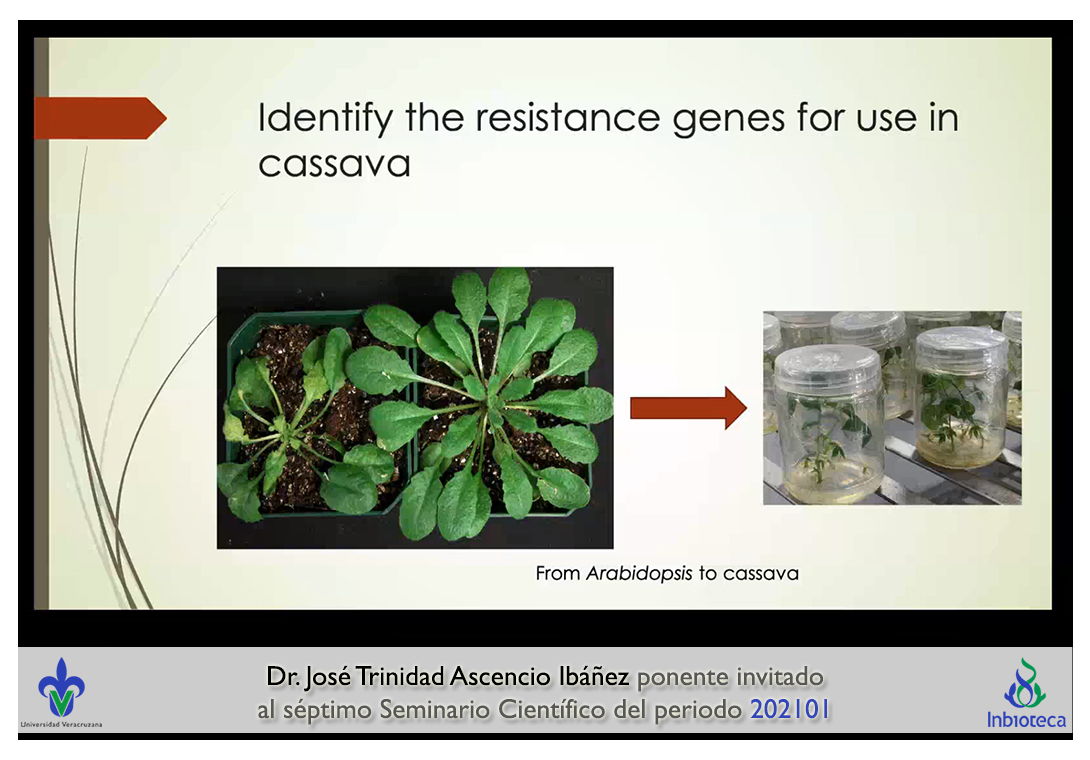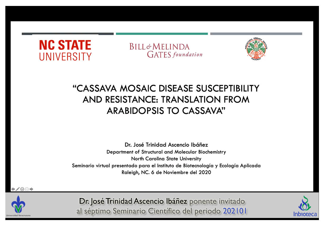 El ponente invitado fue el Dr. José Trinidad Ascencio Ibáñez Investigator en el Department of Molecular and Structural Biochemistry de la North Carolina State University en Carolina del Norte, EU. La conferencia impartida fue "CASSAVA MOSAIC SUSCEPTIBILITY AND RESISTANCE: FROM ARABIDOPSIS TO CASSAVA".