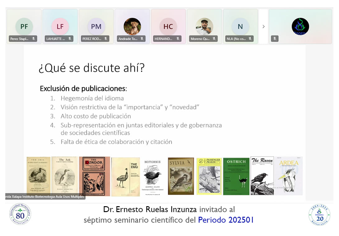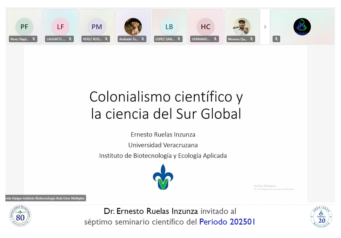 El seminario se desarrolló con la participación del Dr. Ernesto Ruelas Inzunza académico/investigador de tiempo completo adscrito al Instituto de Biotecnología y Ecología Aplicada (INBIOTECA) de la Universidad Veracruzana. La conferencia se tituló: Colonialismo científico y la ciencia del Sur Global.
