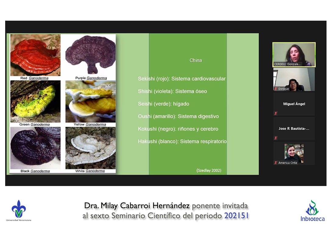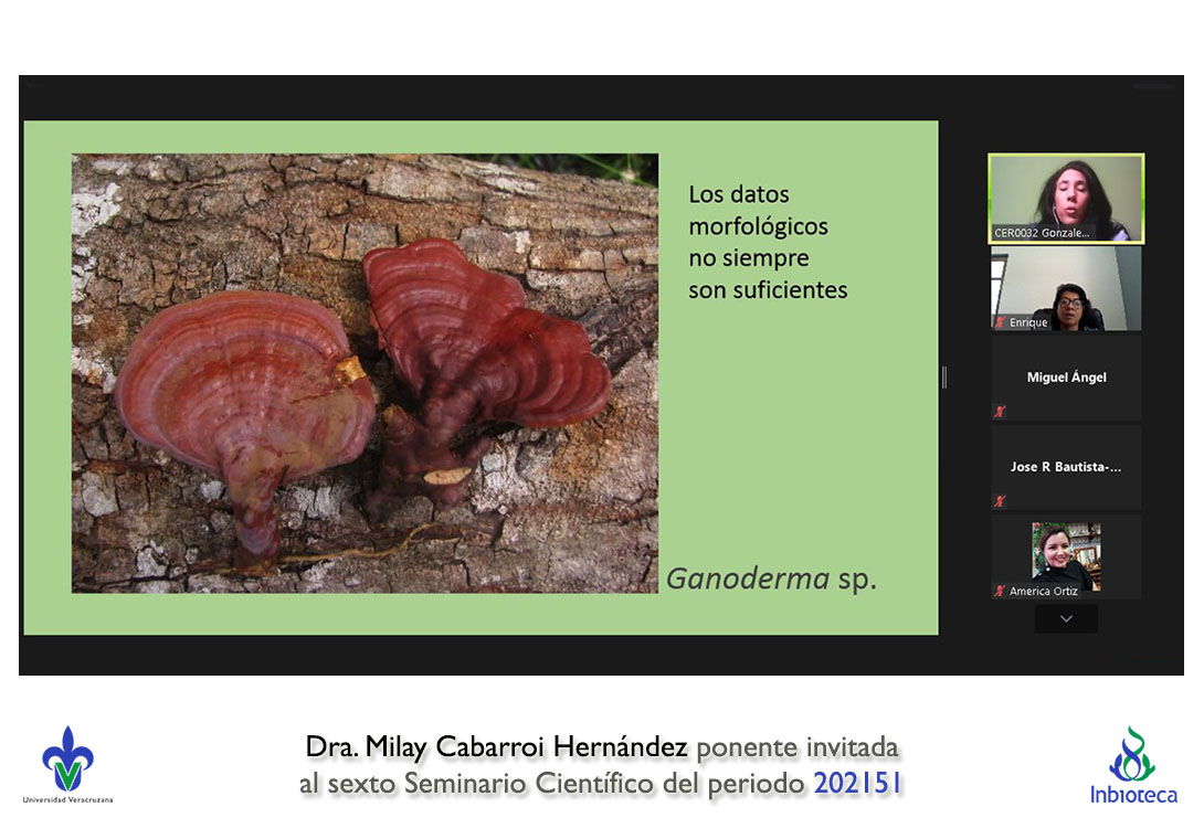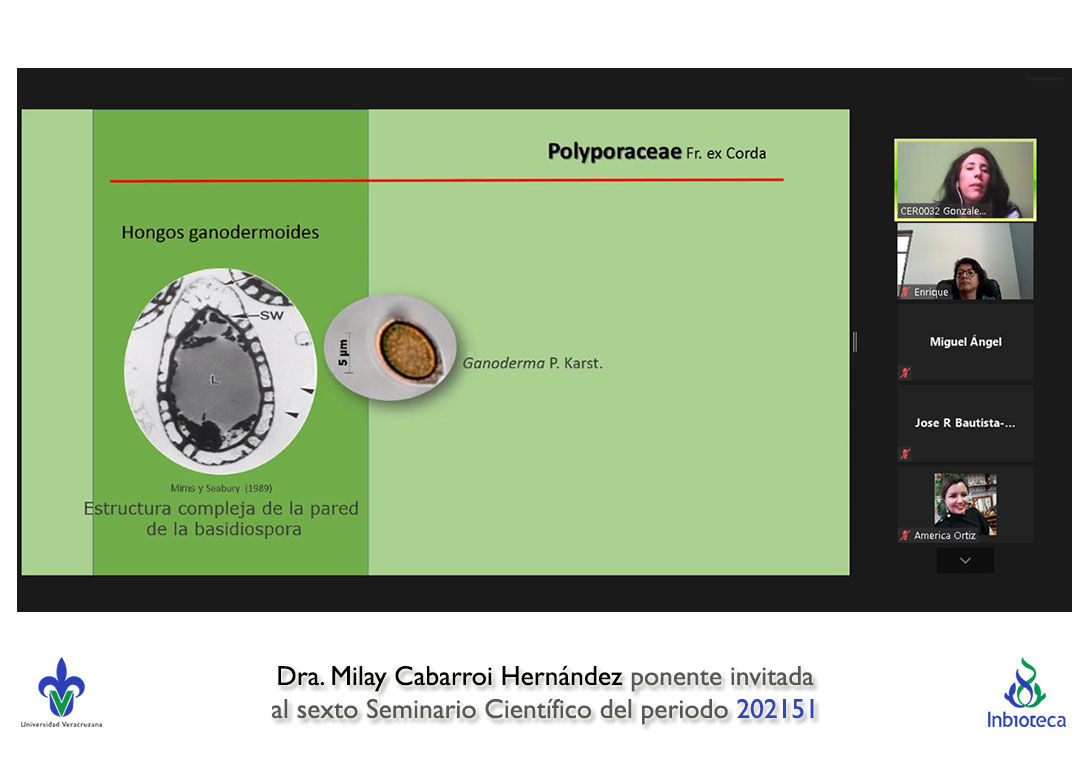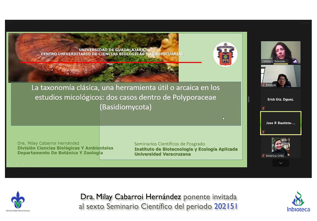 El seminario se realizó con la participación de la Dra. Milay Cabarroi Hernández del Centro Universitario de Ciencias Biológicas y Agropecuarias (CUCBA) de la Universidad de Guadalajara. La conferencia se tituló La taxonomía clásica, una herramienta útil o arcaica en los estudios micológicos: dos casos dentro de Polyporaceae (Basidiomycota).