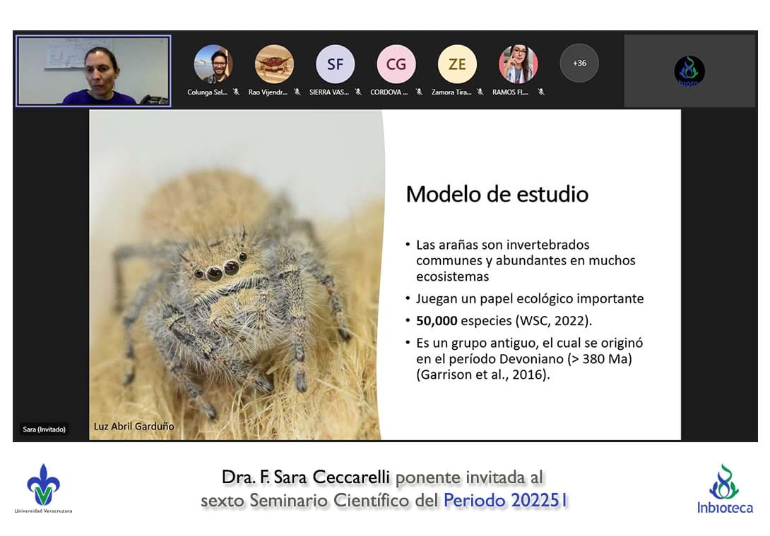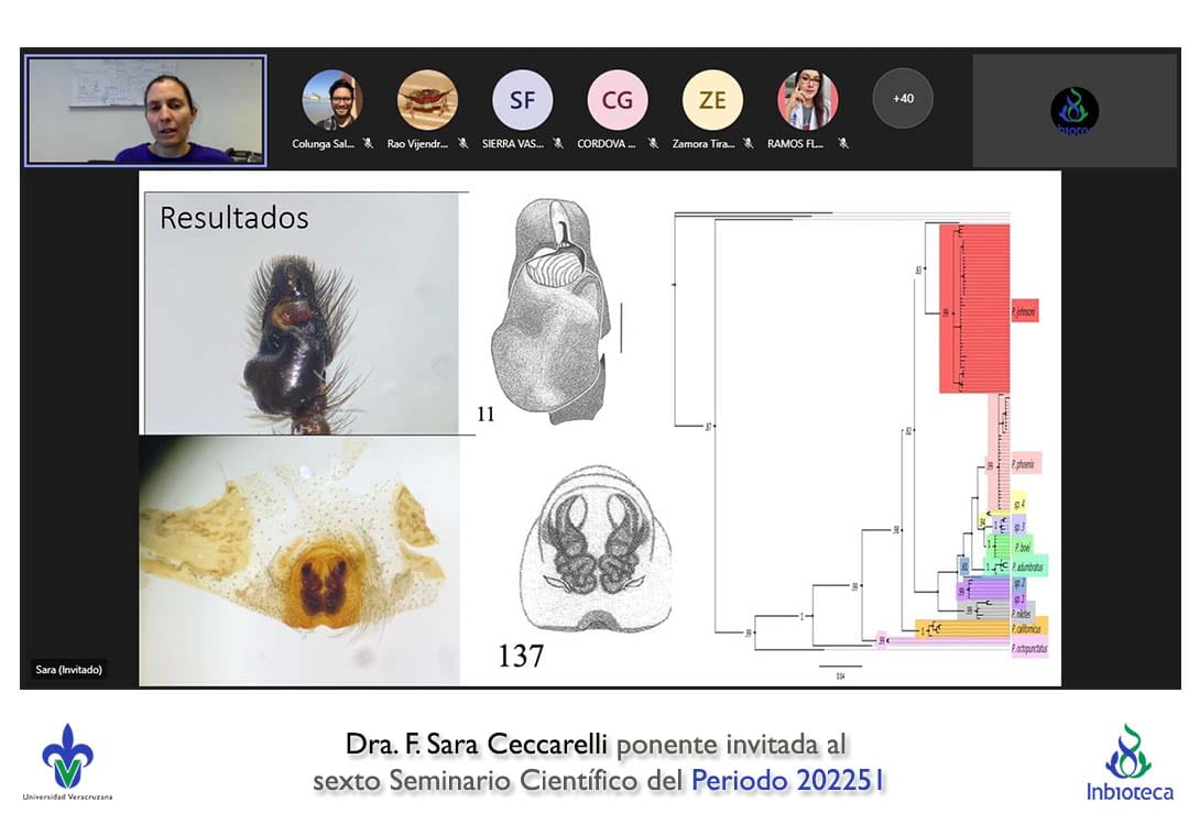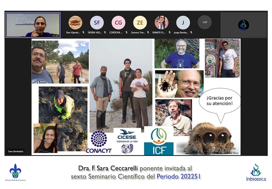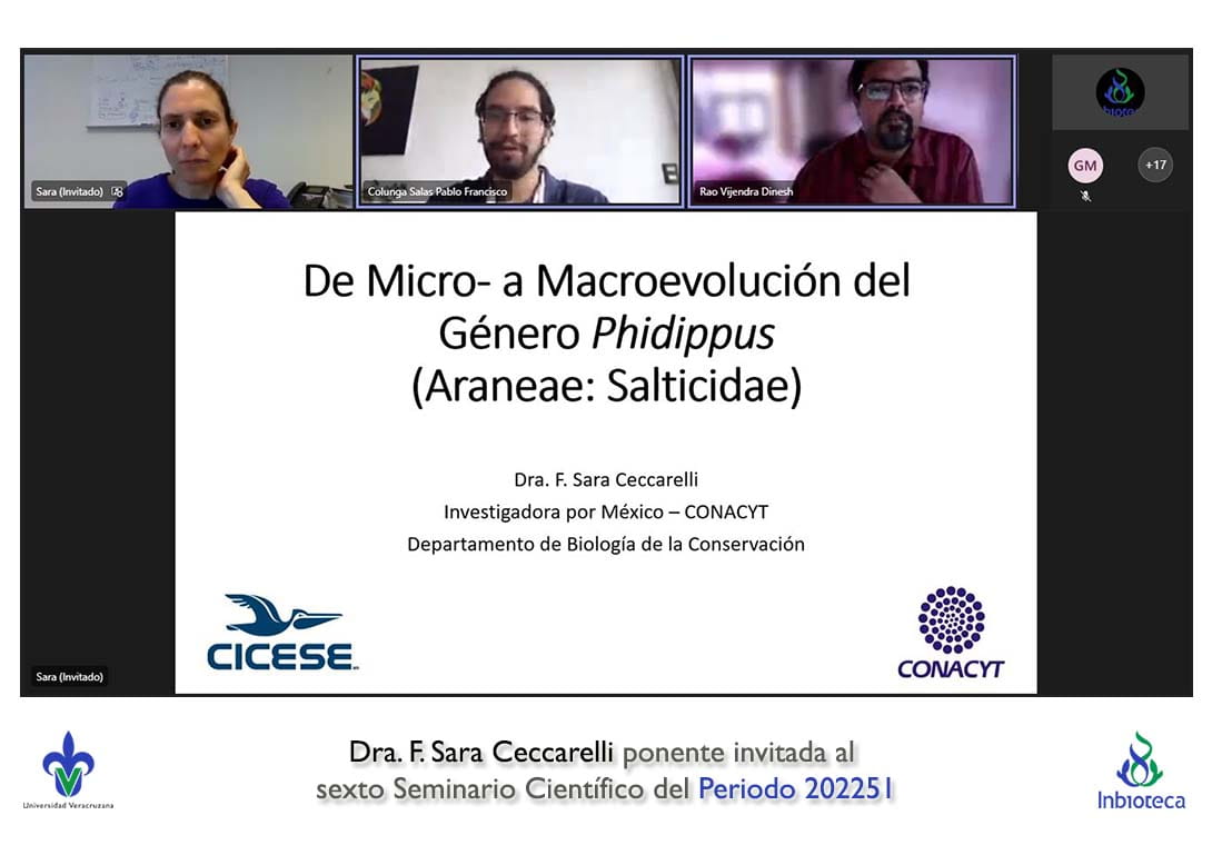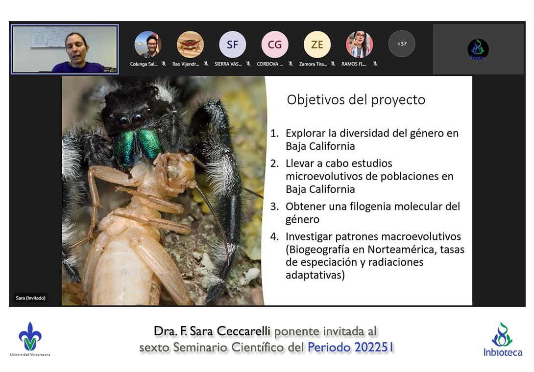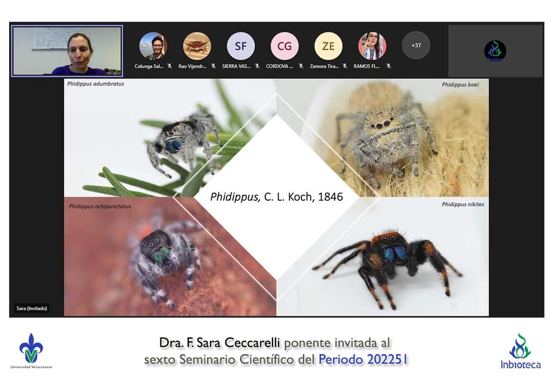 El seminario se desarrolló con la participación de la Dra. Fadia Sara Ceccarelli Investigador por Catedra de CONACYT en el Departmento de Biología de la Conservación de la Centro de Investigación Científica y de Educación Superior de Ensenada, Baja California. La conferencia se tituló: De Micro- a Macroevolución del Género Phidippus (Araneae: Salticidae).