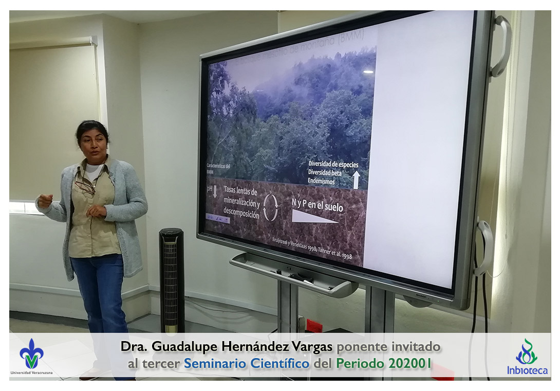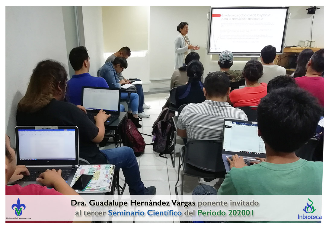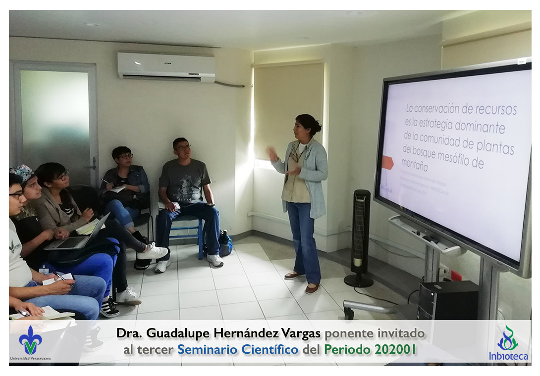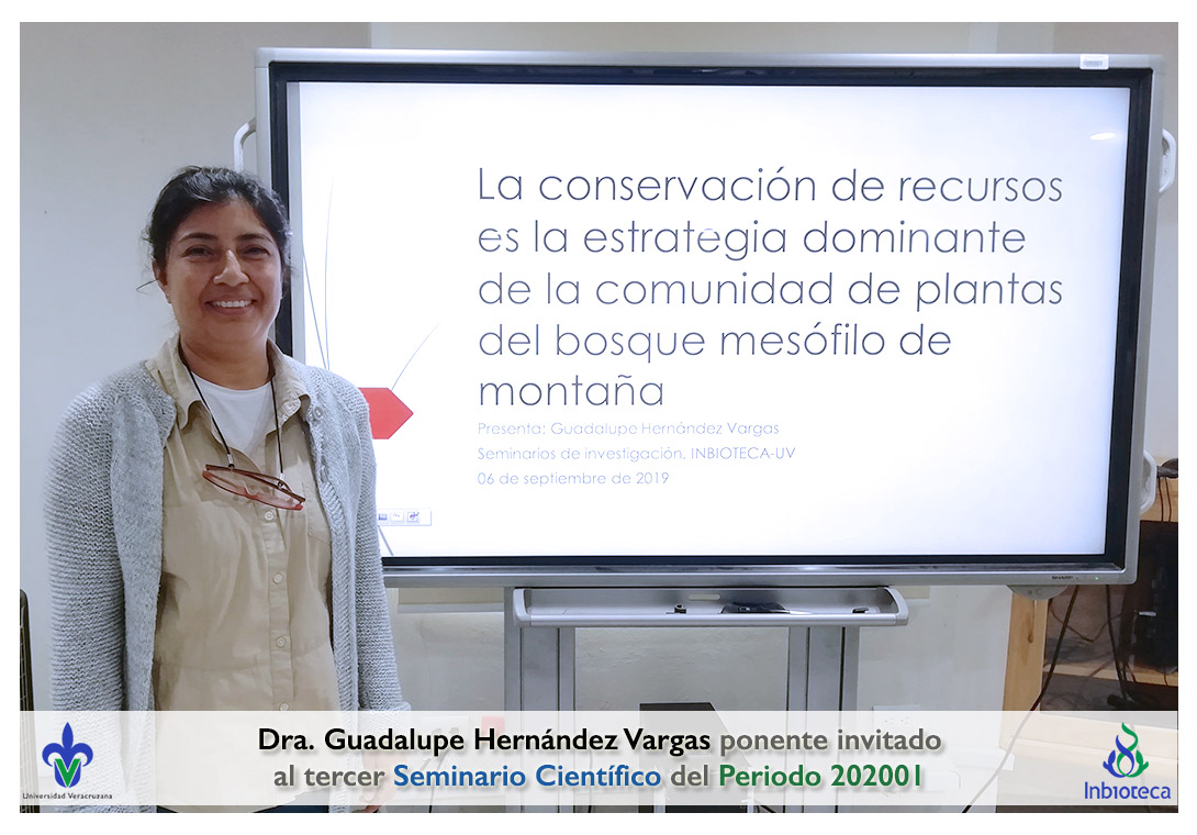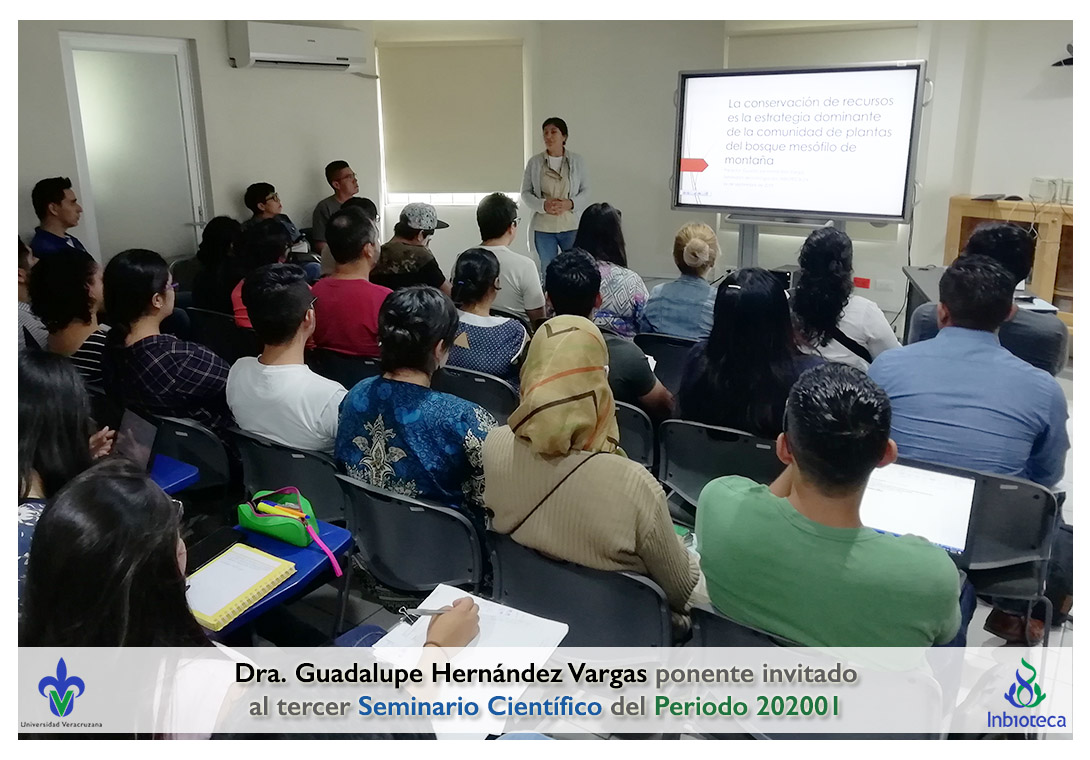 La ponente invitado fue la Dra. Guadalupe Hernández Vargas Becaria SNI del Instituto de Biotecnología y Ecología Aplicada de la Universidad Veracruzana. La conferencia impartida fue "Conservar los recursos es la estrategia ecológica dominante de las plantas en el bosque mesófilo de montaña".